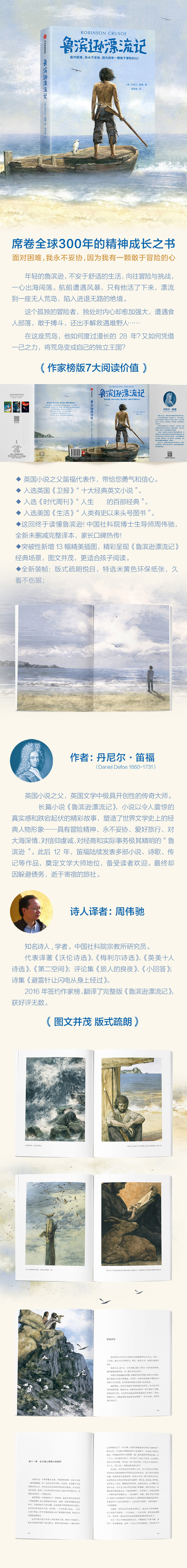 ◆《鲁滨逊漂流记》是一部包含每个人生活的寓言。孩童时期,这本书只是读来有趣,成年之后再读,就会知道这是不朽的杰作。——艾伦(英国文学史家)