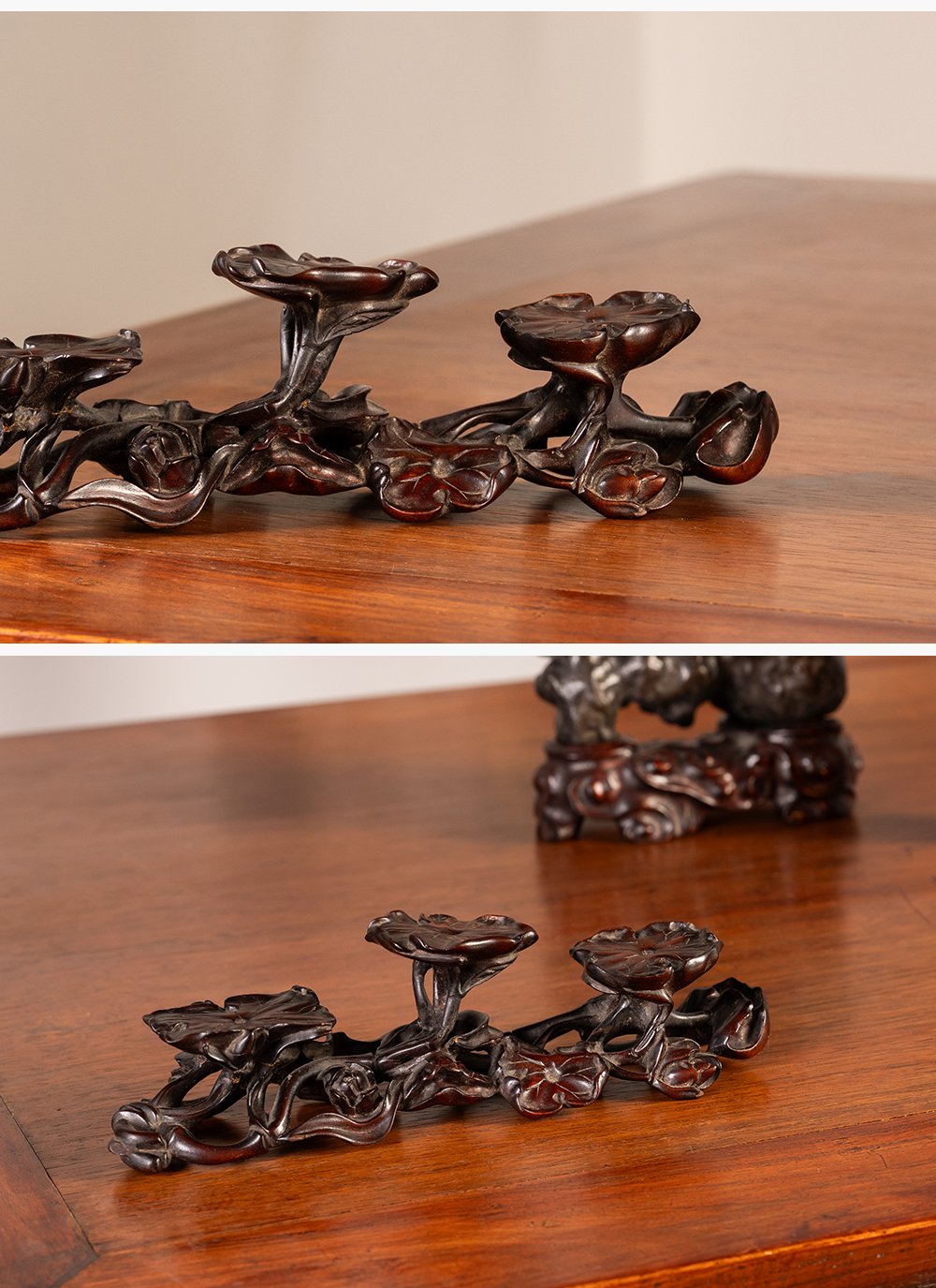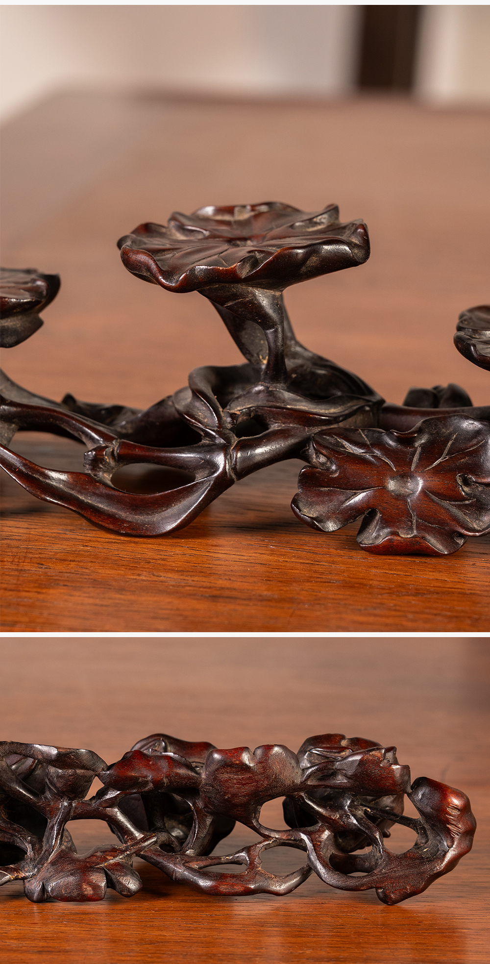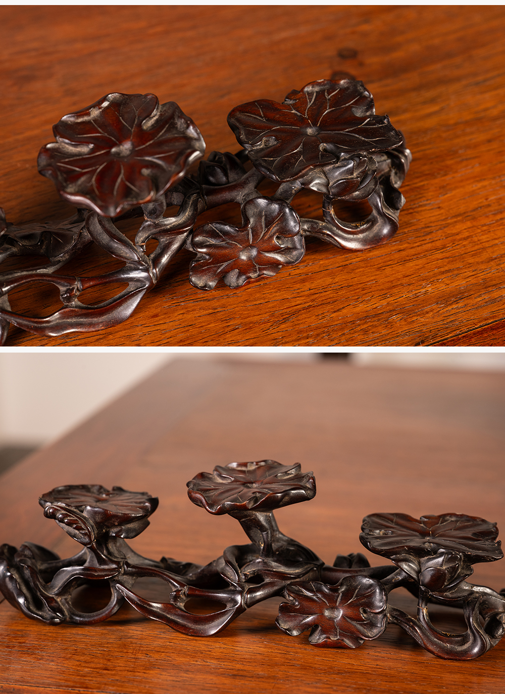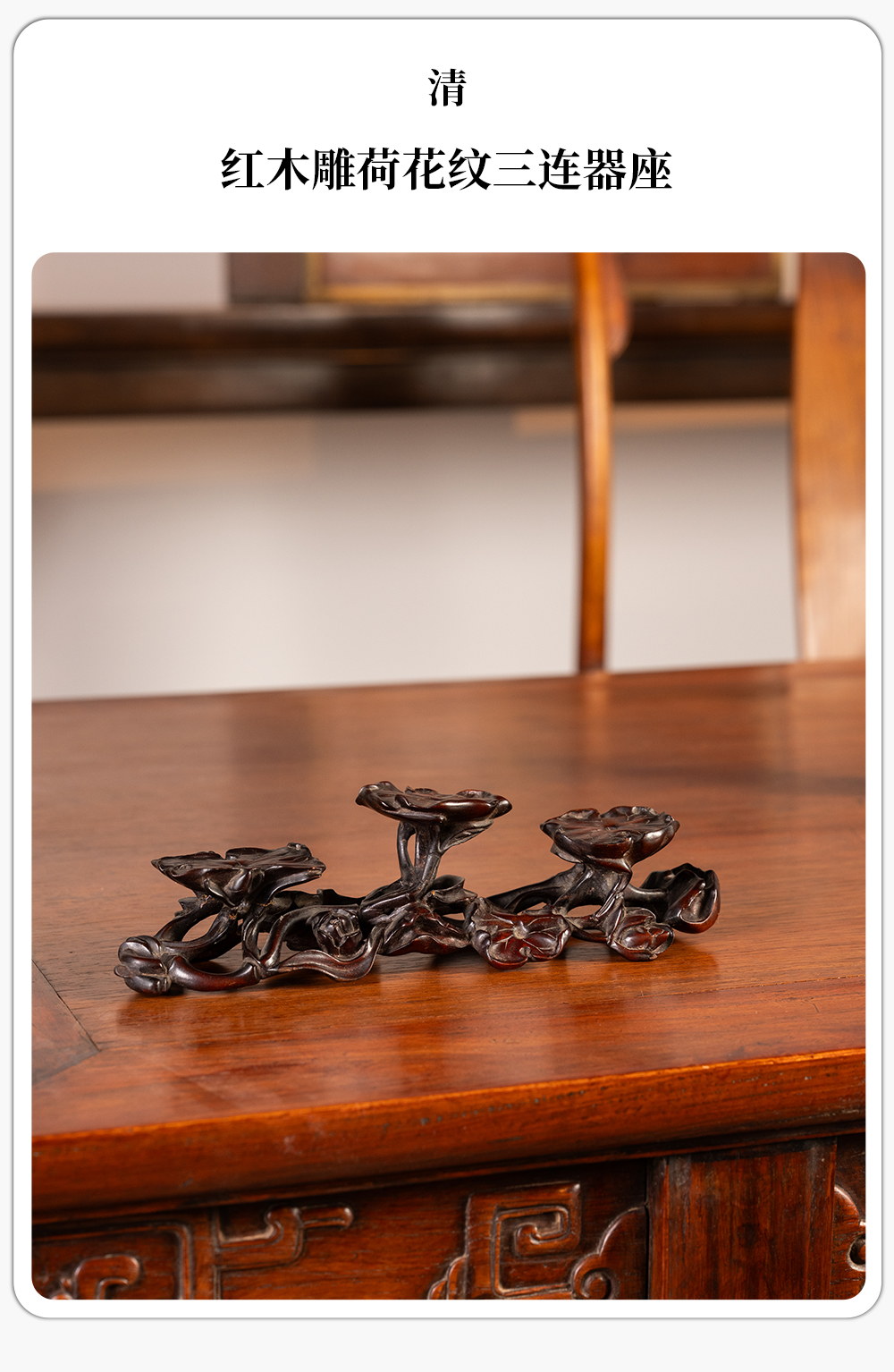 清 红木雕荷花纹三连器座