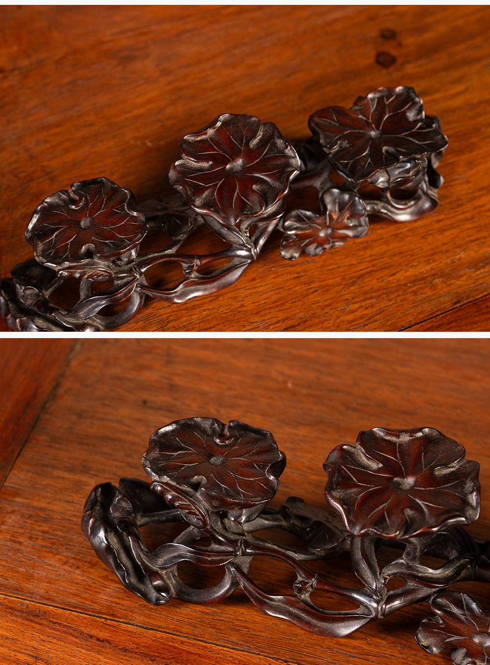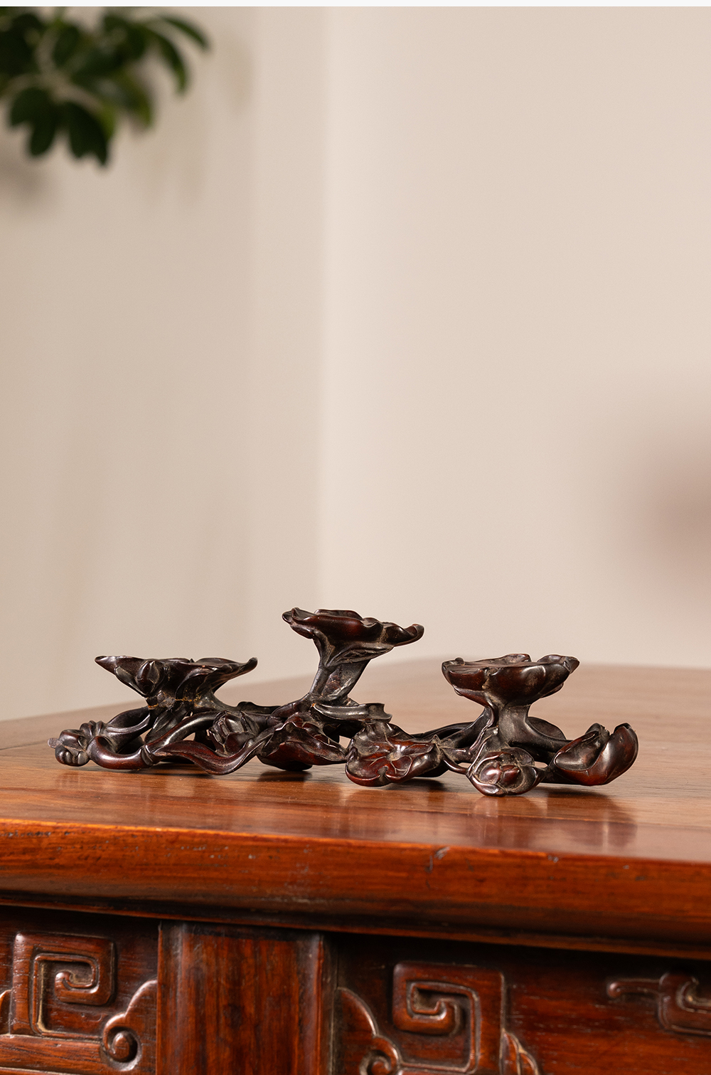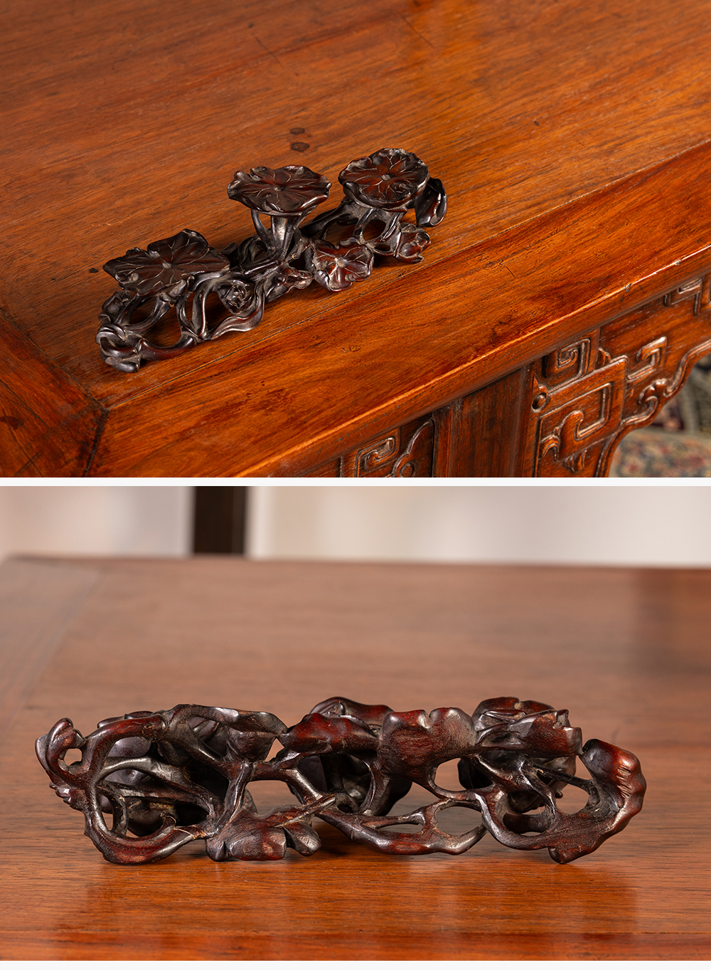 清 红木雕荷花纹三连器座