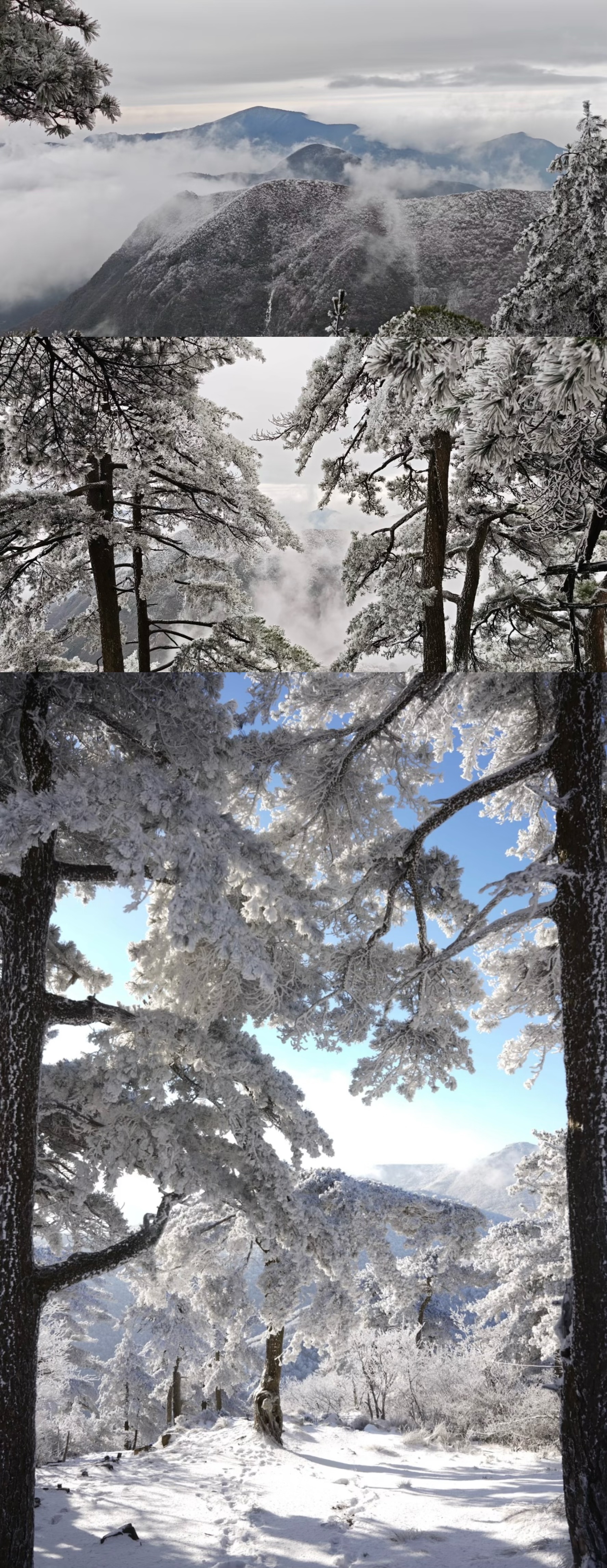 当城市还在等待初雪,海拔千米的桐杭岗早已银装素裹。雾凇压枝,冰雪覆径,每一步都踩碎晶莹的光
