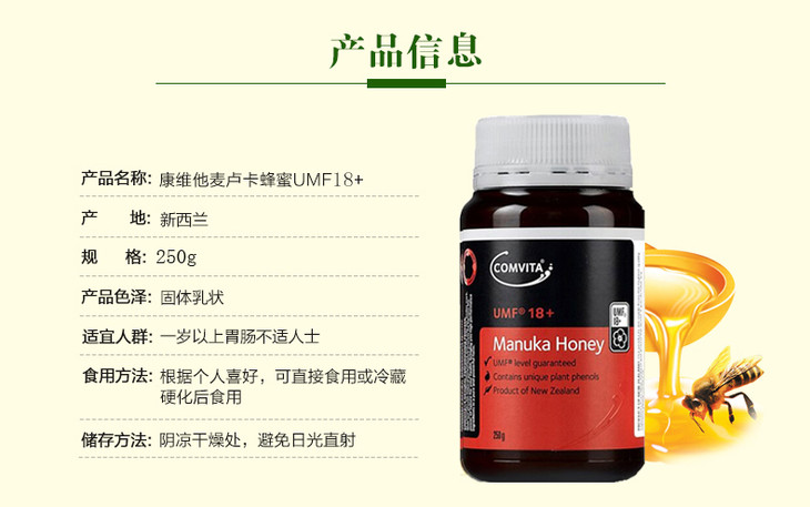 新西兰进口comvita康维他18+250g麦卢卡蜂蜜纯天然野生进口蜂蜜