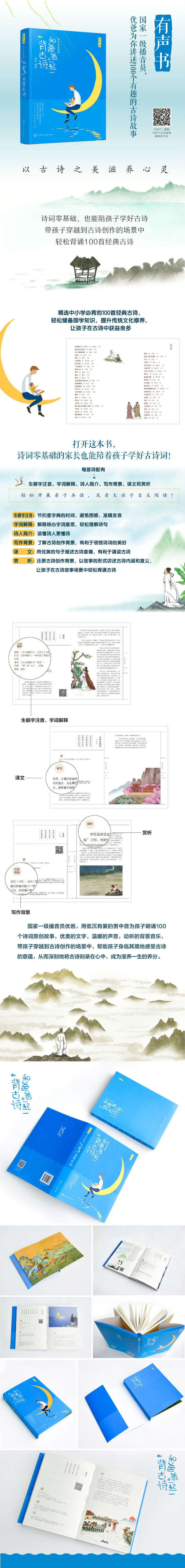《和爸爸一起背古诗》选取了100首经典古诗,其中大部分是中小学语文书上的必学古诗。本书根据诗人的生平故事、创作背景和古诗意境等,以“让孩子的成长路上有诗和远方”为主线,创作了100个诗词故事,仿佛闭上眼就能穿越千年,和古人进行一次语言、心灵的交流,让读者不但“背得轻松”,而且“懂得容易”,从而更好地理解古诗的内涵。 读者通过扫描书中每一首诗的二维码“听,见经典”,就能听到国家一级播音员——优爸为你讲解每一首古诗,他低沉温暖的男中音,配上中国古典音乐,古诗的韵律和意境之美自然而然地融入心中,让古人的情怀和智慧滋养心灵。