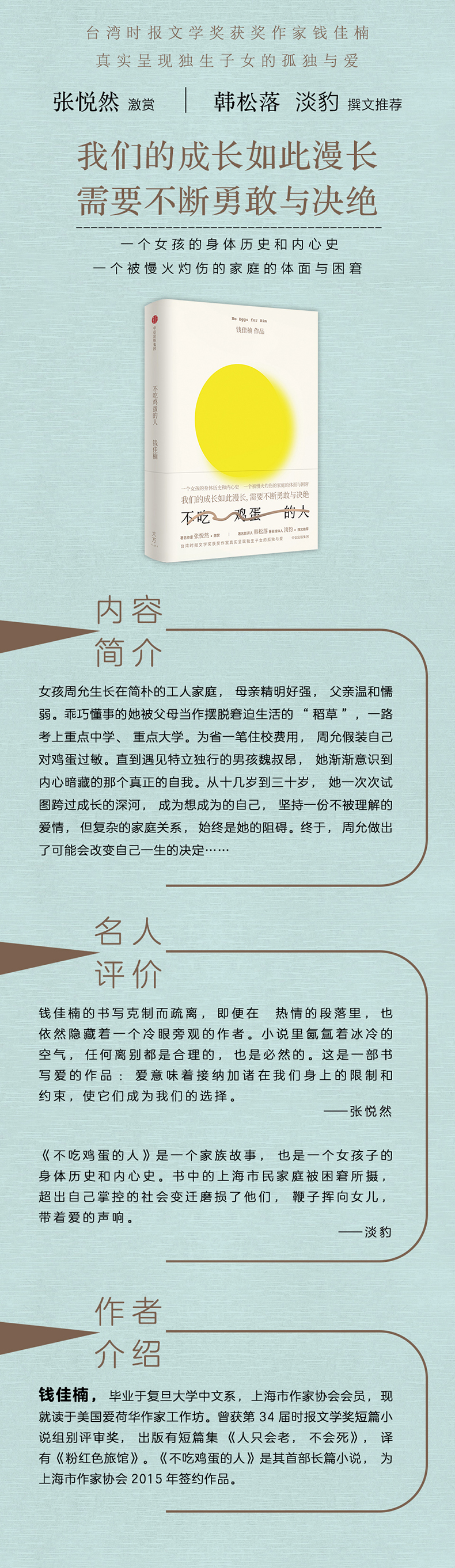 钱佳楠,毕业于复旦大学中文系,上海市作家协会会员,现就读于美国爱荷华作家工作坊。曾获第34届时报文学奖短篇小说组别评审奖,出版有短篇集《人只会老,不会死》,译有《粉红色旅馆》。《不吃鸡蛋的人》是其个人首部长篇小说,为2015年上海市作家协会签约作品。