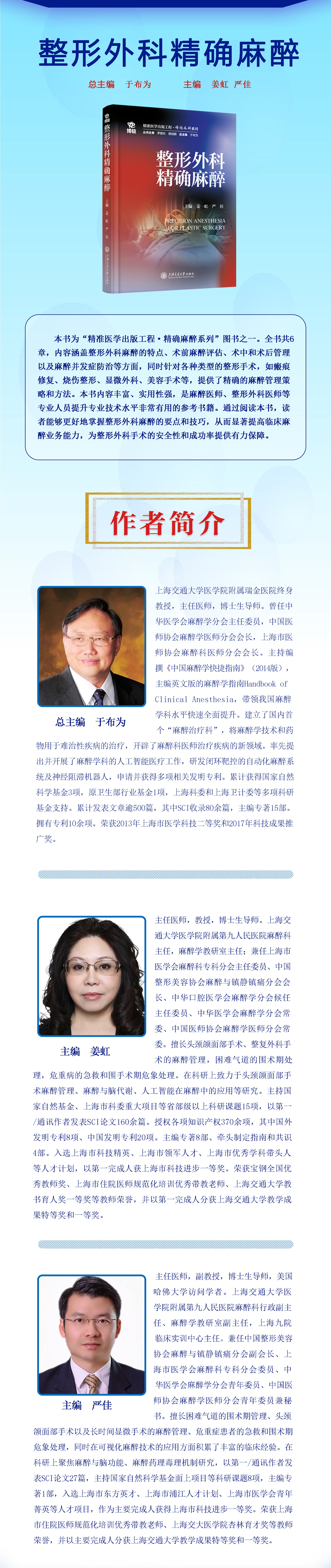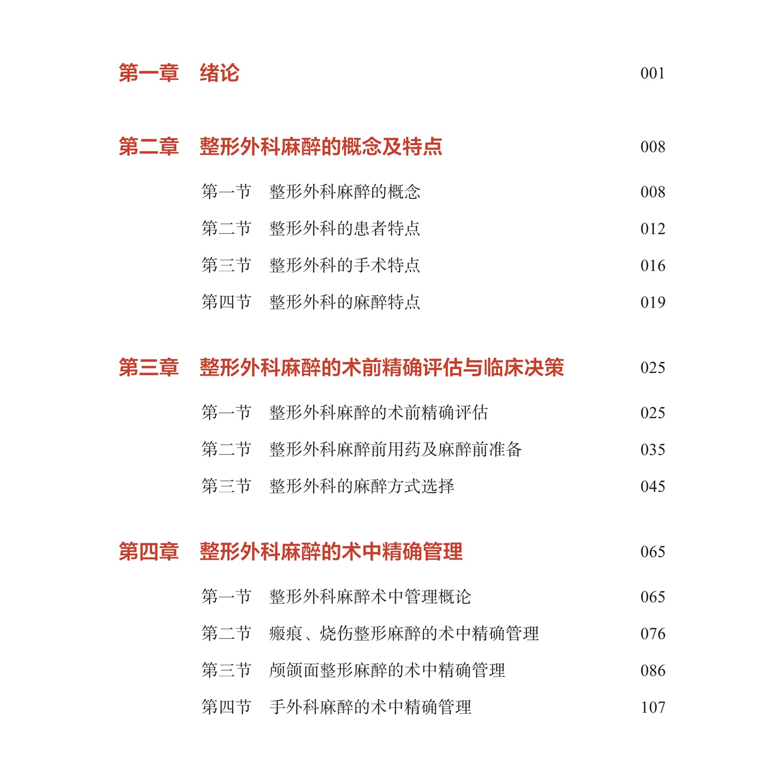 本书为“精准医学出版工程·精确麻醉系列”图书之一。全书共6章,内容涵盖整形外科麻醉的特点、术前麻醉评估、术中和术后管理以及麻醉并发症防治等方面,同时针对各种类型的整形手术,如瘢痕修复、烧伤整形、显微外科、美容手术等,提供了精确的麻醉管理策略和方法。本书内容丰富、实用性强,是麻醉医师、整形外科医师等专业人员提升专业技术水平非常有用的参考书籍。通过阅读本书,读者能够更好地掌握整形外科麻醉的要点和技巧,从而显著提高临床麻醉业务能力,为整形外科手术的安全性和成功率提供有力保障。