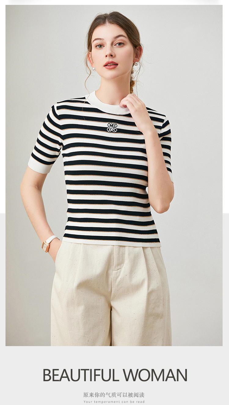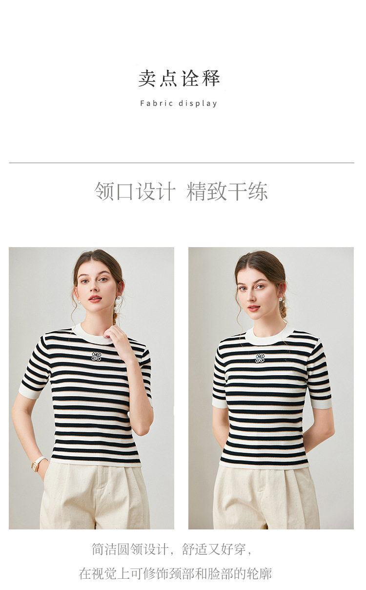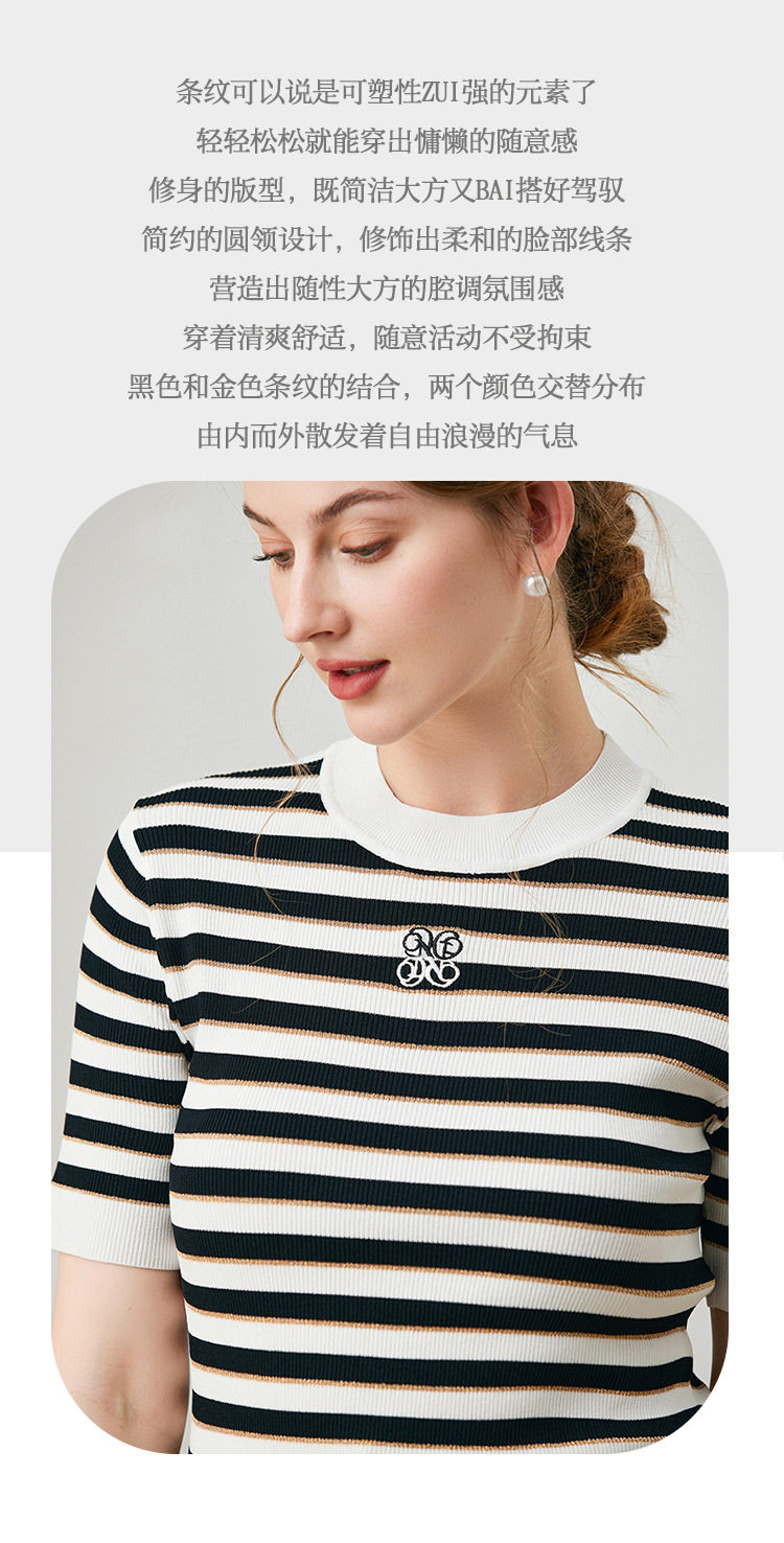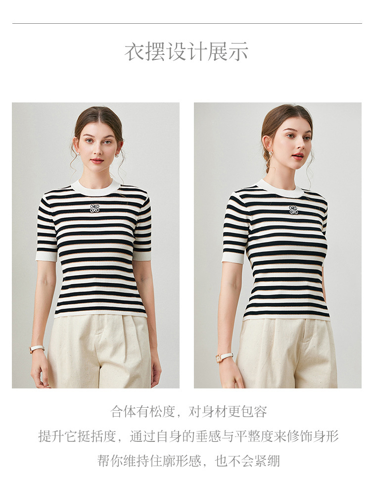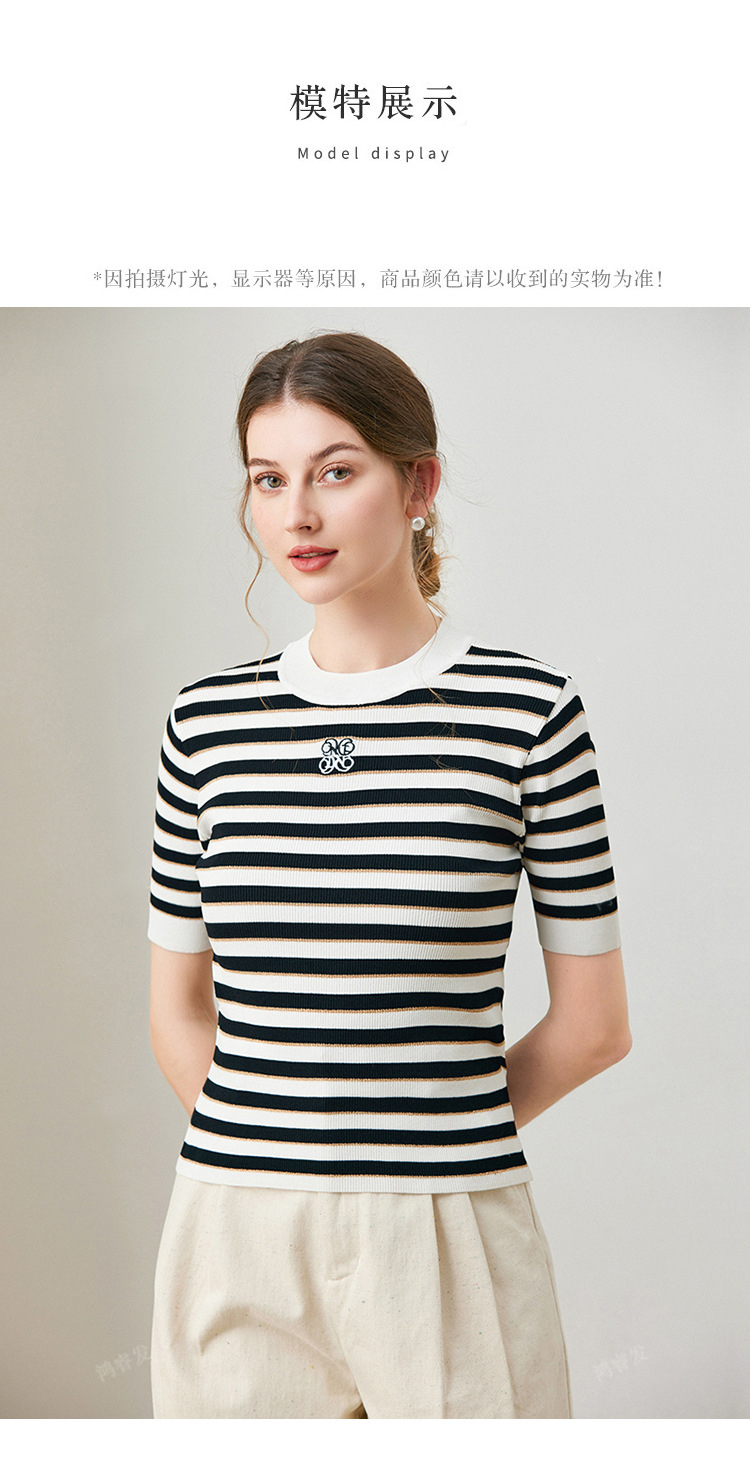 【自】全新升级【铂金会员247/天猫329/差价82】(01323) 洛诗琳冰丝针织衫女2025夏季显瘦圆领气质条纹t恤上衣女
