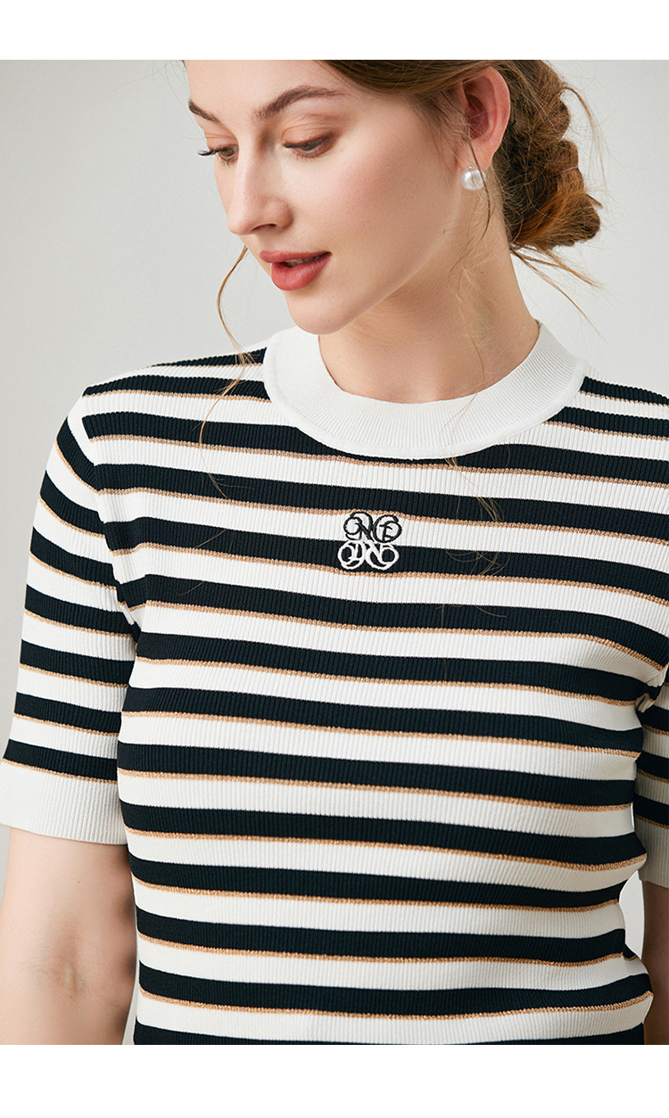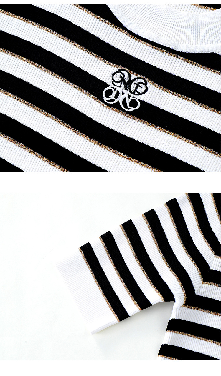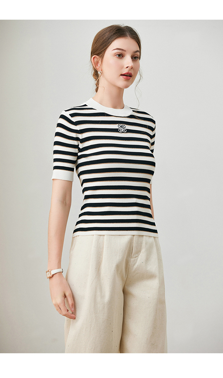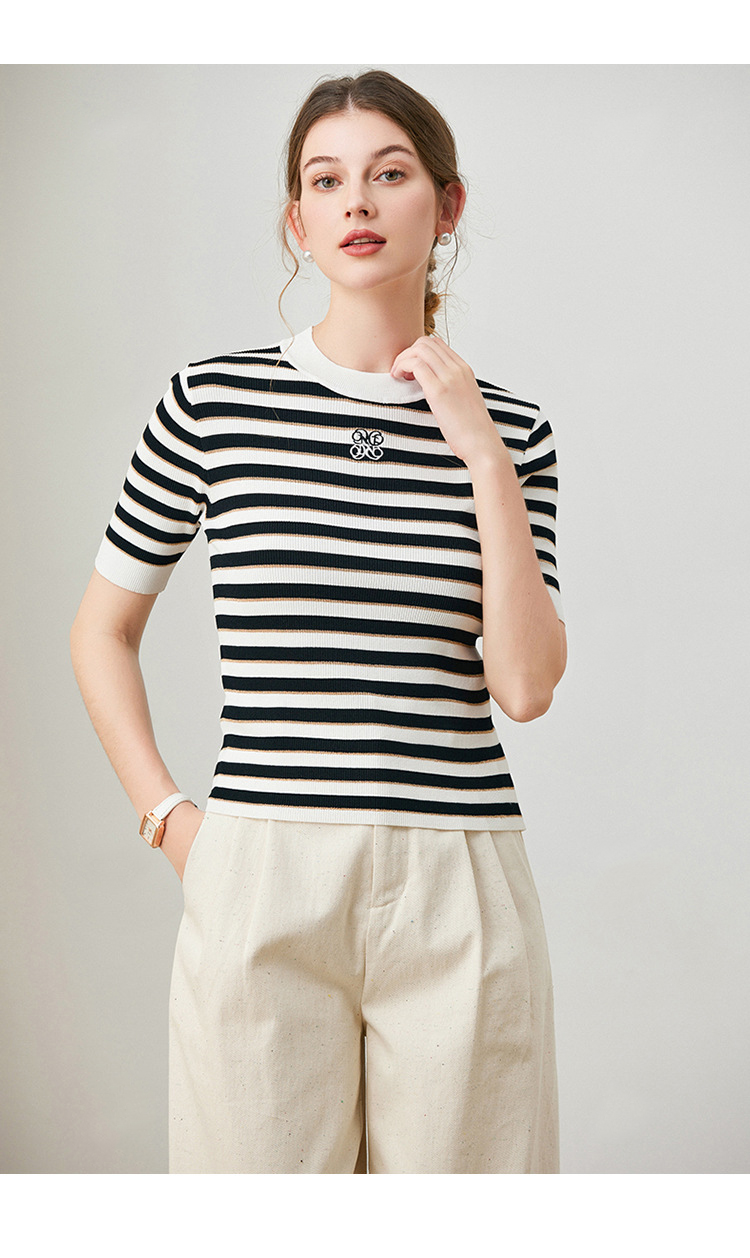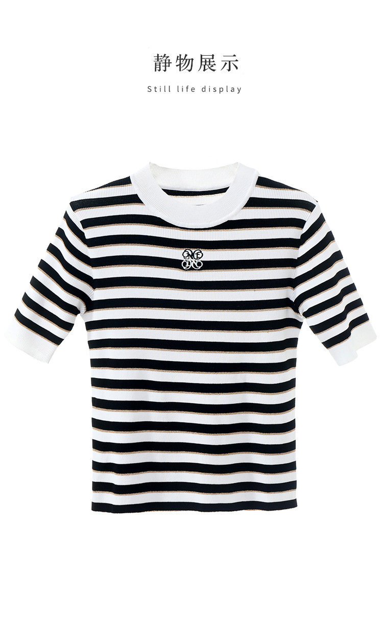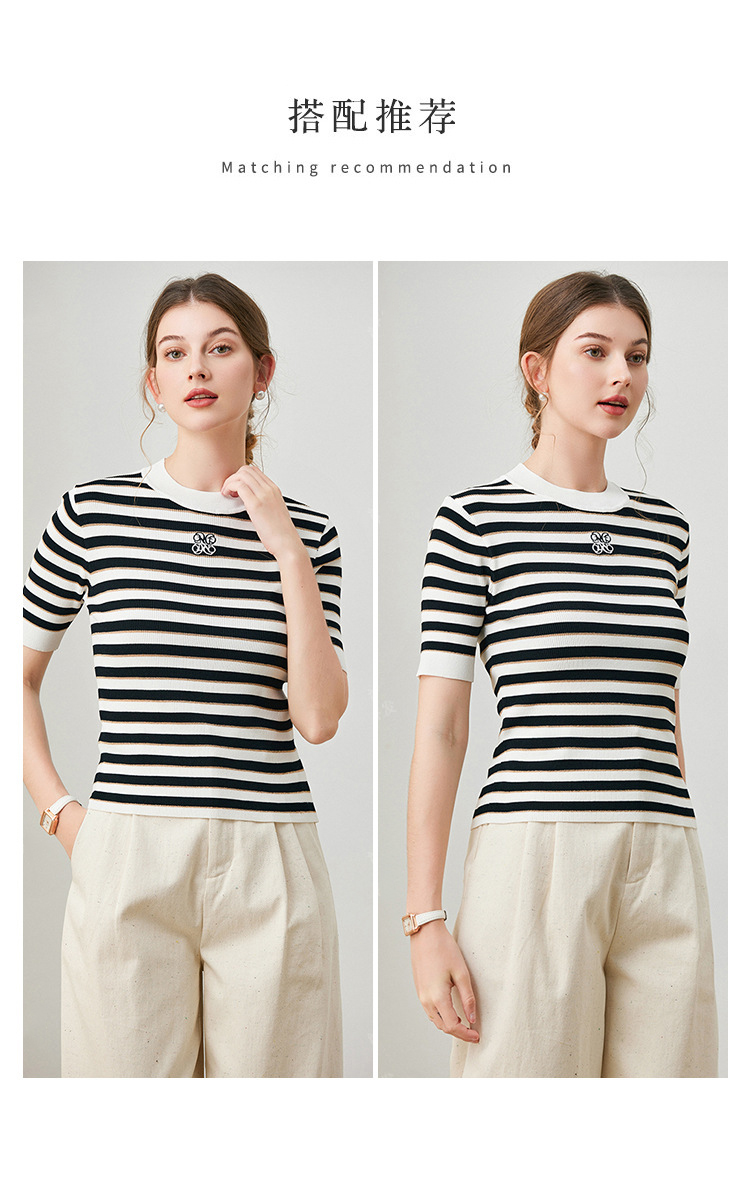 【自】全新升级【铂金会员247/天猫329/差价82】(01323) 洛诗琳冰丝针织衫女2025夏季显瘦圆领气质条纹t恤上衣女