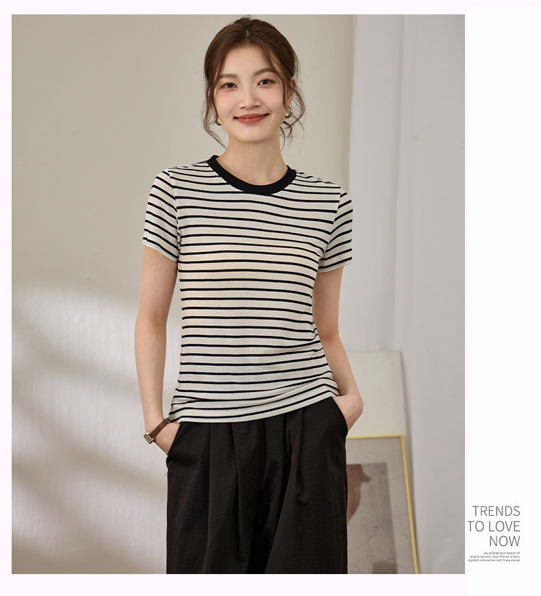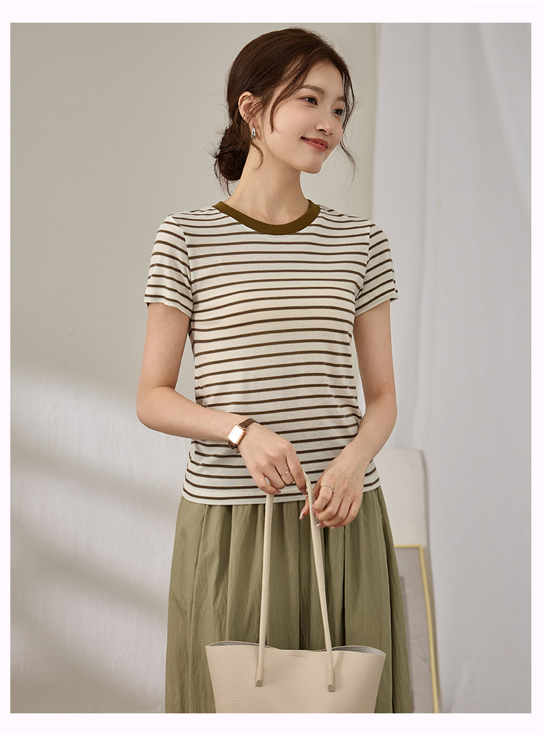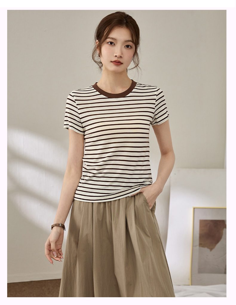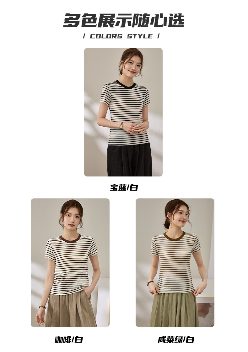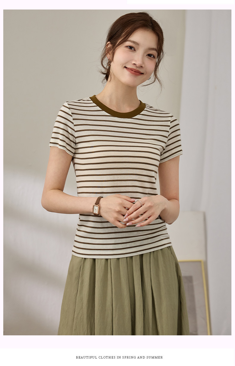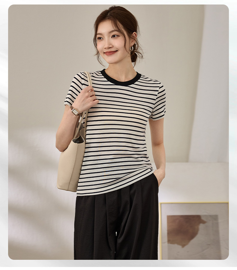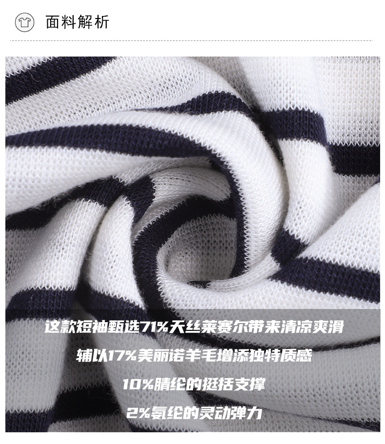 百媚生 天丝羊毛条纹圆领短袖女t恤16882