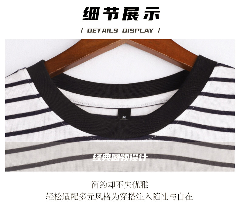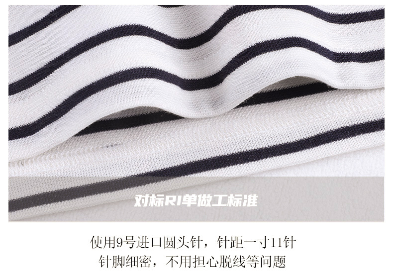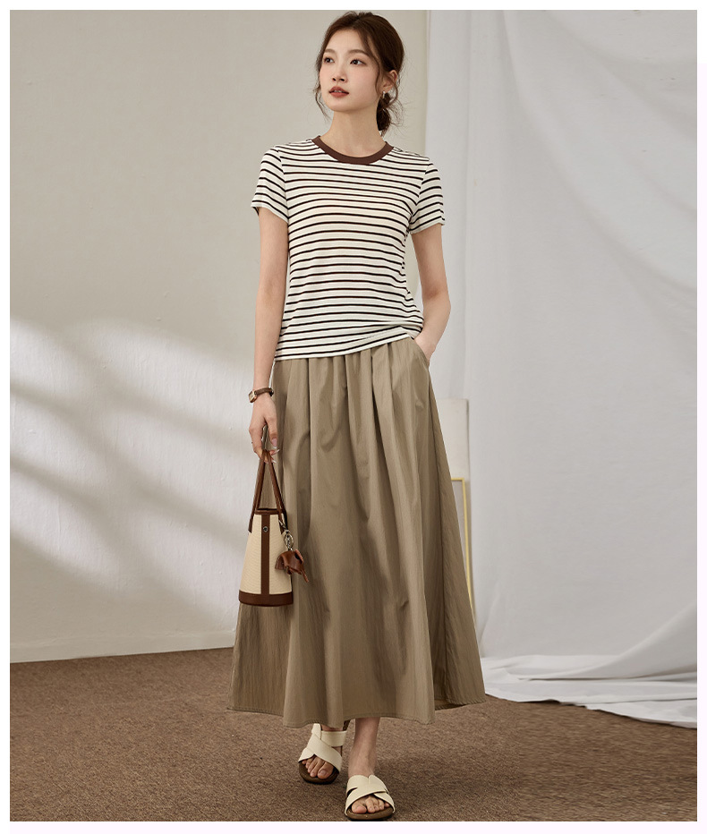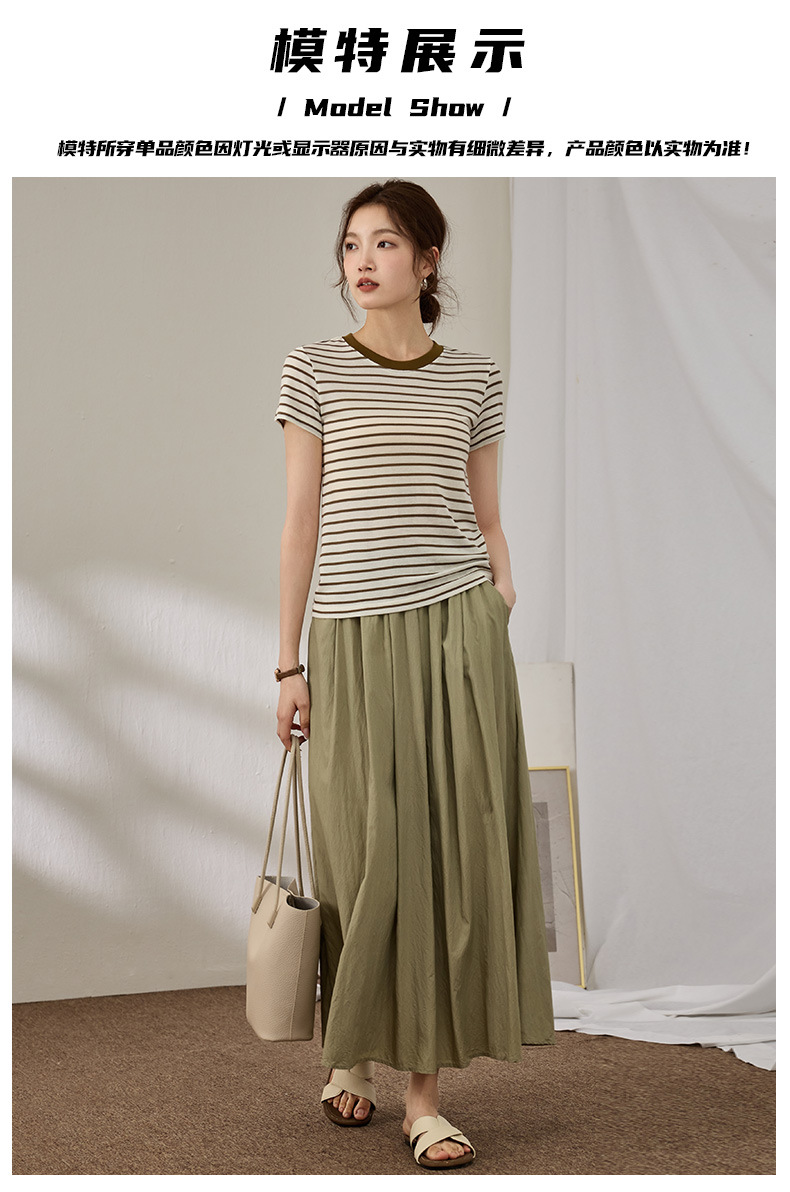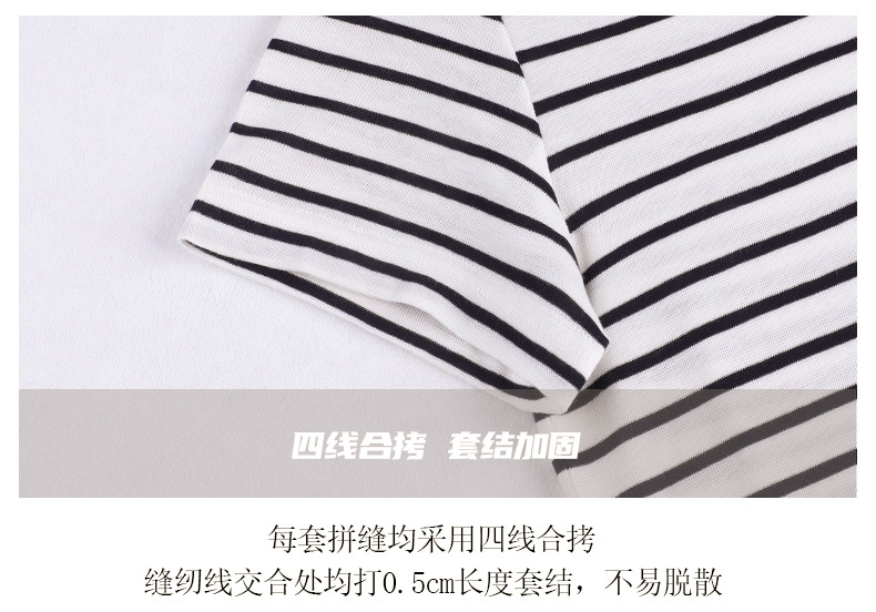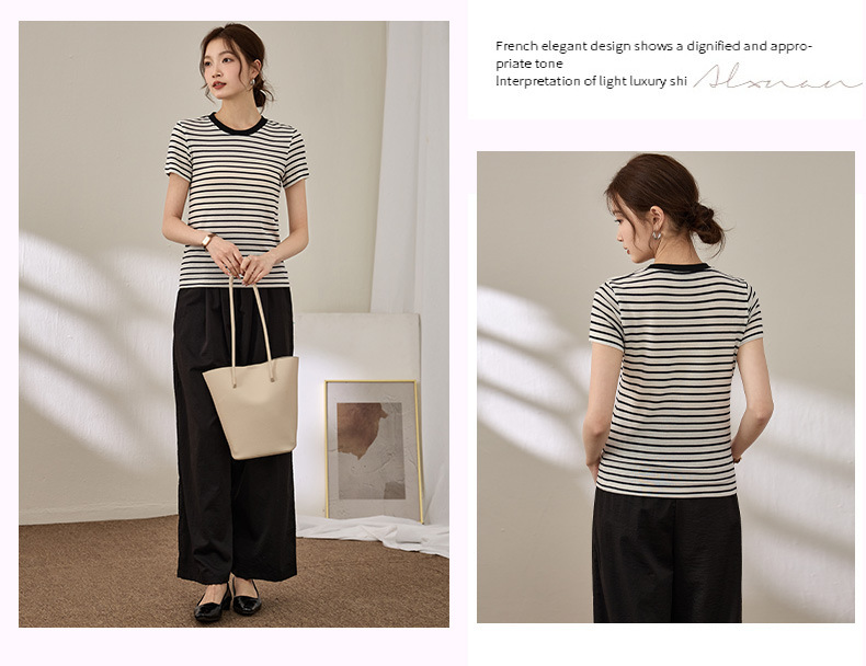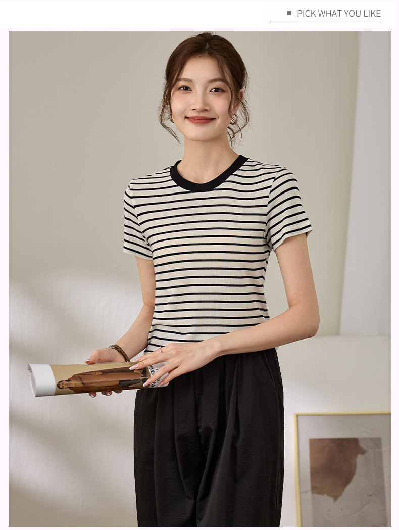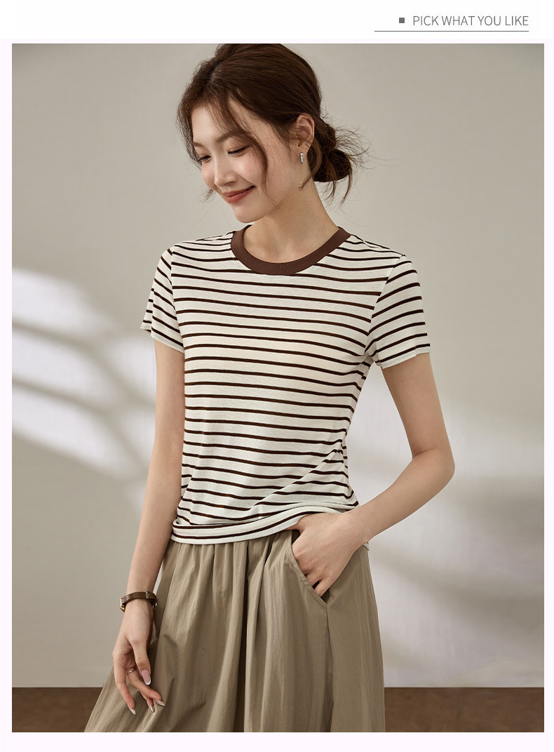 百媚生 天丝羊毛条纹圆领短袖女t恤16882