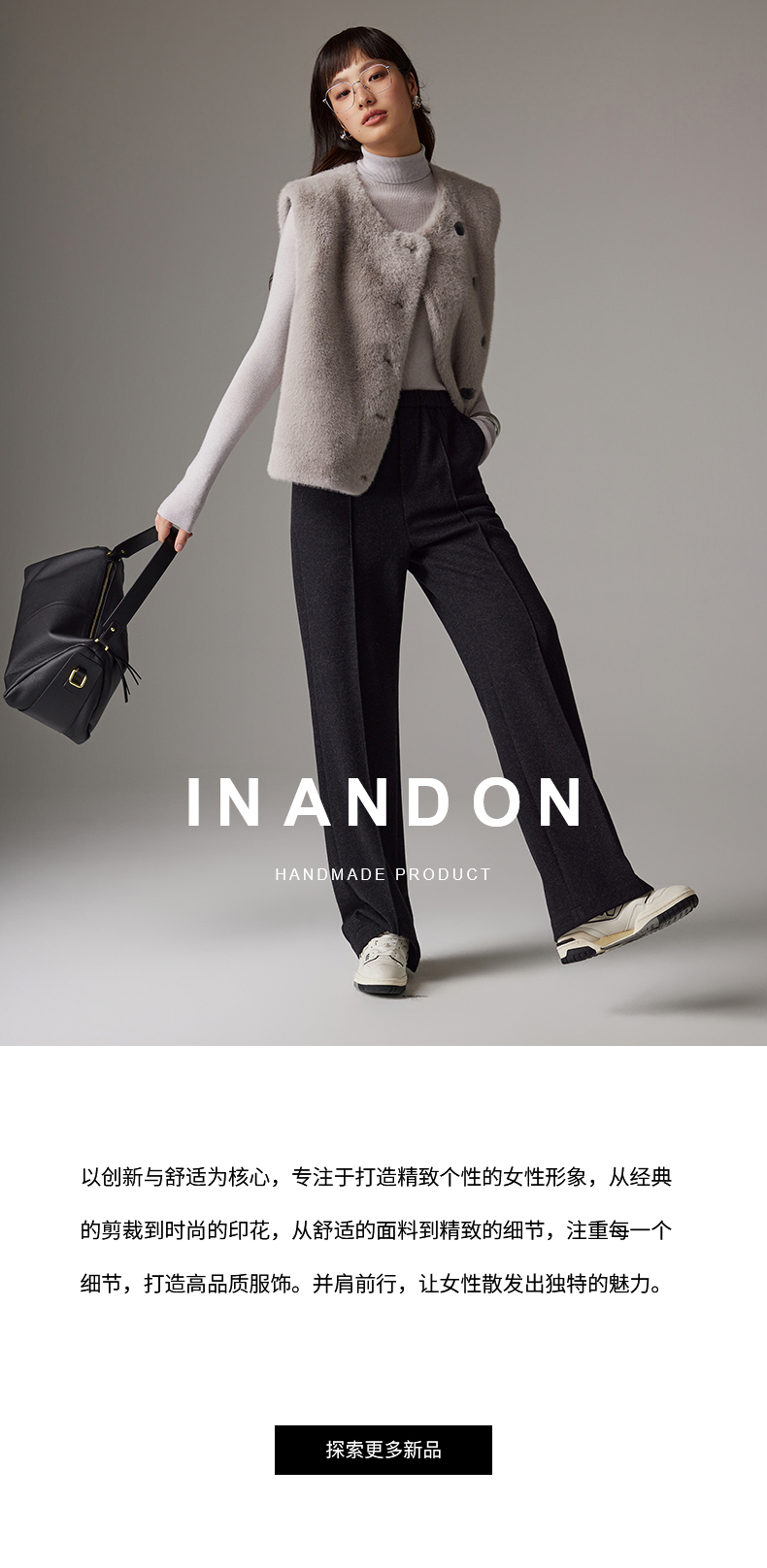 - IN AND ON—轻奢时尚品牌,以“致力于做你衣柜永远不肯丢掉的那一件”作为品牌理念,打造“轻奢时尚”的品牌定位。拥有时尚前沿的商品设计能力并将品质与价值进行完美平衡,致力为消费者提供舒适与奢华、创新与智能的完美购物体验。塑造独立自主的女性形象,让每个人都能拥有属于自己的时尚风格。