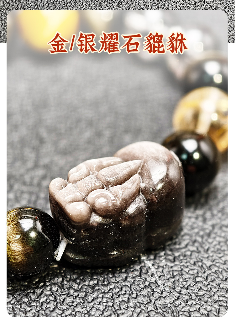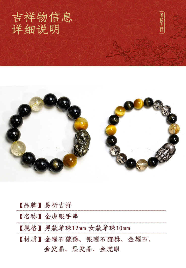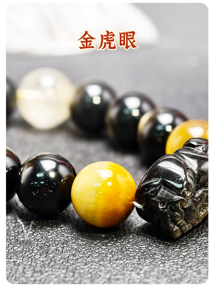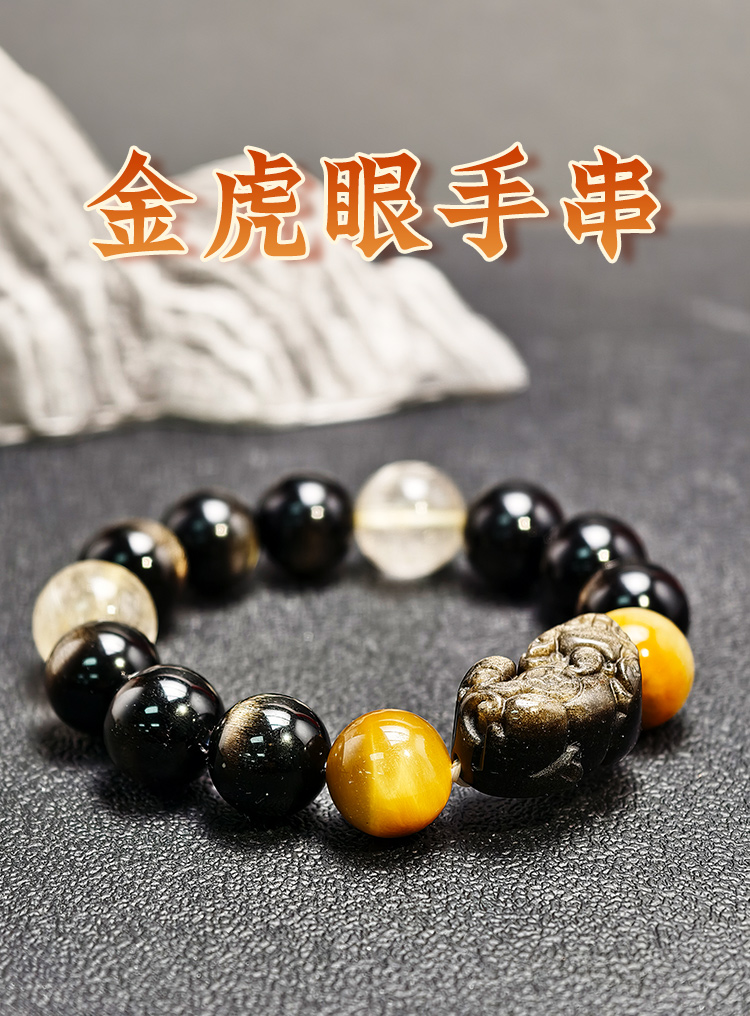 易祈吉祥金虎眼手串金银曜石貔貅饰品虎眼石男女款黑发晶手链