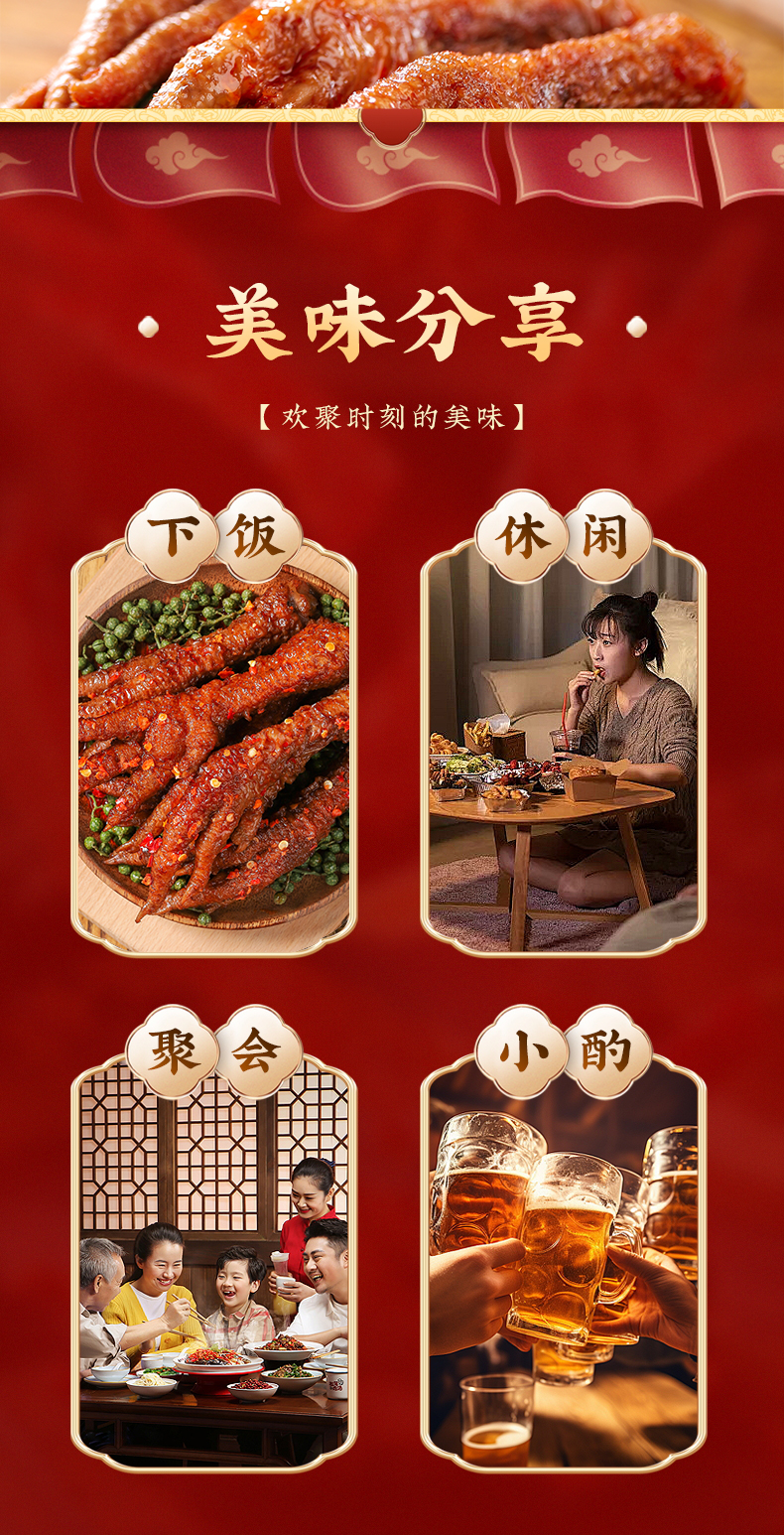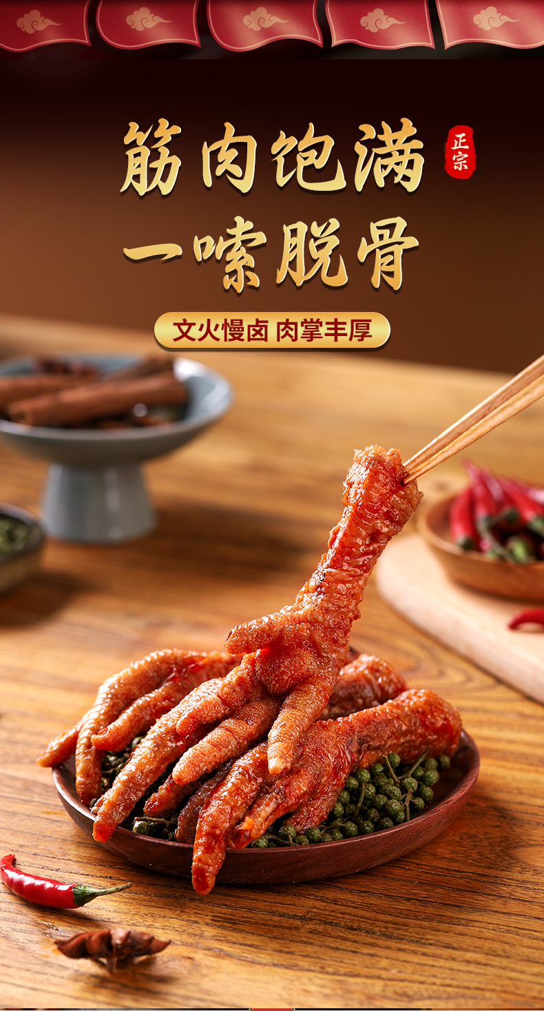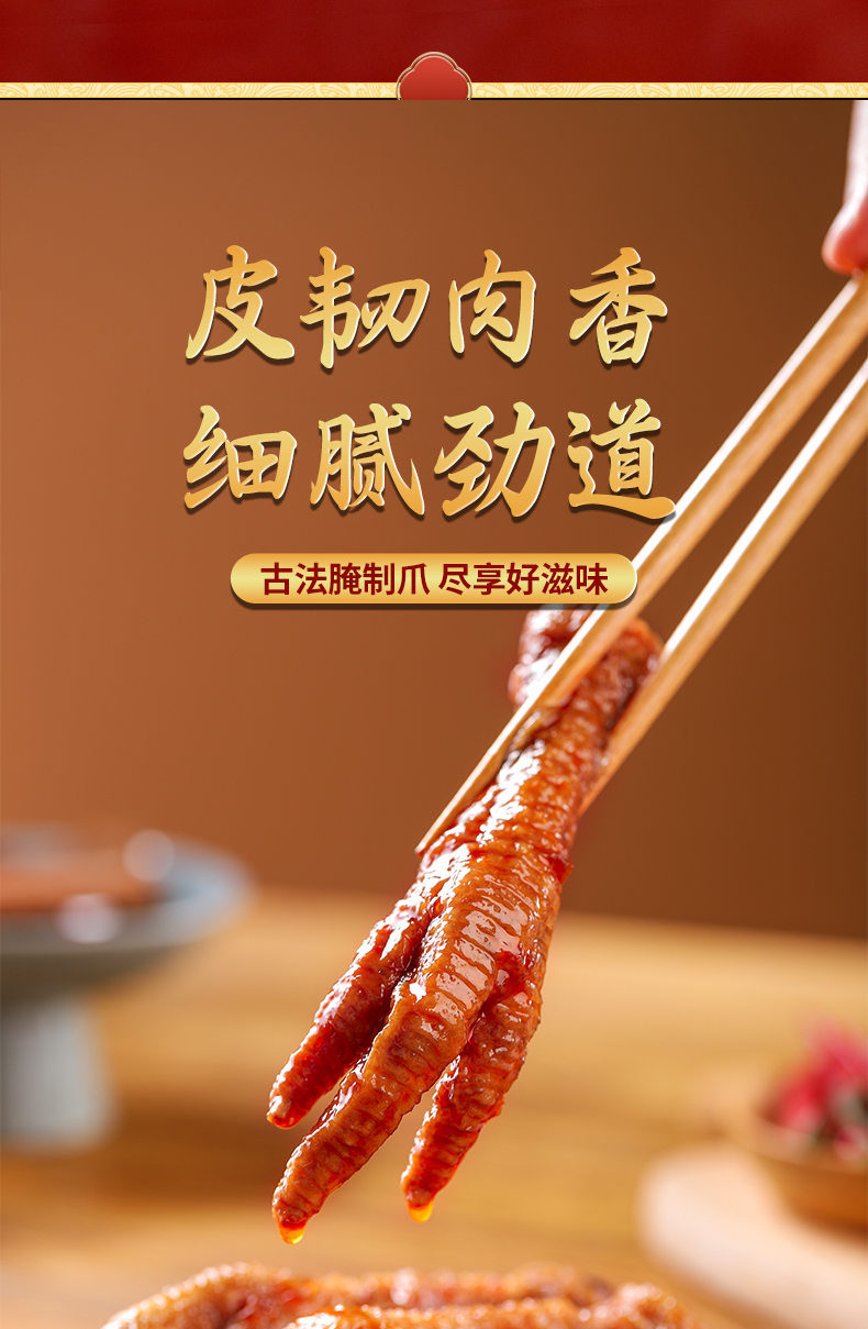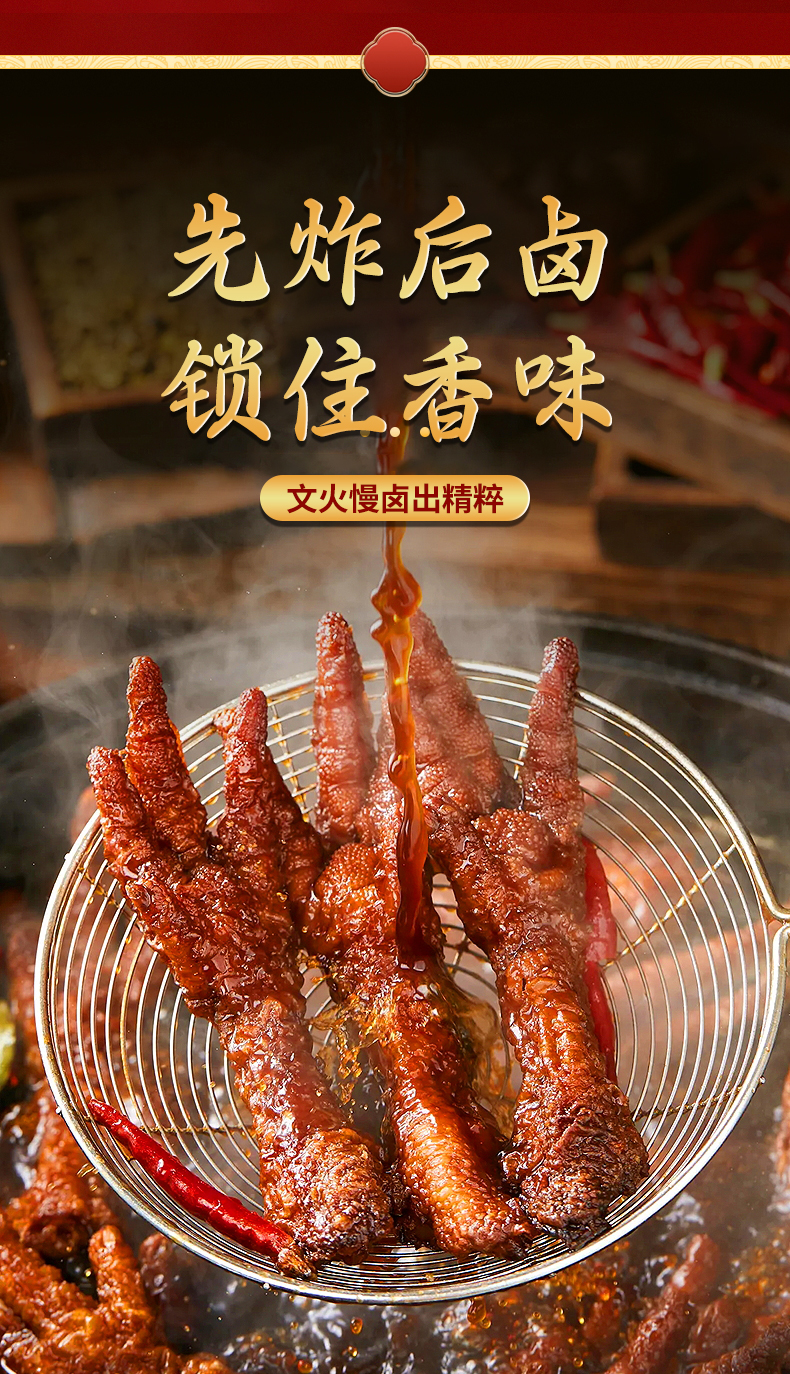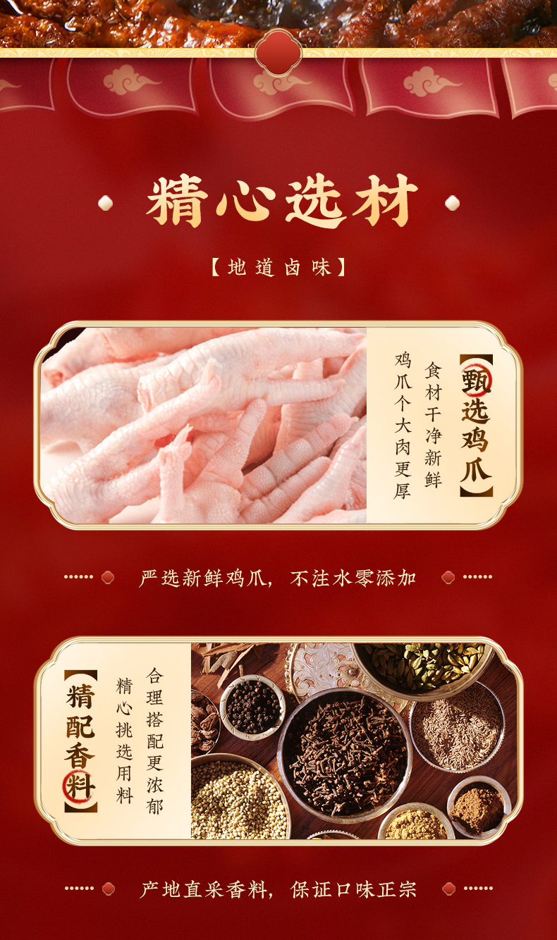 酱香配料表:鸡爪、高汤(饮用水、老母鸡)、食用盐、酿造酱油(含焦糖色)、食用大豆油、冰糖、味精、香辛料