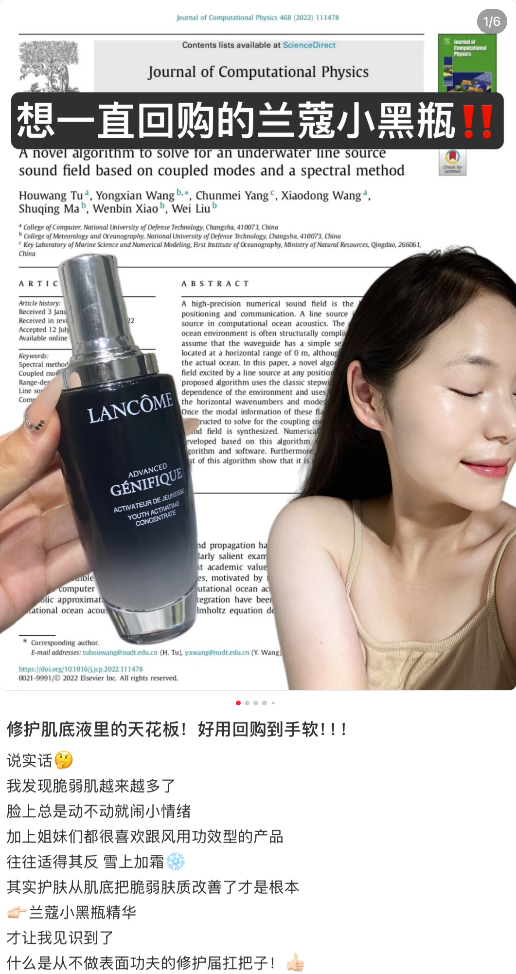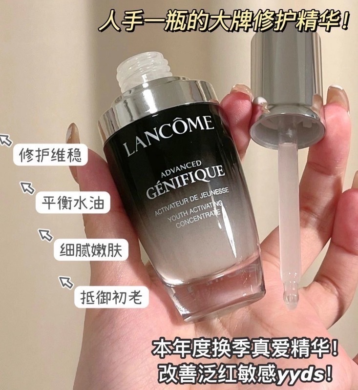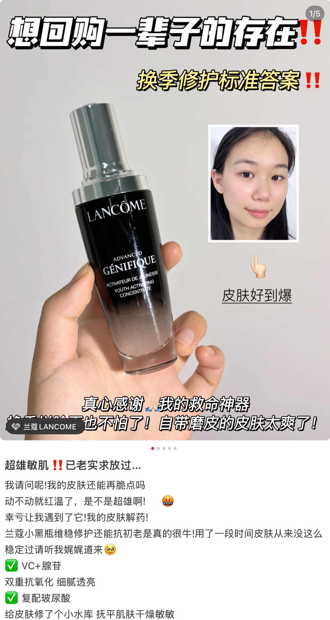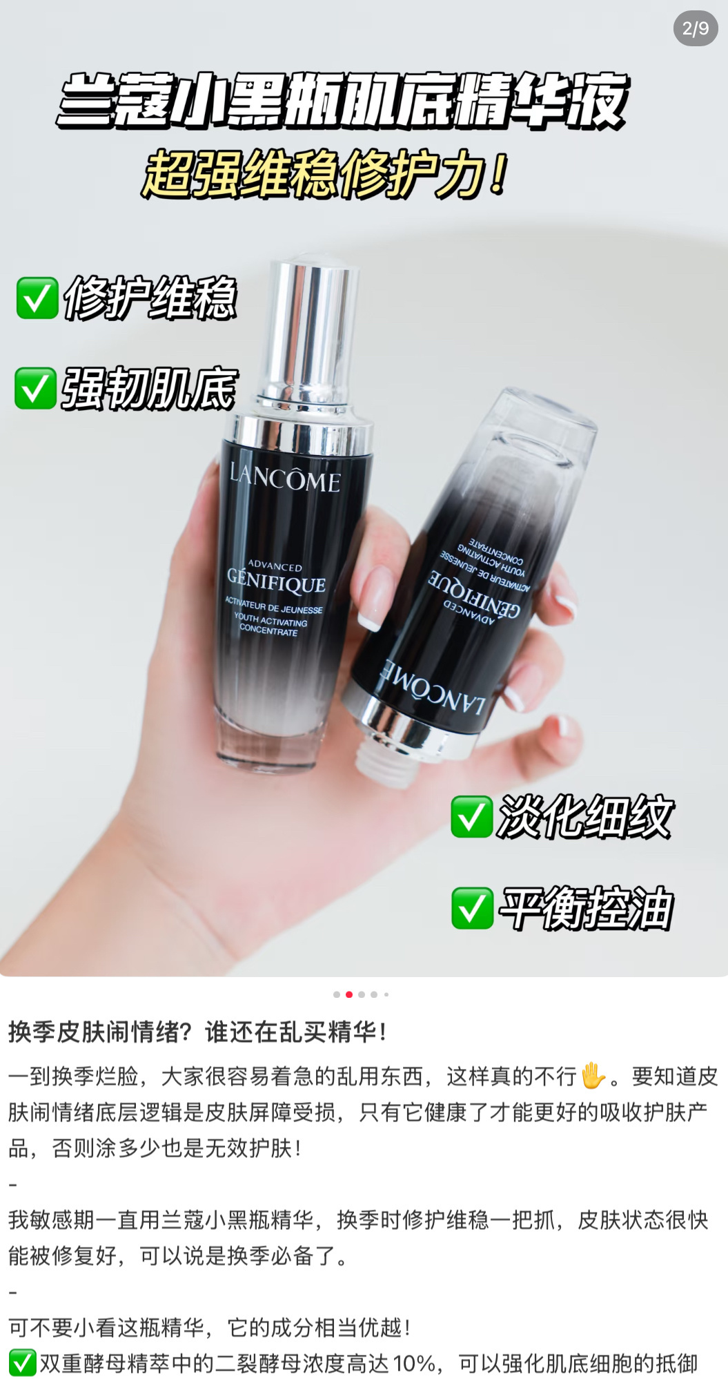 我敏感期一直用兰蔻小黑瓶精华,换季时修护维稳一把抓,皮肤状态很快能被修复好,可以说是换季必备了。