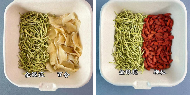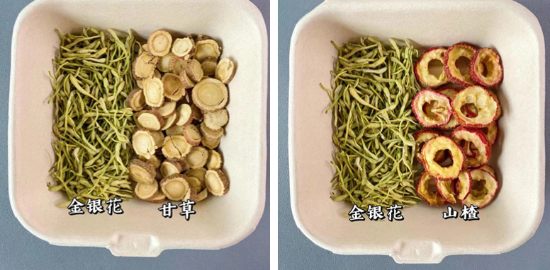 1.冲泡时请适量取用金银花。如果金银花太多,茶汤的味道会偏苦涩;放入适量的金银花,茶汤口感微甘。