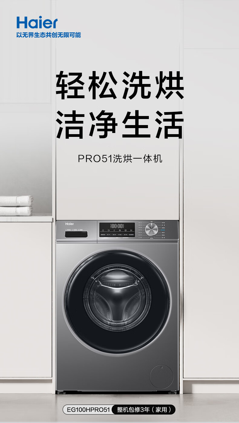 海尔(Haier) 10公斤大容量 滚筒洗衣机 全自动 初色51 洗烘一体机 超薄嵌入 智能投放 AI动平衡 智能烘干 微蒸气空气洗 双涡旋自清洁 EG100HPRO51】
