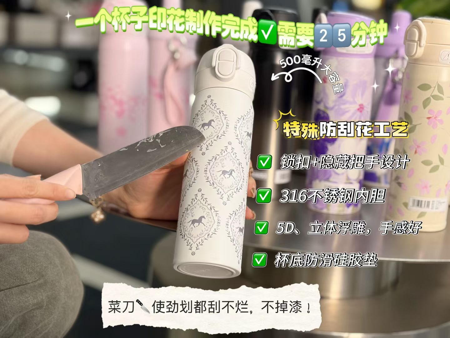 双饮口弹跳设计,喝水超方便,5D打印技术,怎么刮无痕迹!316不锈钢内胆,保温保冷效果16h,底部还做了防滑垫设计,还有隐藏式提手👋细节设计拉满啦~💯500ml容量带出门刚刚好!