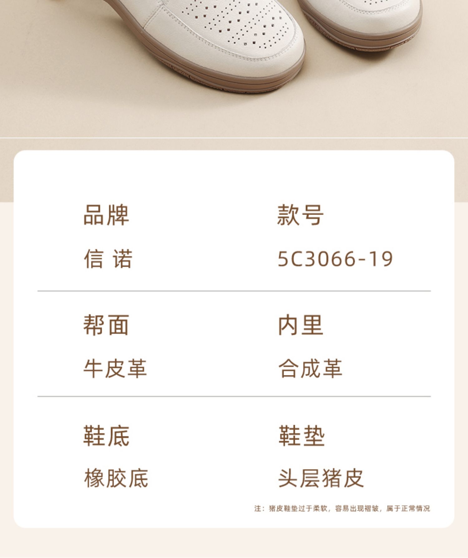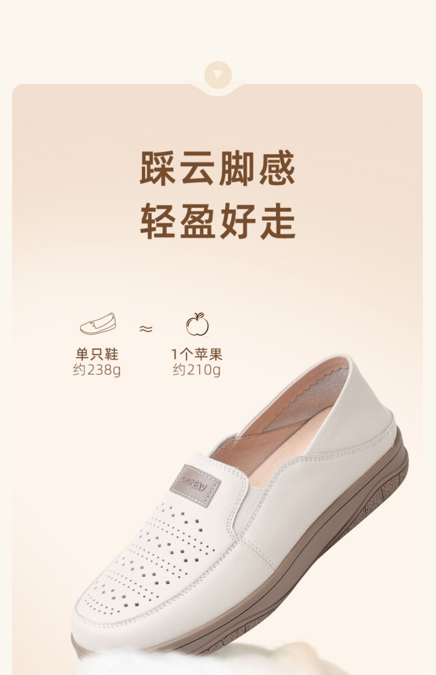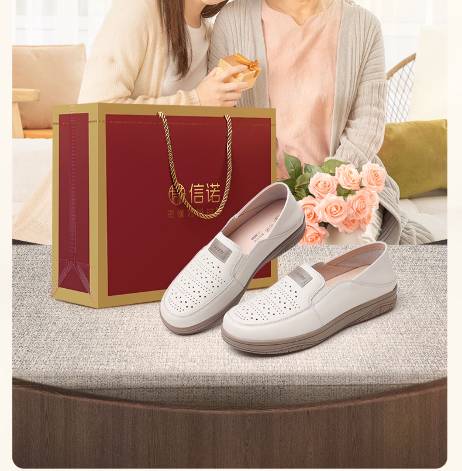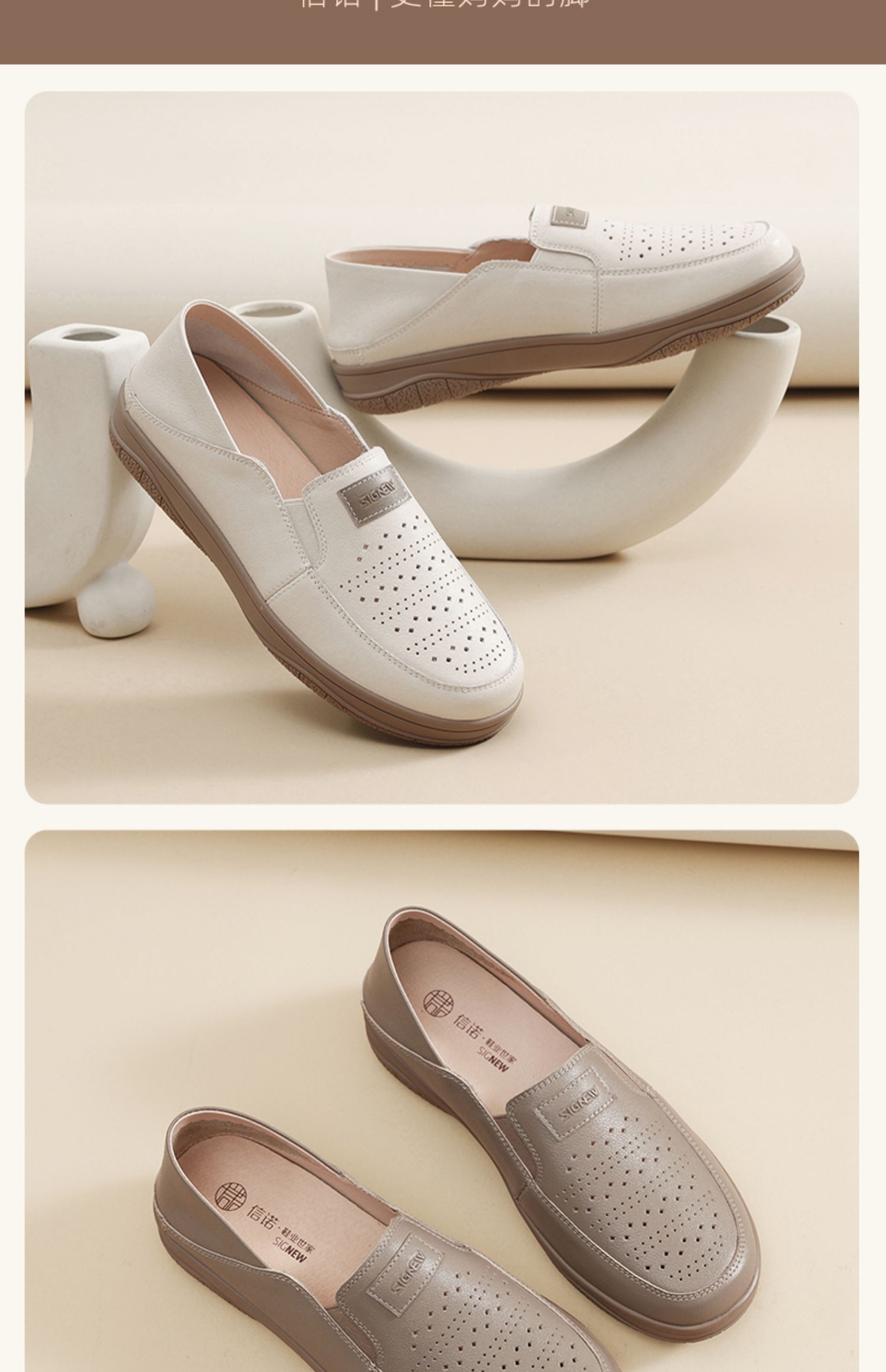 信诺真皮镂空透气单鞋女2025春季新款软底妈妈鞋小白鞋一脚蹬皮鞋5C3066-19