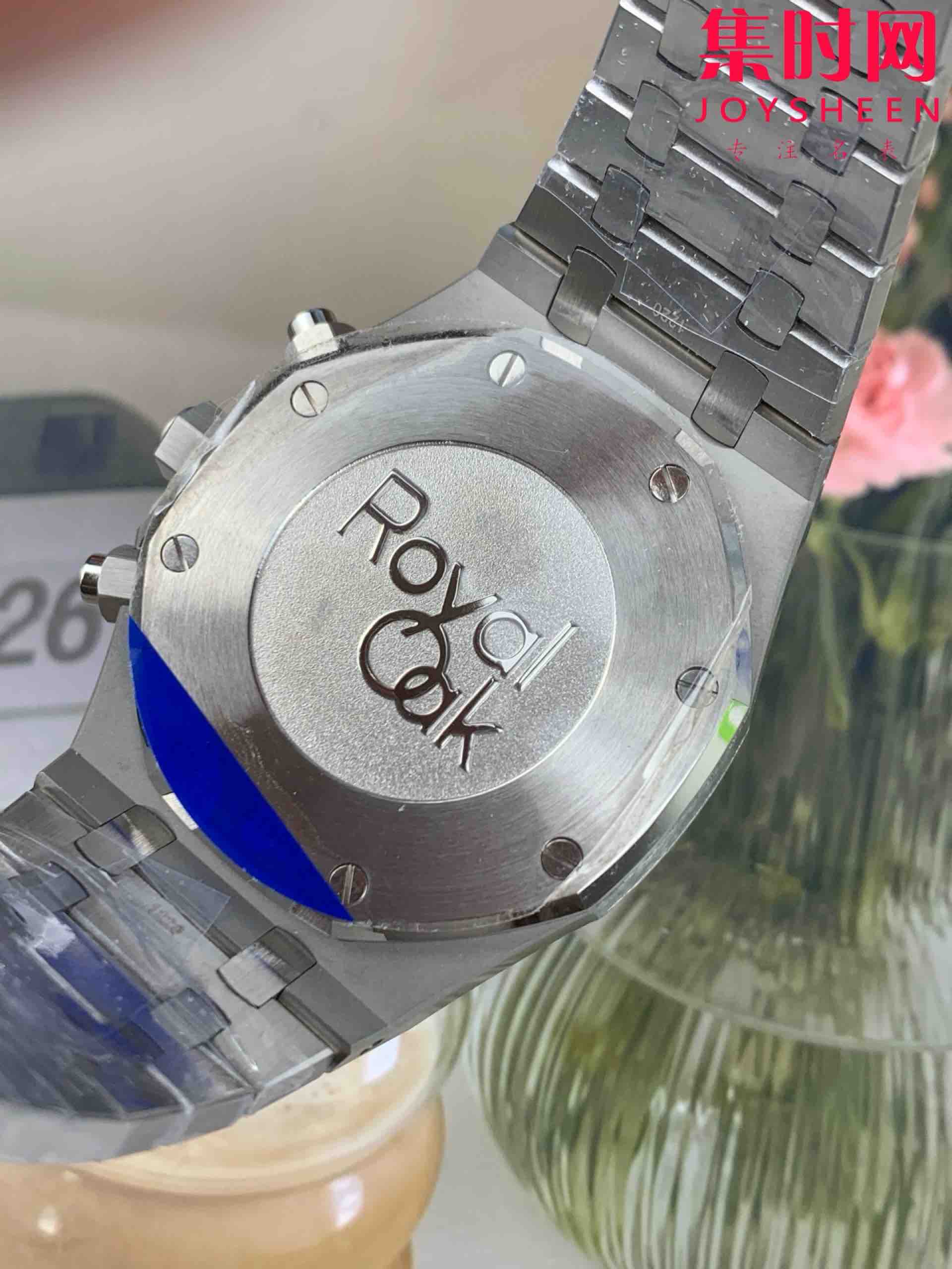 4️⃣aps26331 表盘正品开模,采用经典“Tapisserie”格纹表盘立体感强与原版无异,搭配镀铑立体时标与三眼计时子盘。八角形表圈配六角螺丝,夜光指针与刻度确保暗光读时,层次分明兼顾功能美学。