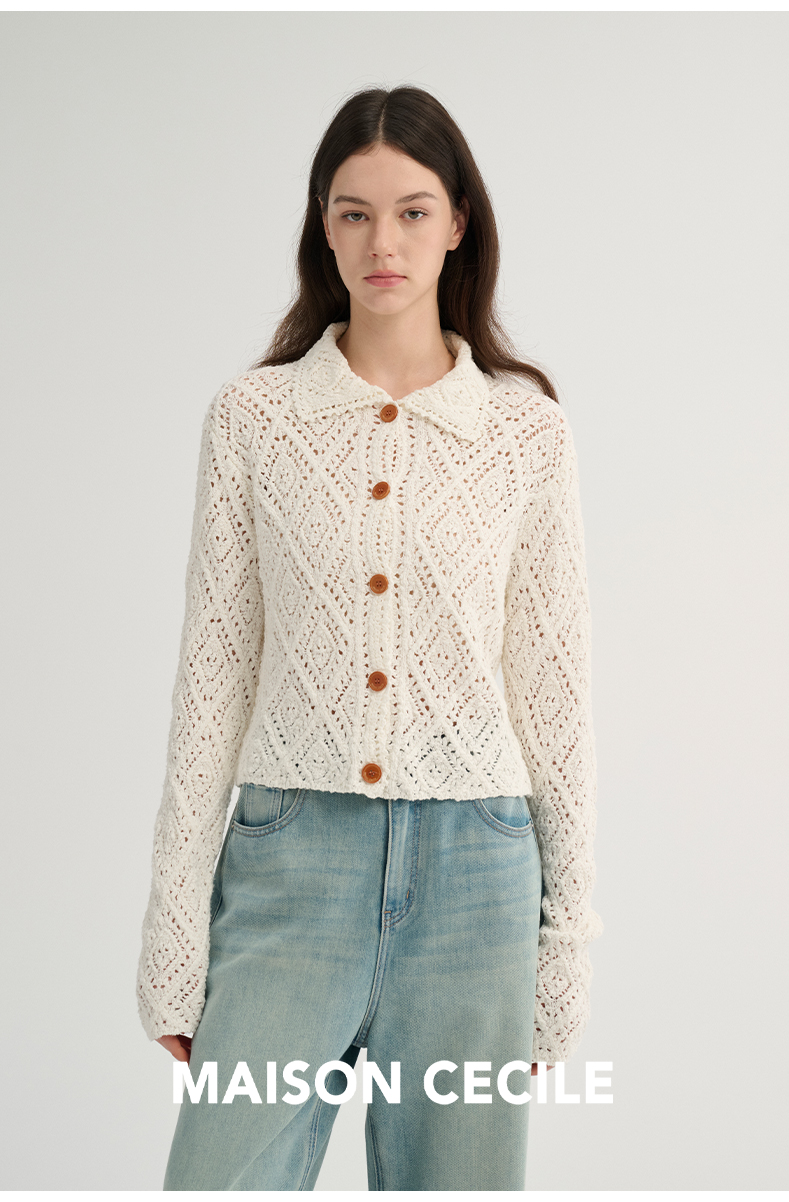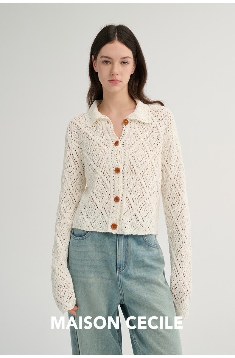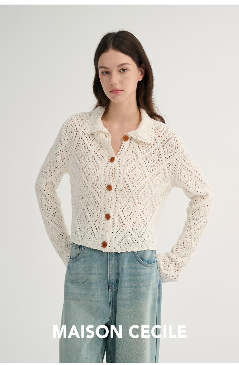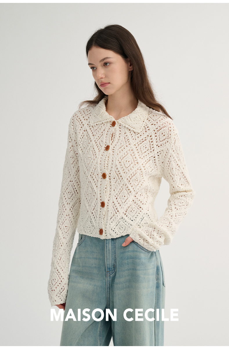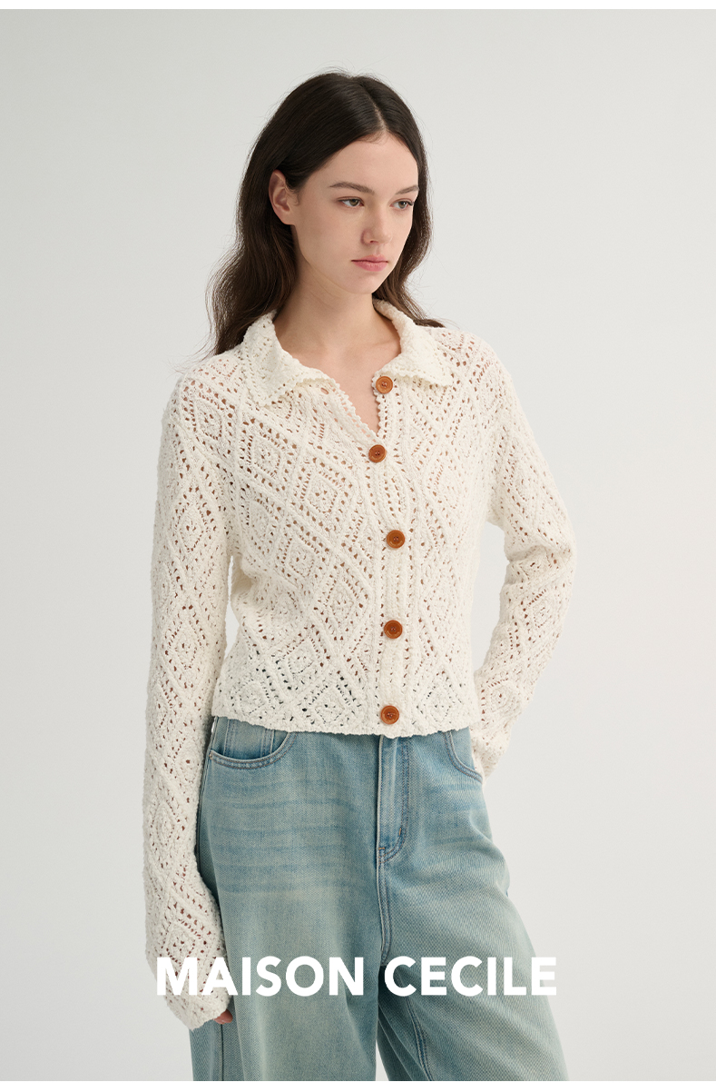 MAISON CECILE 重工镂空钩花翻领显比例针织长袖开衫