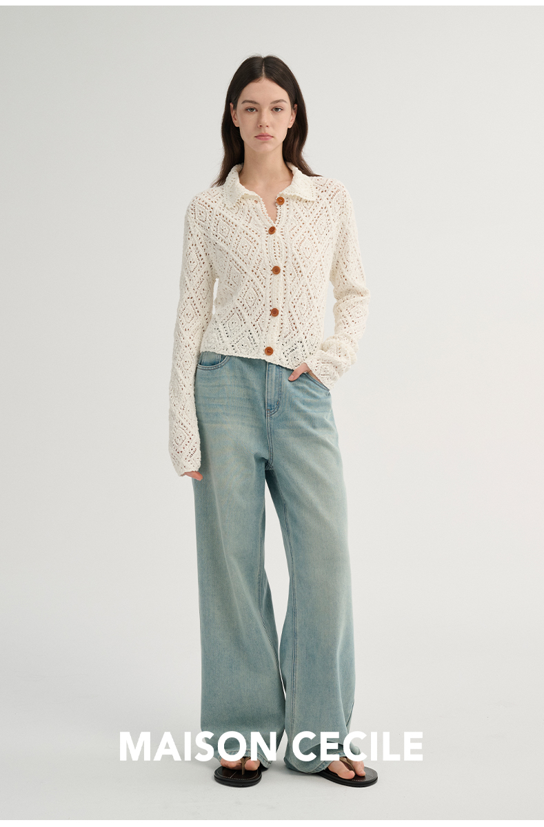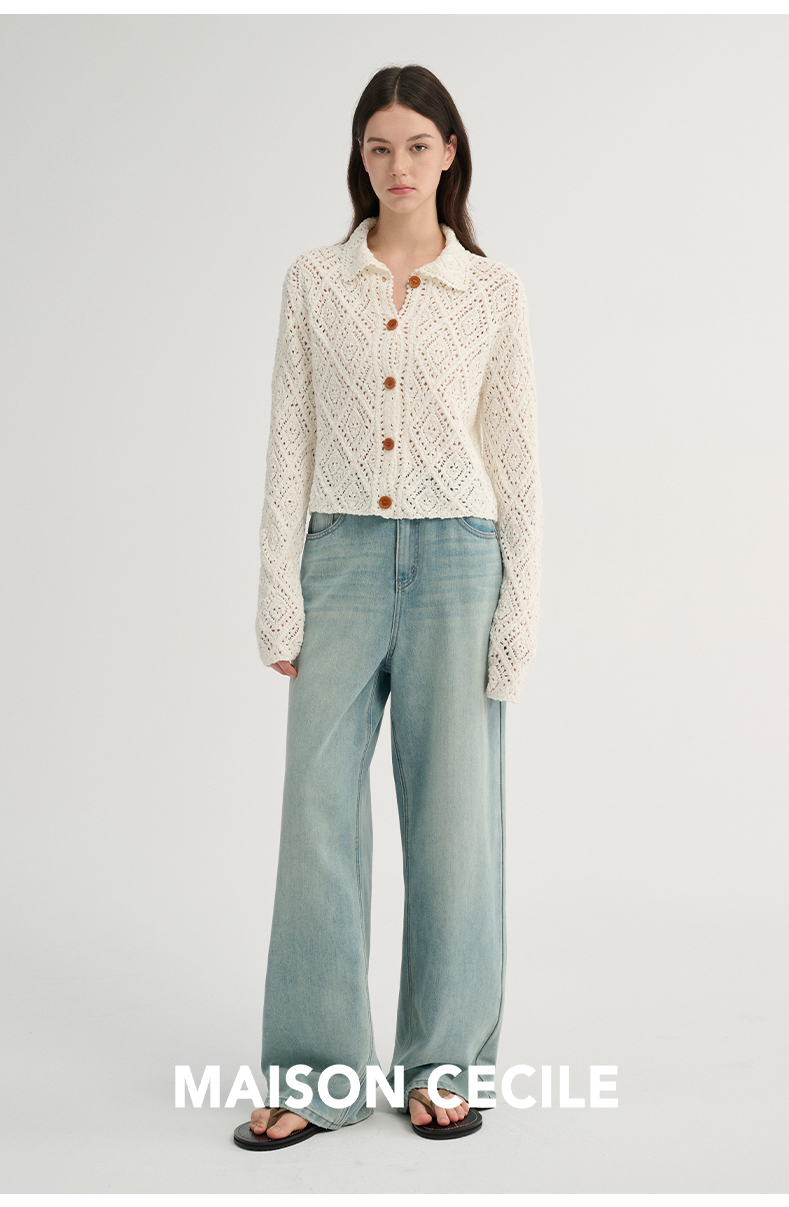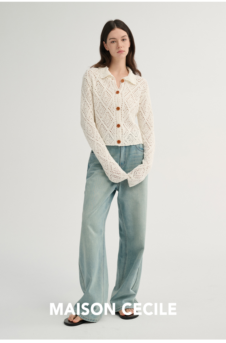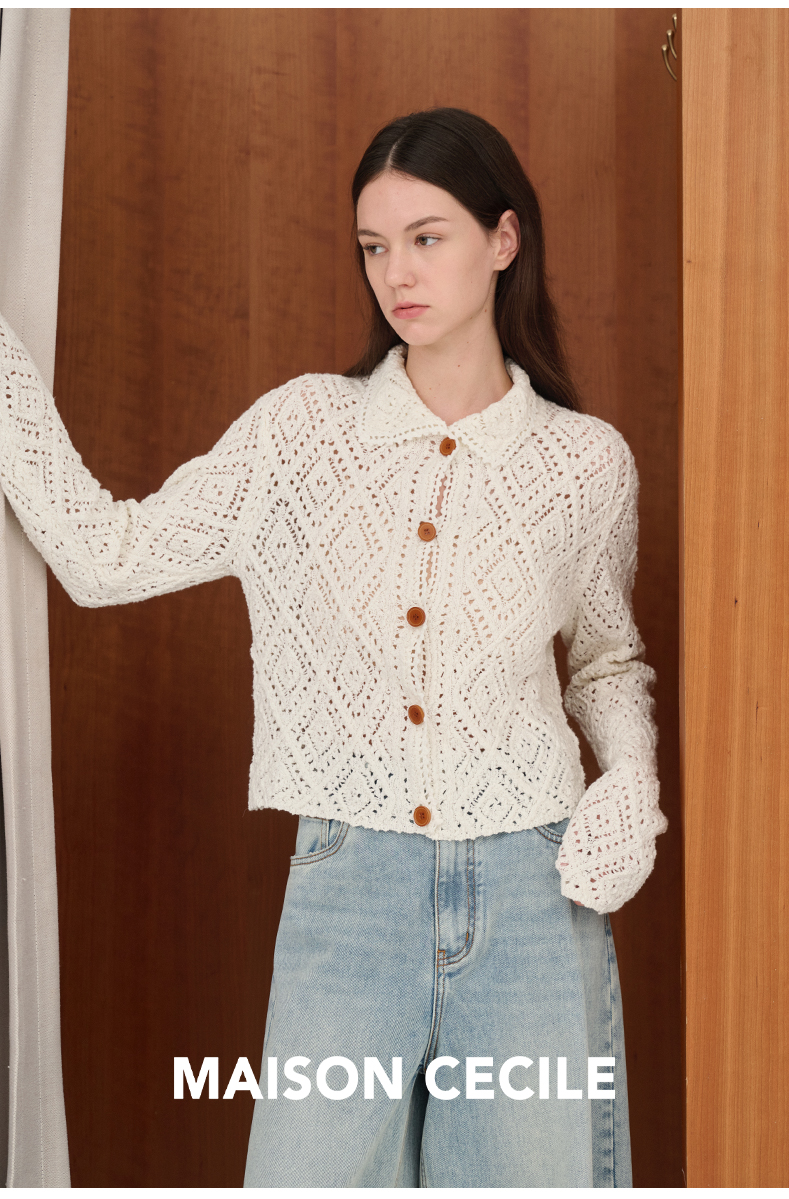 MAISON CECILE 重工镂空钩花翻领显比例针织长袖开衫