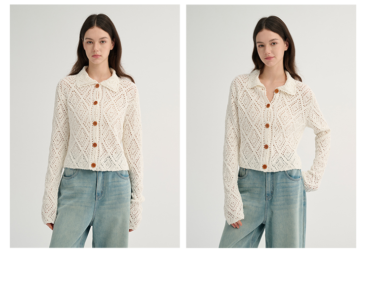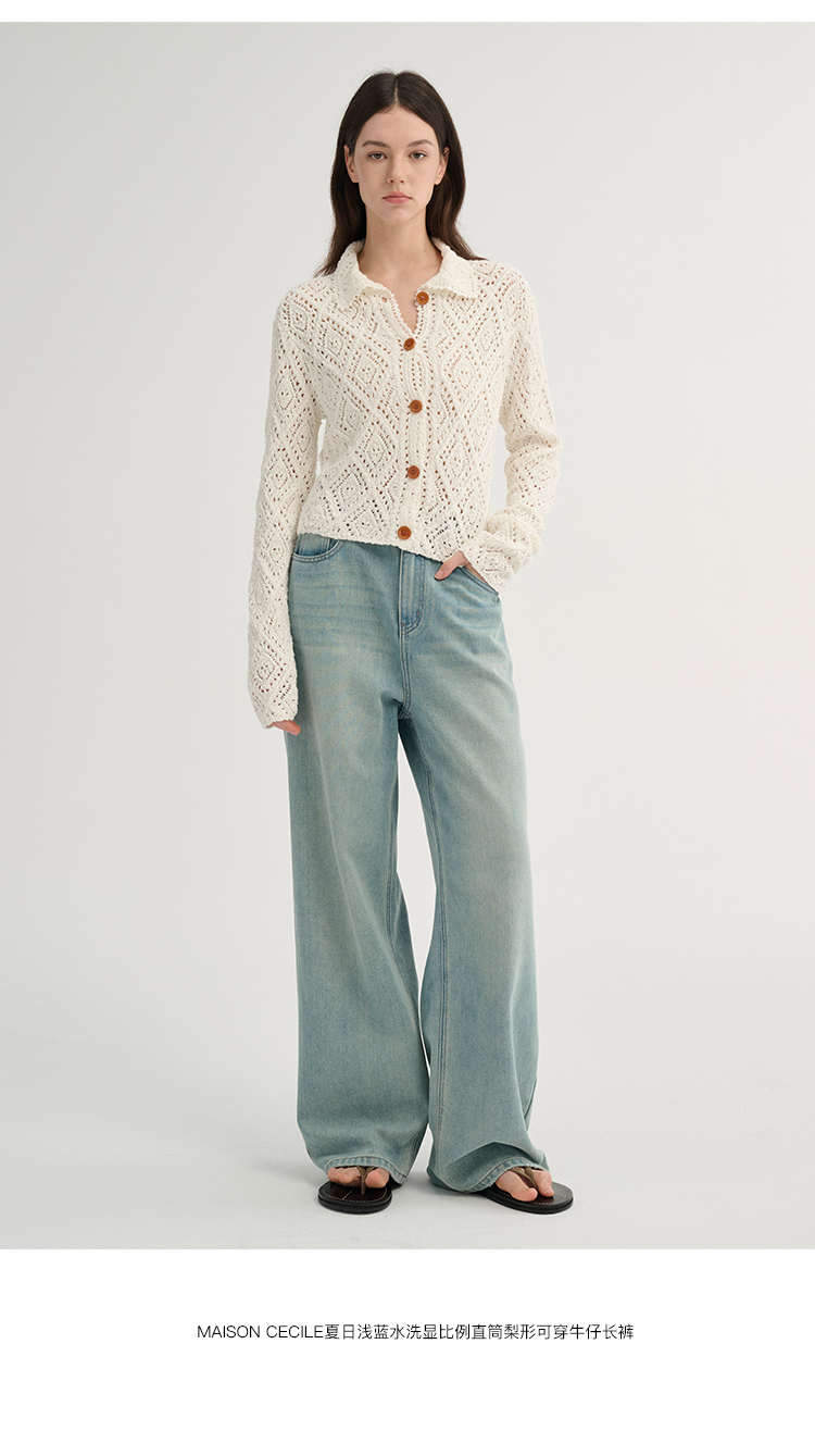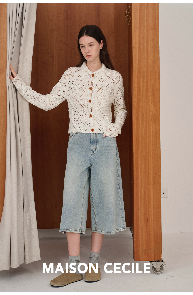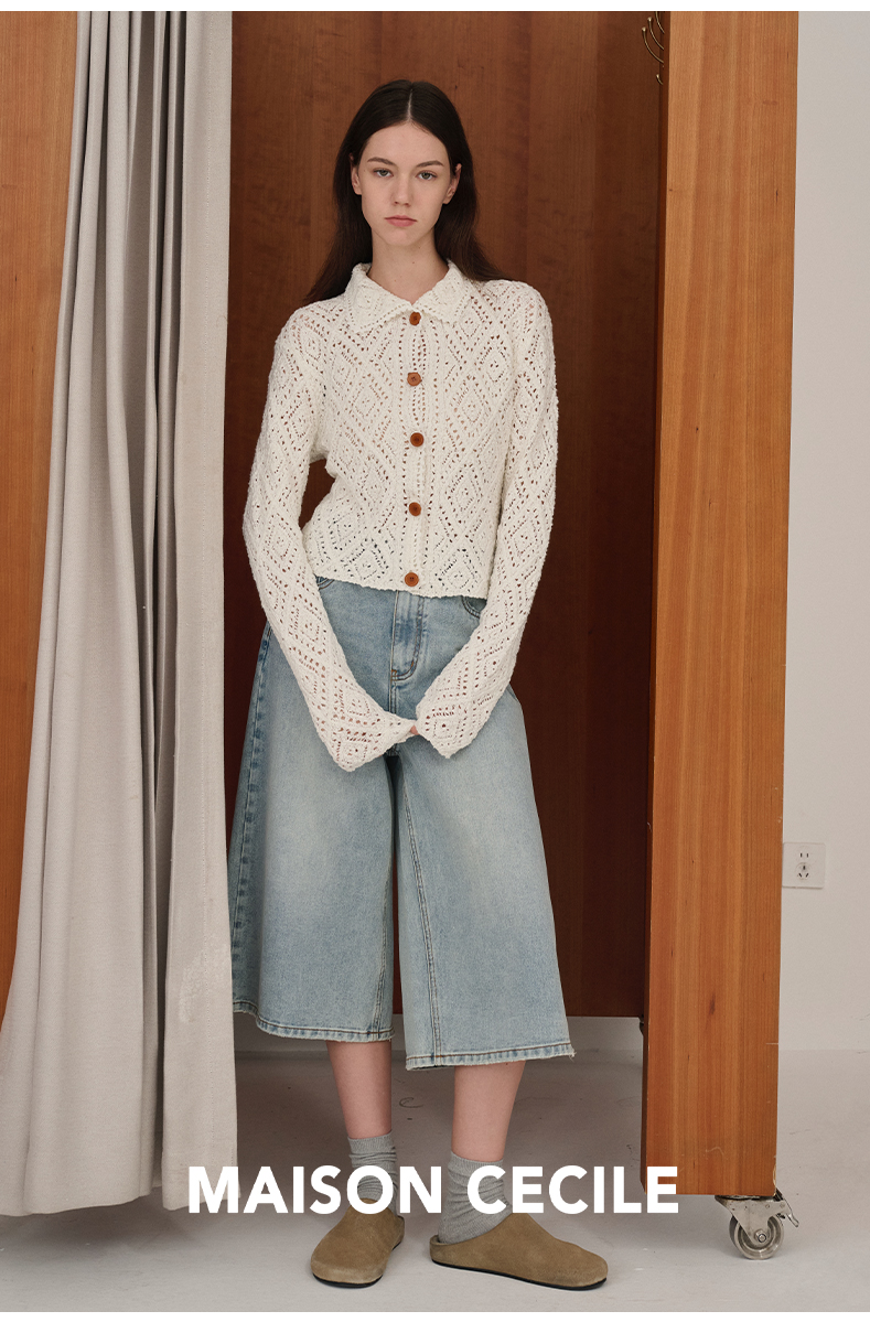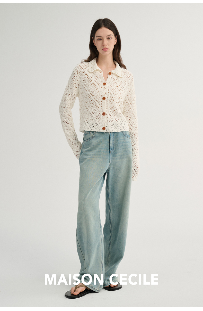 MAISON CECILE 重工镂空钩花翻领显比例针织长袖开衫