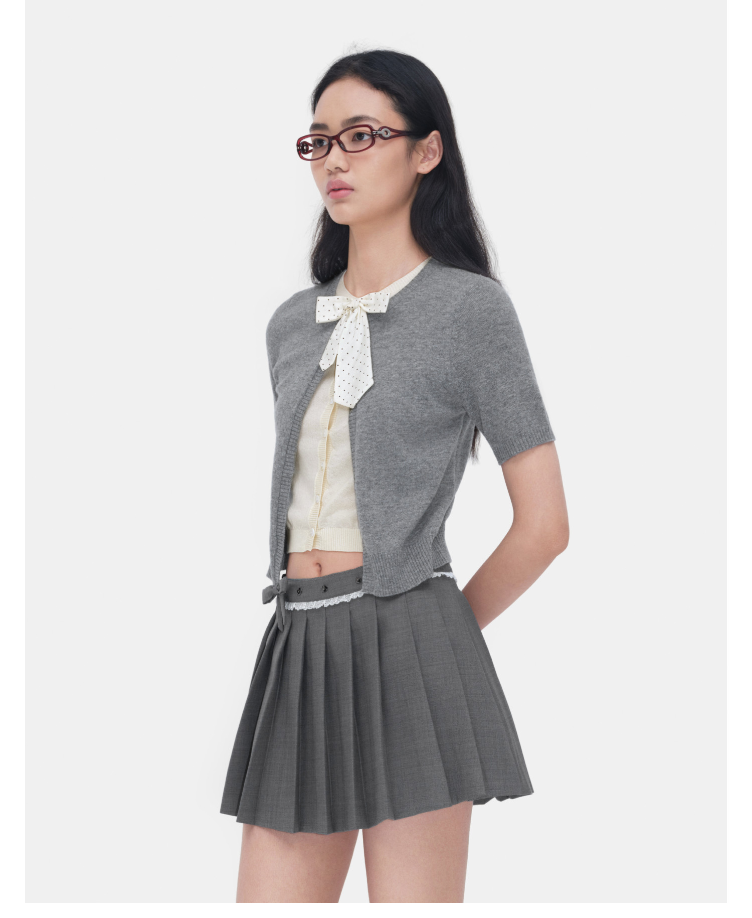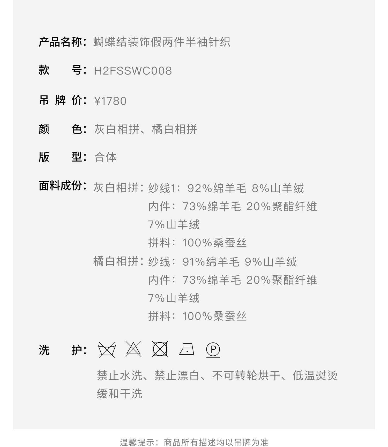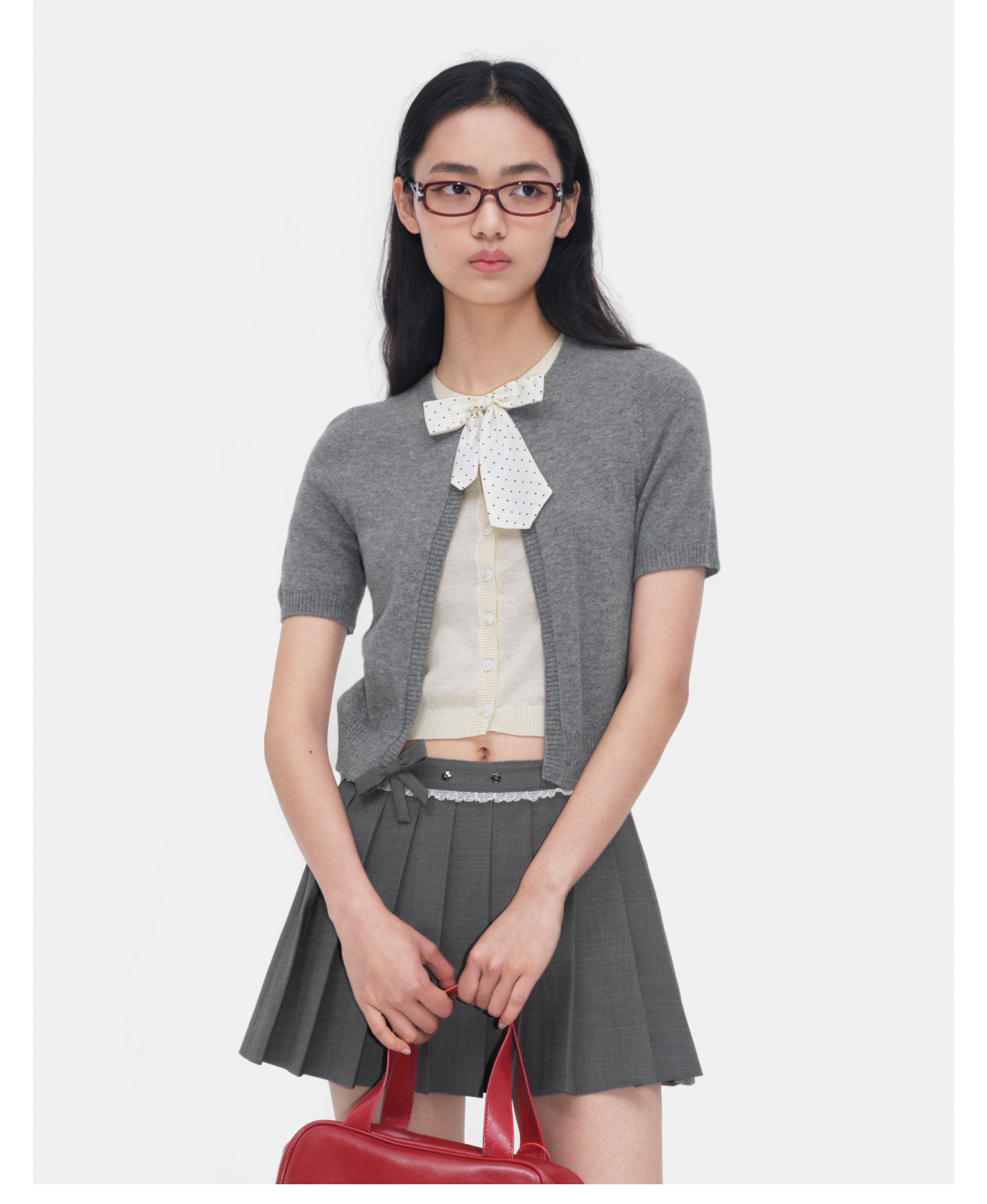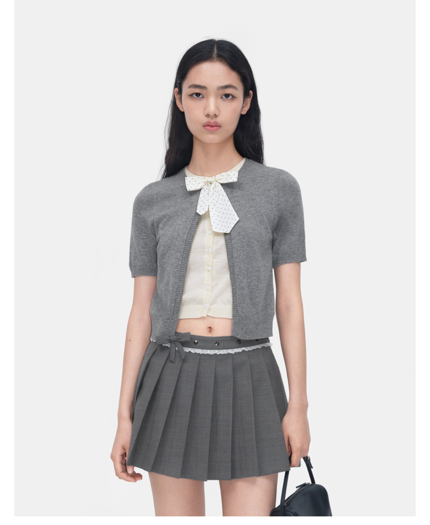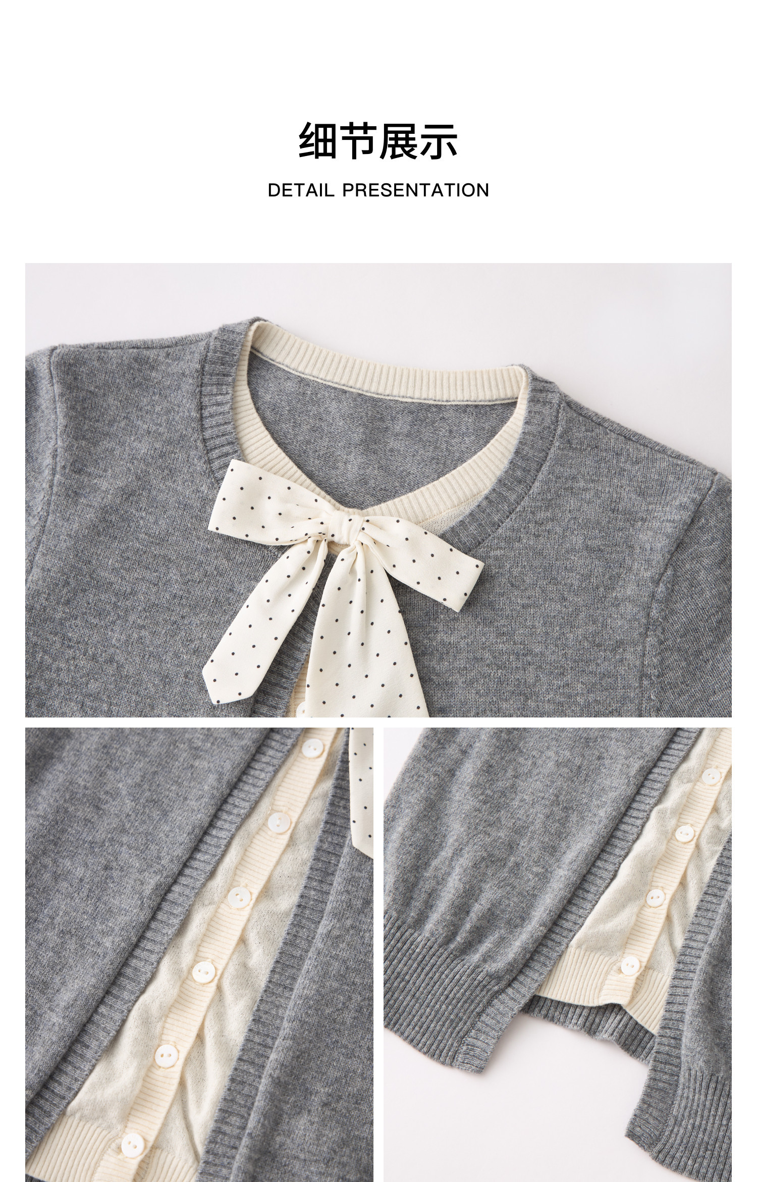 HERLIAN 2026年春季新品蝴蝶结装饰假两件半袖女士针织衫