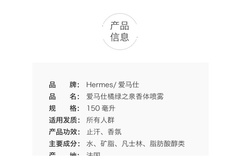HERMES/爱马仕 橘绿之泉止汗香体喷雾150ML
