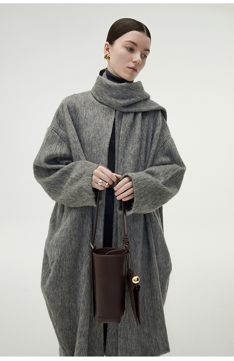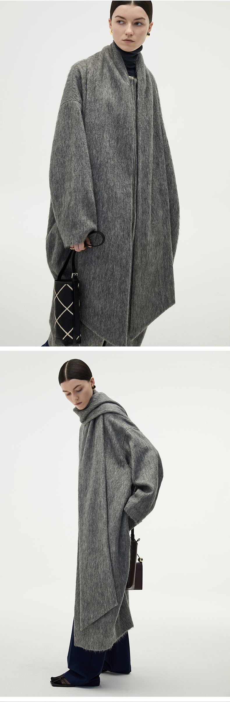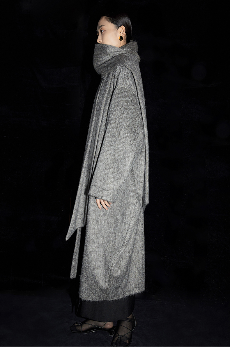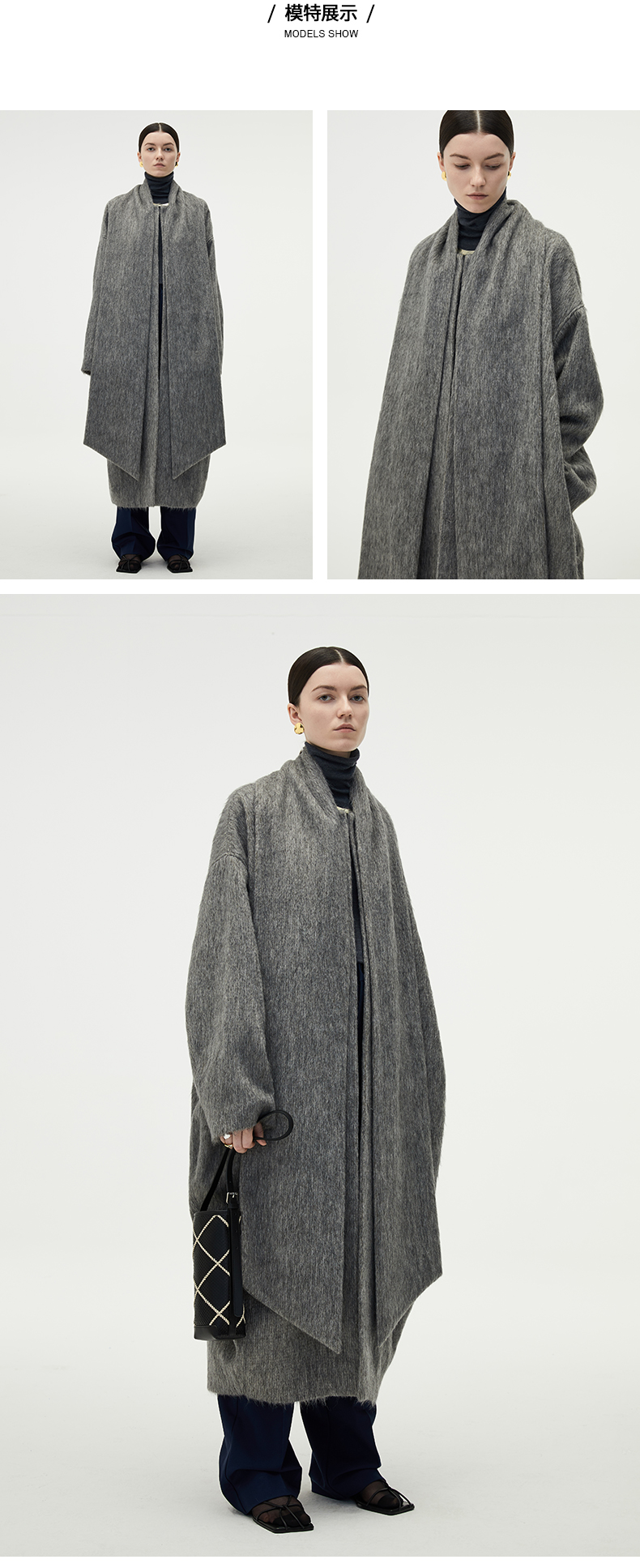 HIDEMI 水墨灰马海毛可拆卸围巾设计感长款茧型两件套大衣