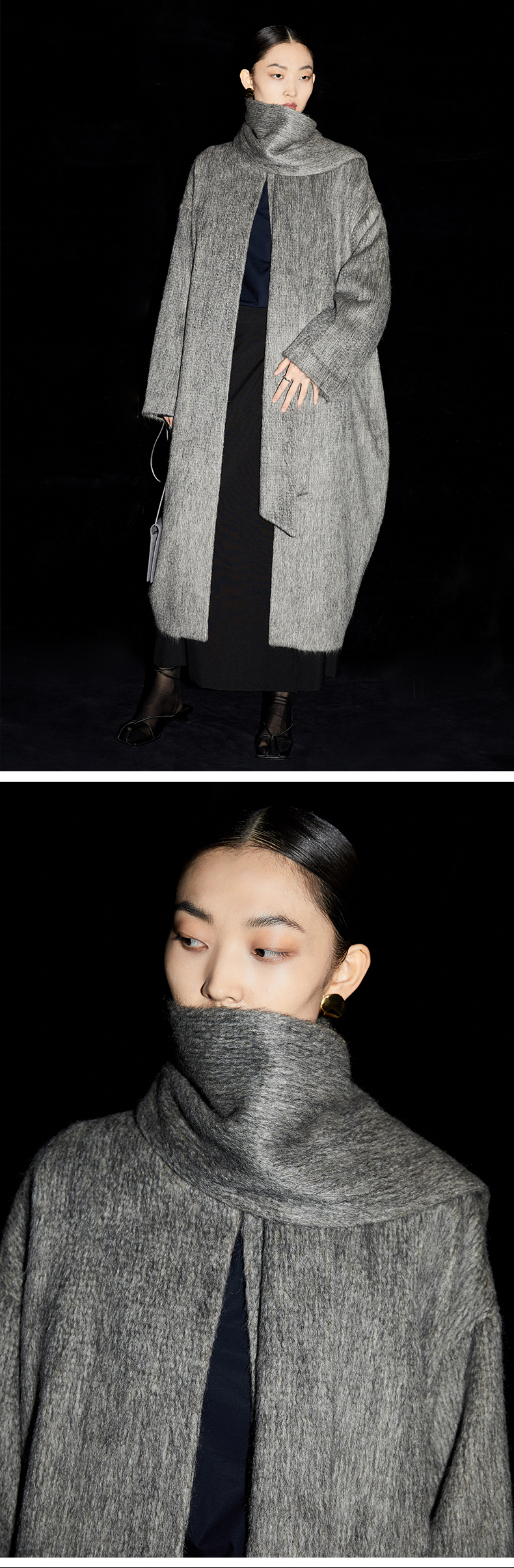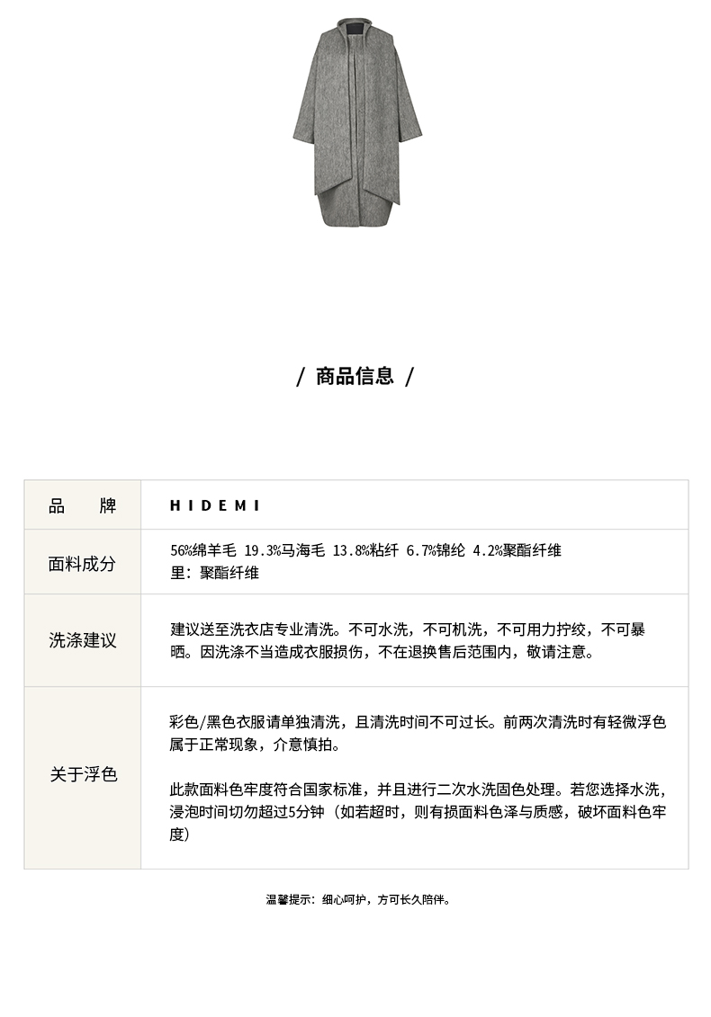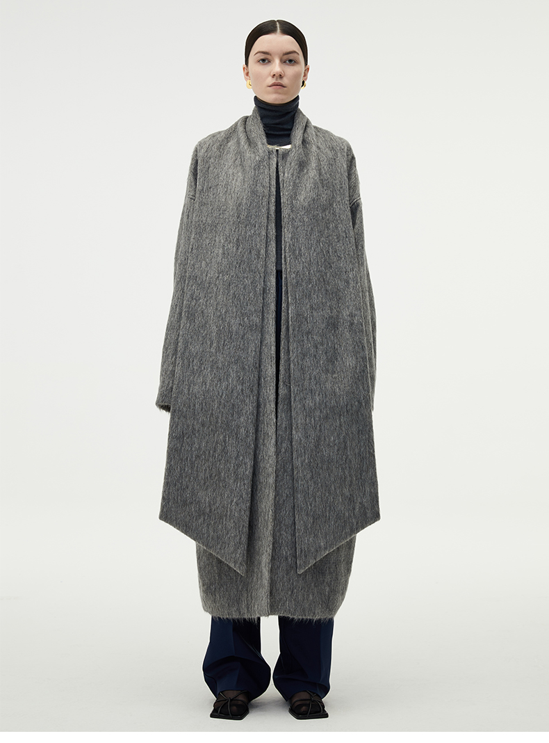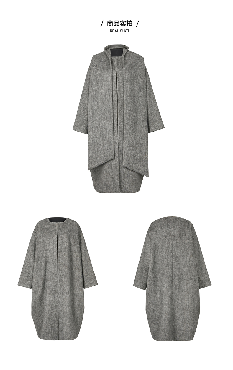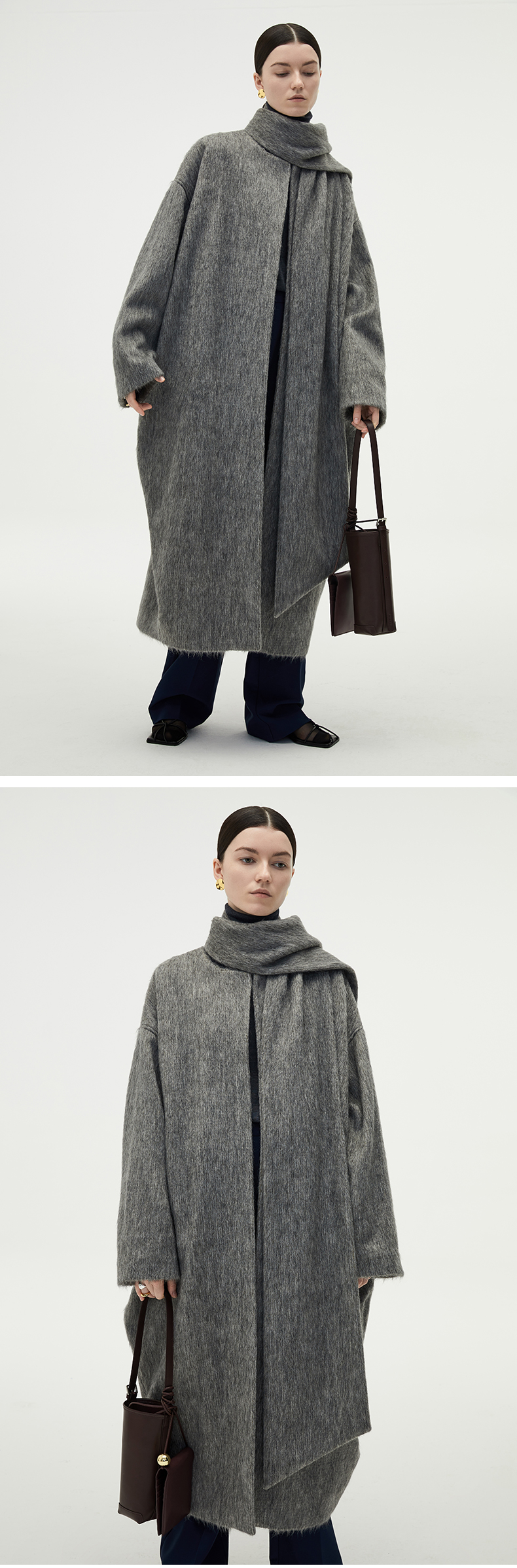 HIDEMI 水墨灰马海毛可拆卸围巾设计感长款茧型两件套大衣