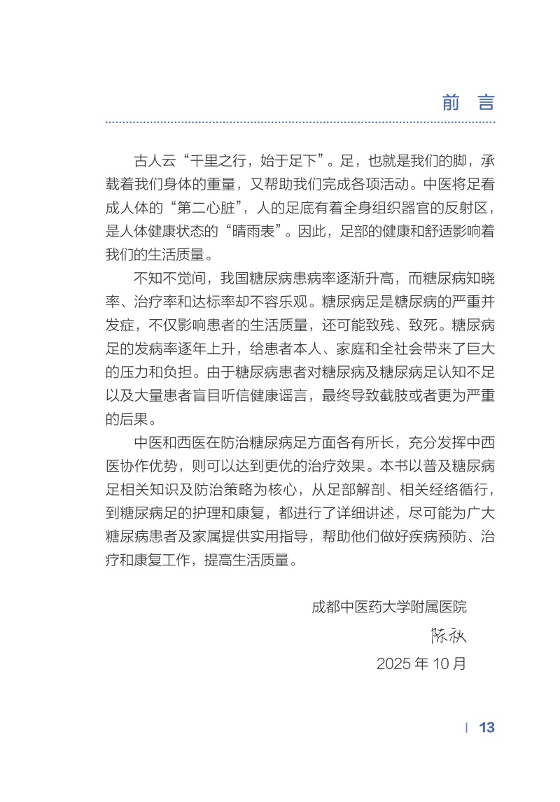 糖尿病足的预防胜于治疗,本书旨在通过科普化的讲述,加强糖尿病患者自我血糖管理及糖尿病高危足的管理,以期早期发现和治疗高危足,并在日常生活中对高危足进行科学护理,降低糖尿病足的发生和再发。本书主要内容包括:糖尿病足相关的基础知识、饮食、运动、病情监测方式,并发症防治及日常糖尿病足生活保健建议。着重介绍糖尿病足的发病机制、诱因,风险评估,足部护理原则及要点等。为提高书籍的阅读性,全书充分结合实际病例资料,以图文并茂的方式进行讲述,浅显易懂。在每个章节前设有提问,在每个章节后进行要点总结及疑问解答,提高内容的实用性。