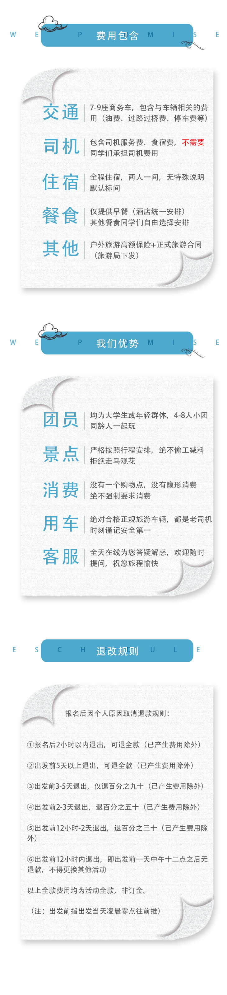 3、我们活动是自由行小团,区别于常规的旅游团,我们希望您在活动中能遵守安全纪律、守时、对于有常抱怨、洁癖、斤斤计较的队员请慎重报名;
