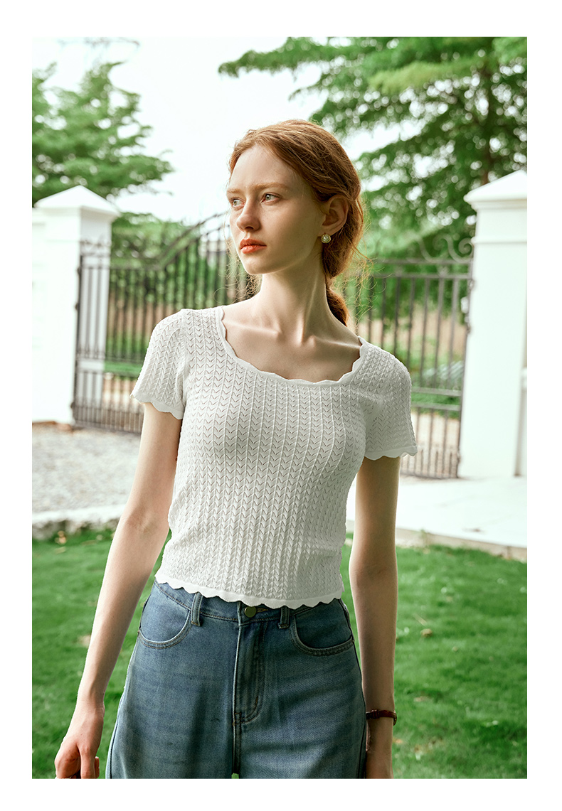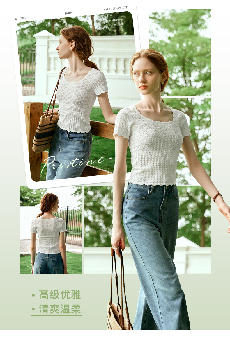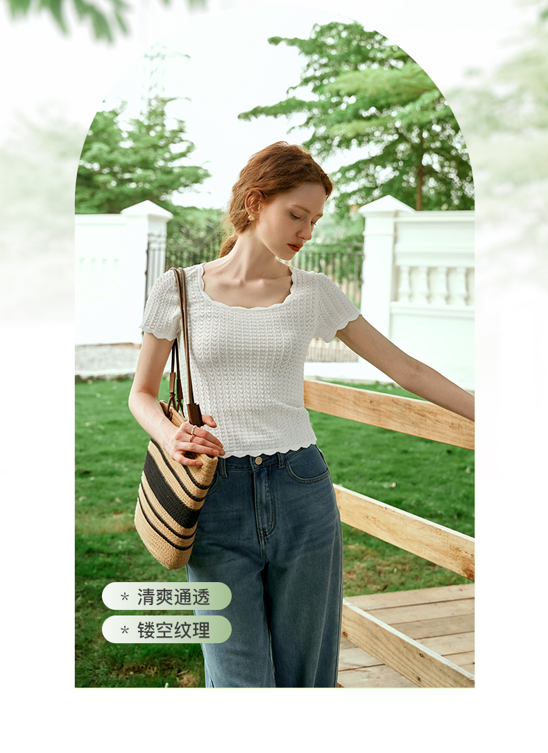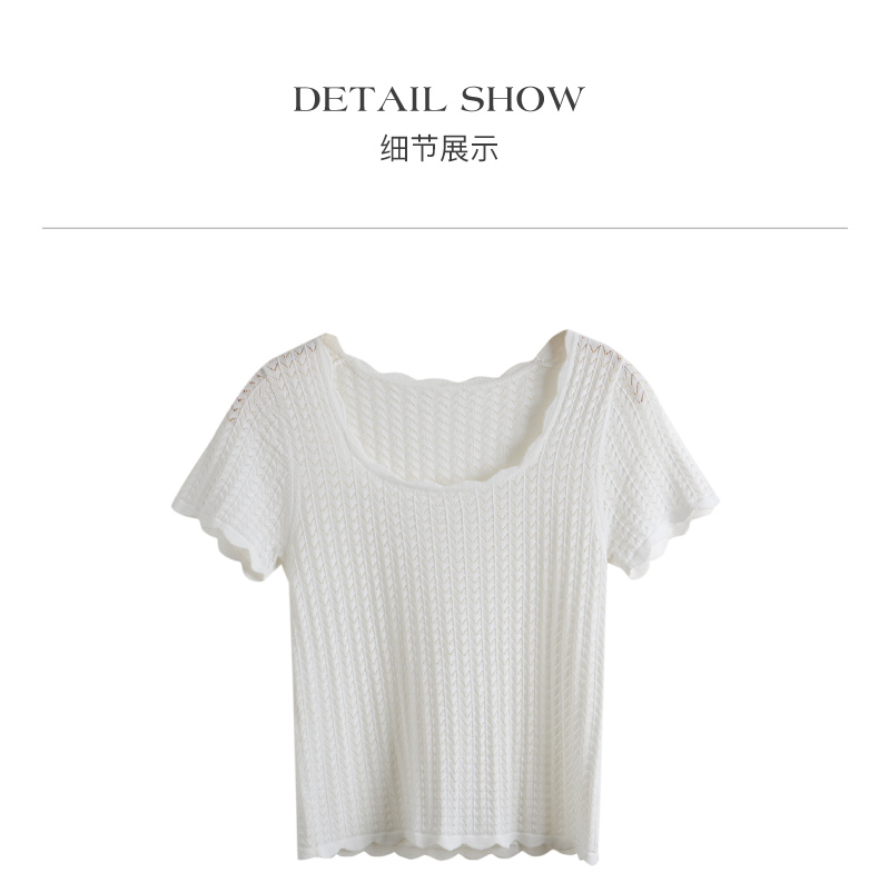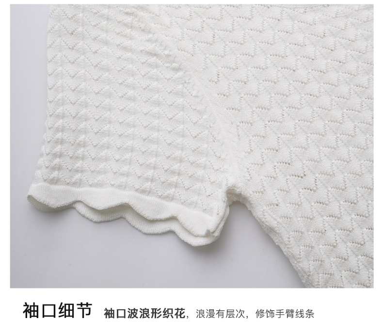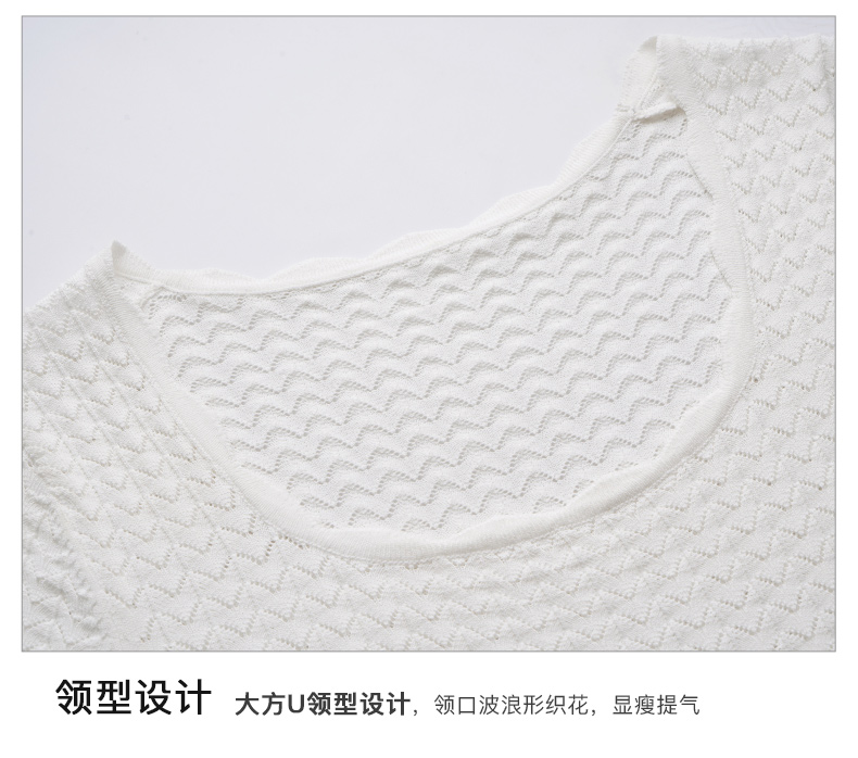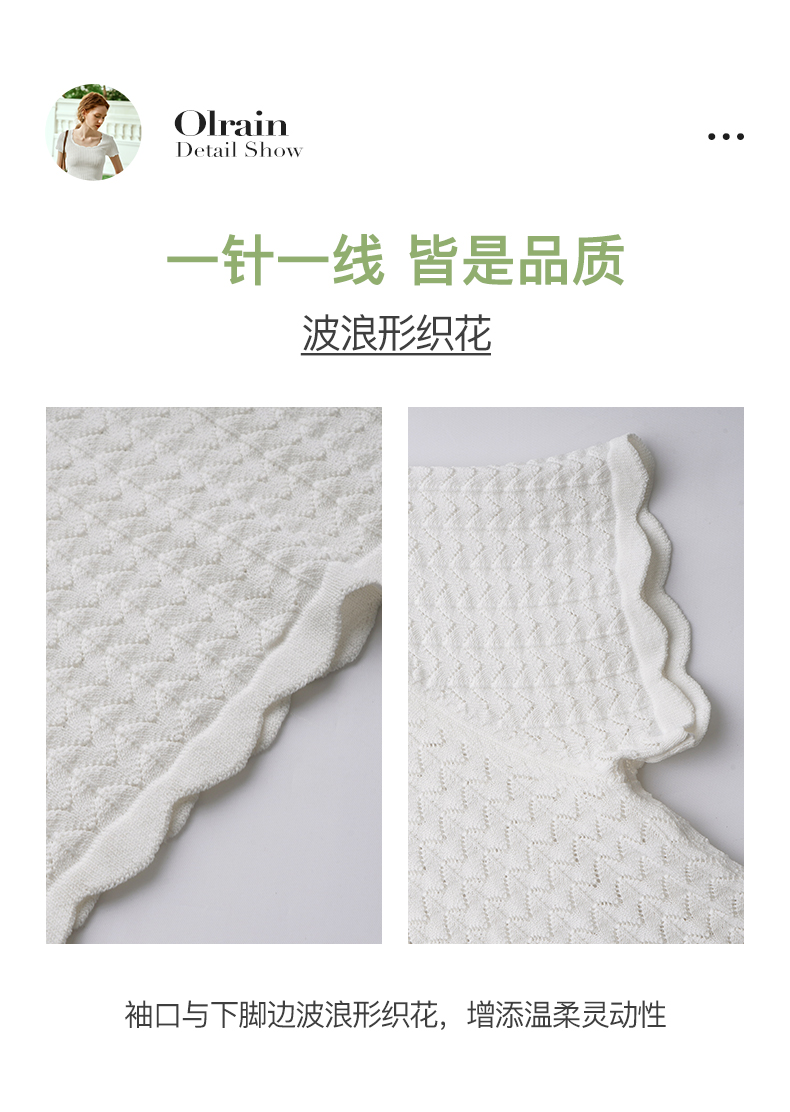 OLrain欧芮儿杏白色U领针织衫女夏季2024年新款法式镂空简约短袖