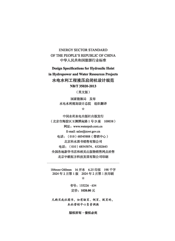 本译本是根据中国电力出版社出版的《水电水利工程液压启闭机设计规范》NBT 35020—2013翻译的,著作权归国家能源局所有。在使用过程中,如出现异议,以中文版为准。