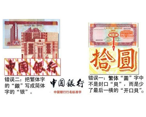 错误一:中国銀行发行的10元券中,中銀大厦图案上的“中国银行”行名标准字体出现了严重的错误,把繁体字的“銀”写成简体字的“银”。中国銀行是世界知名银行,有统一的企业形象。“中国銀行”四字是由郭沫若先生题写的,属标准标识,不得更改。而10元券钞中的“中国银行”四个字却出现如此纰漏,每处错误在放大镜下均清晰可见。