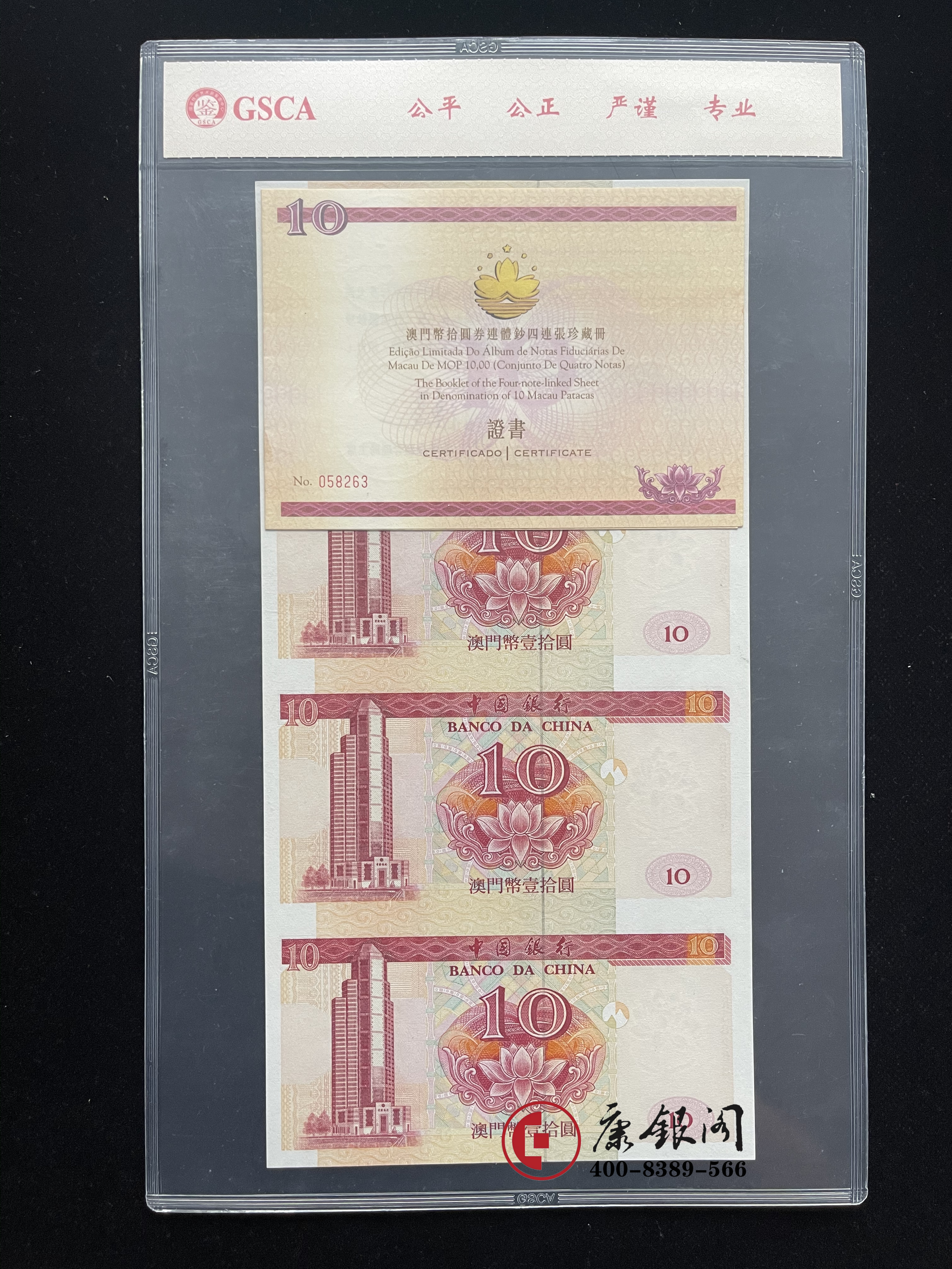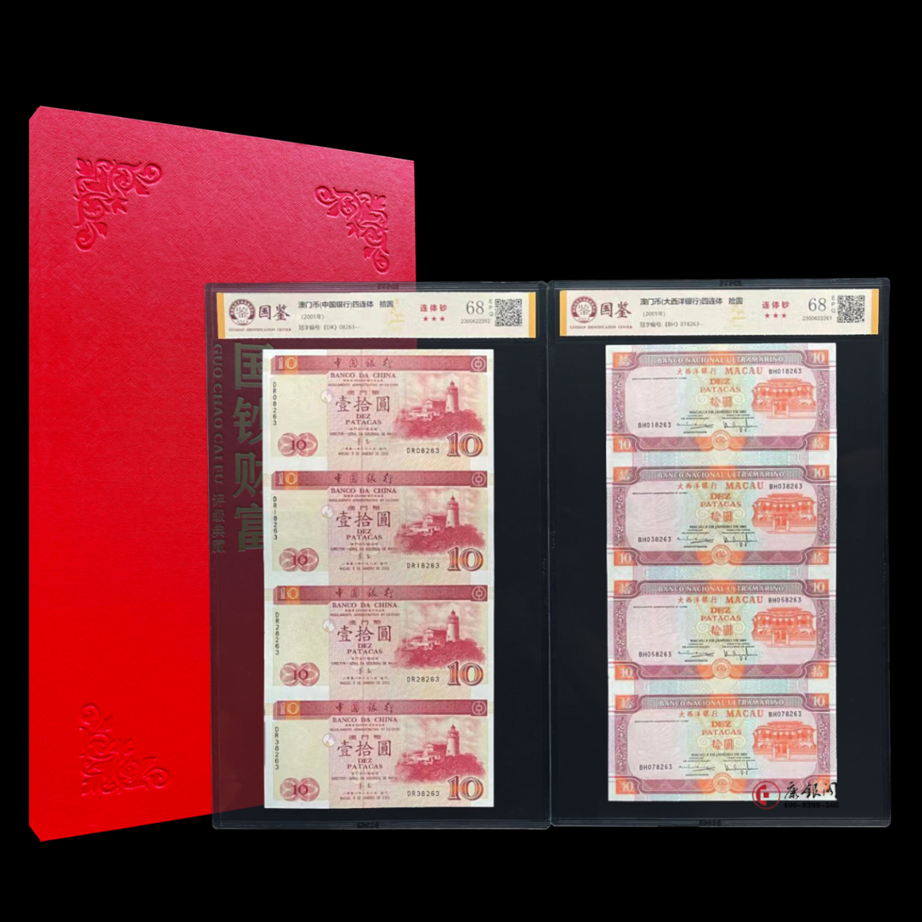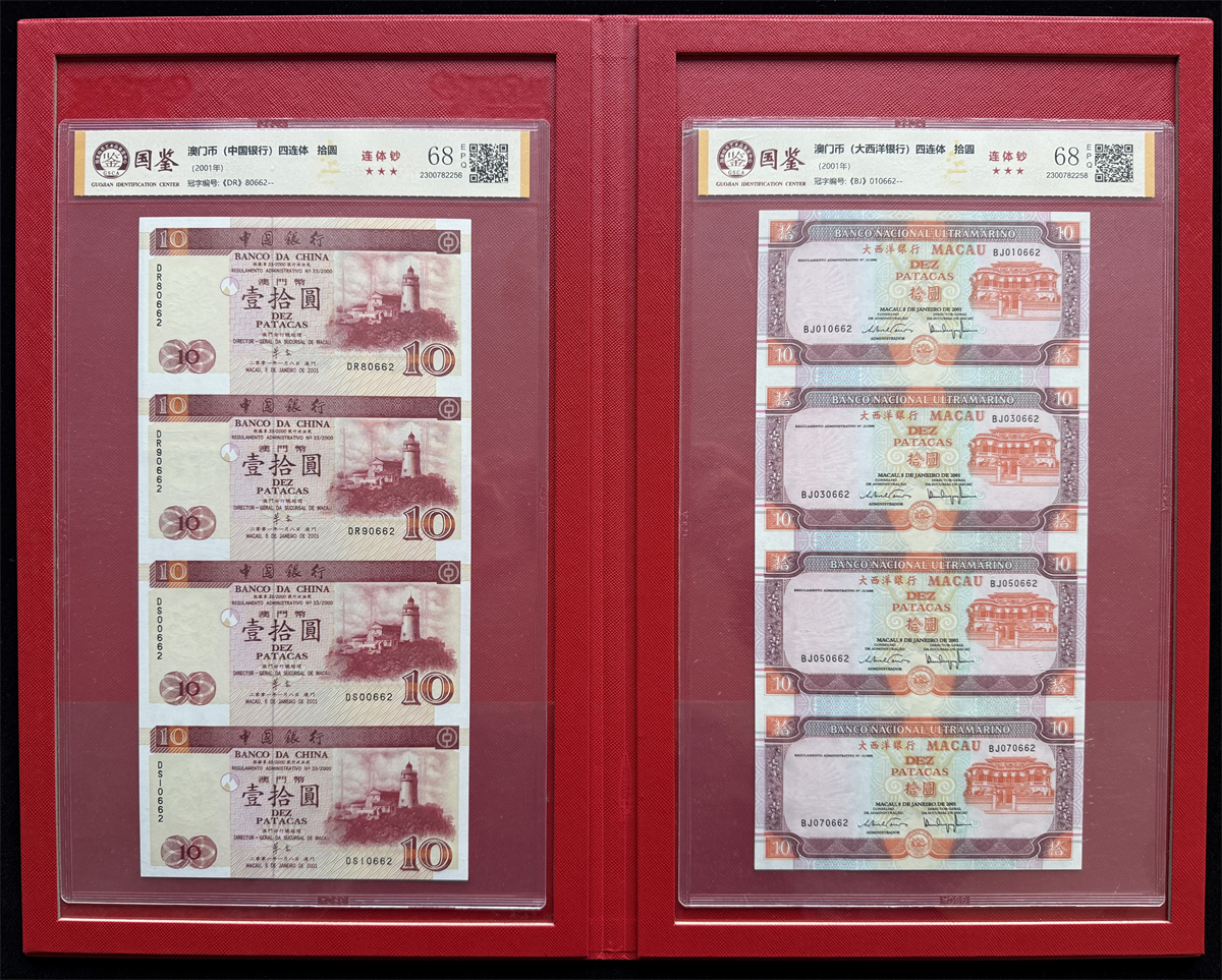 【藏品名称】 澳门币拾圆劵四连体珍藏册(简称澳门双错四连体)