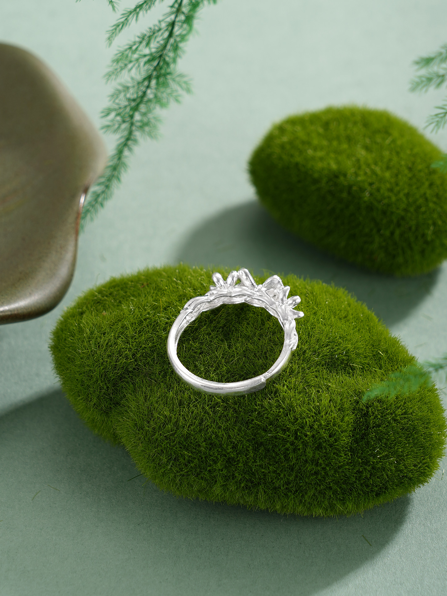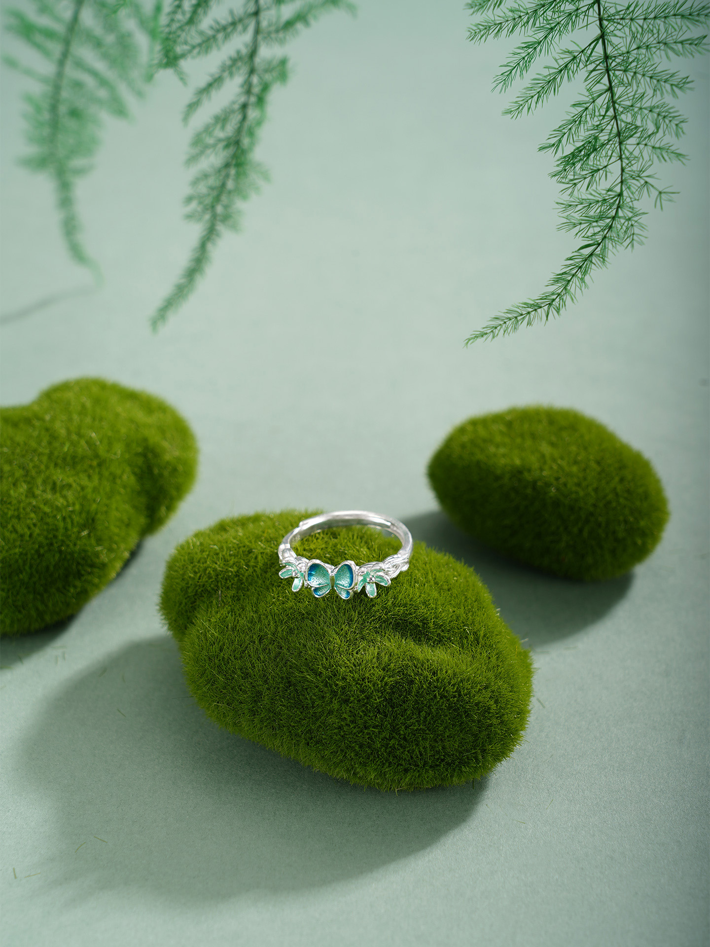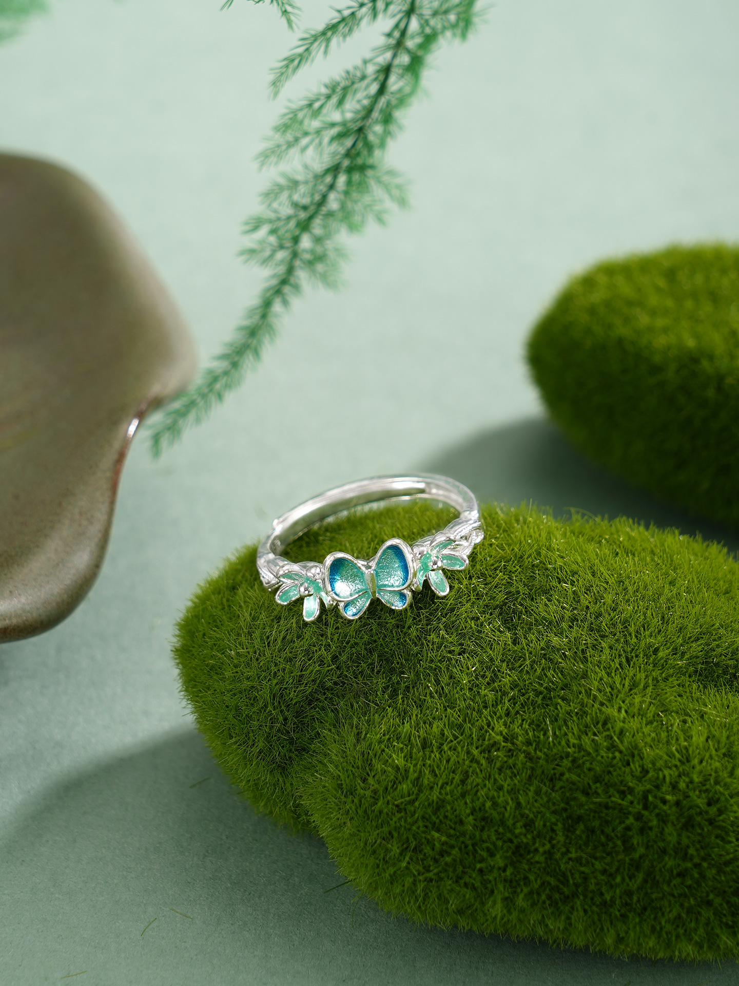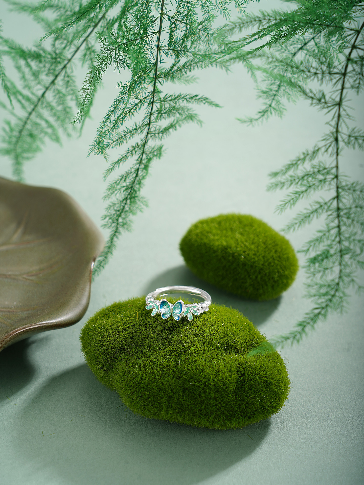 【寓意】:采用银花丝珐琅彩工艺,花与蝶巧妙融合。蝶舞花香,轻盈灵动之态跃然指间。寓意芬芳花间舞不歇,美满自由情真切。