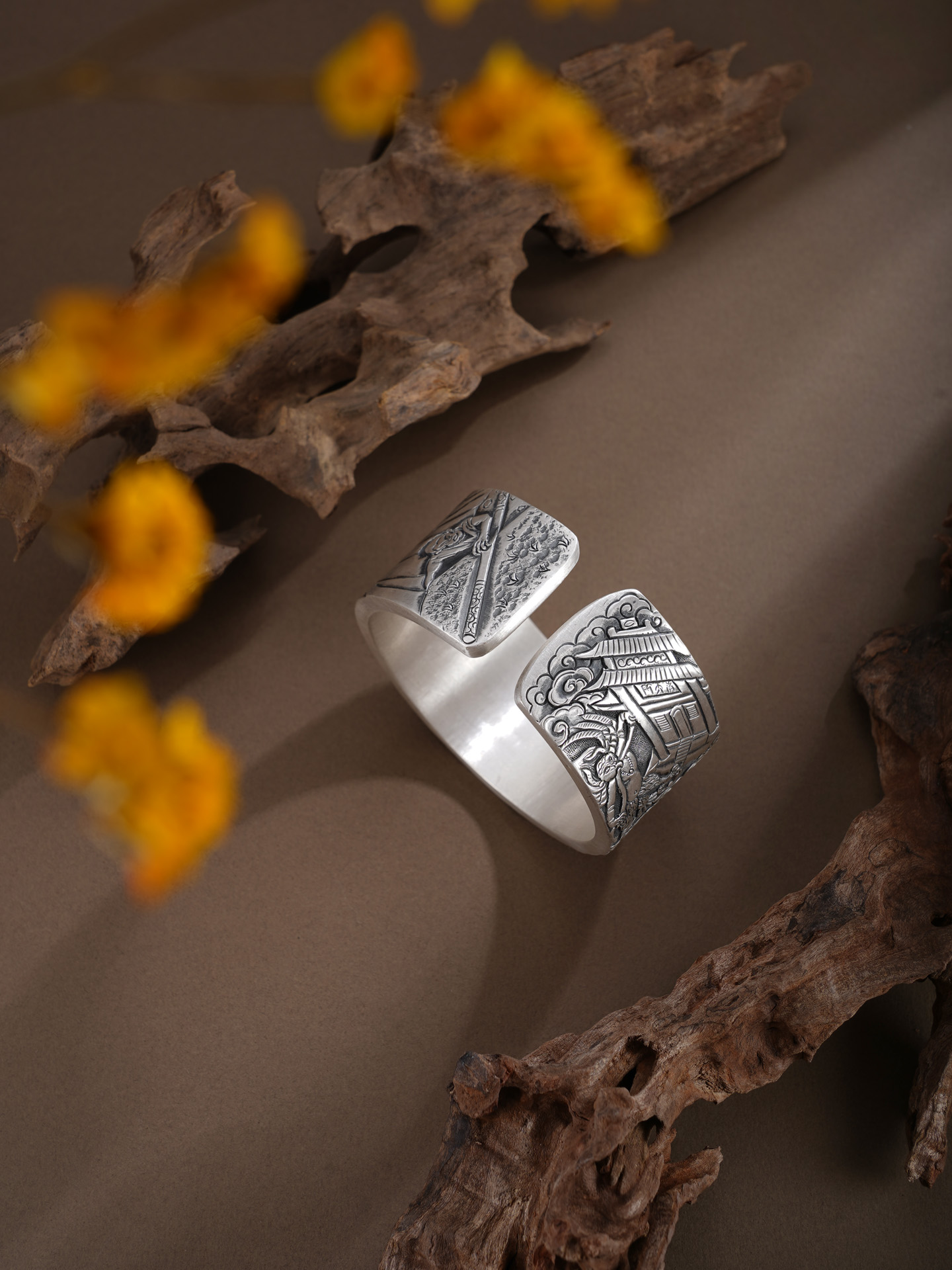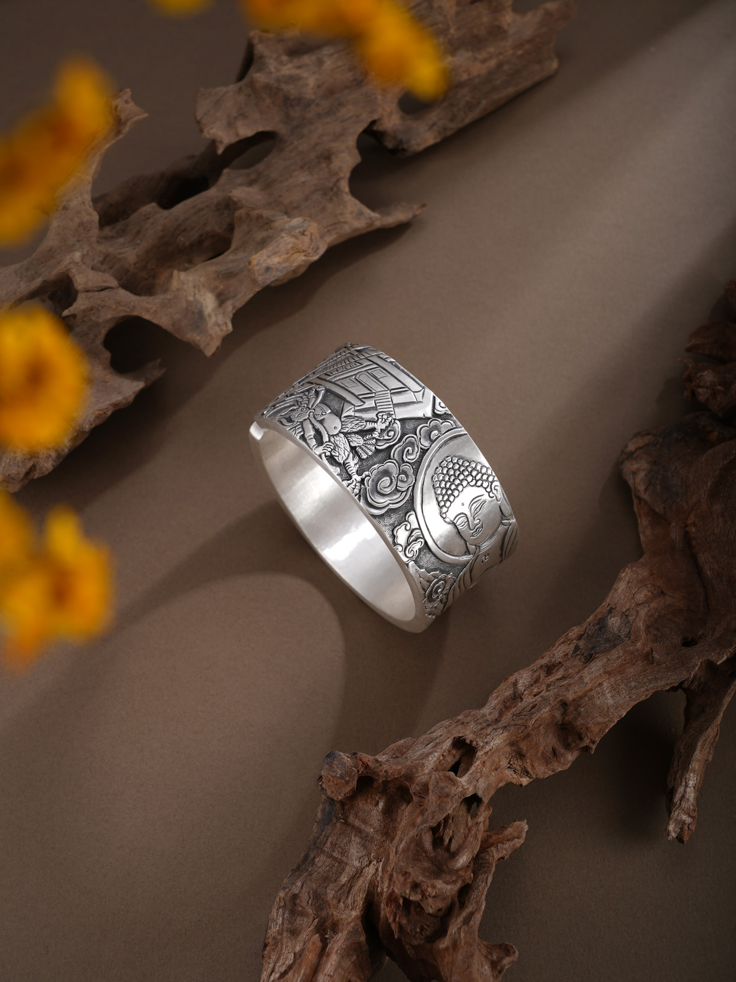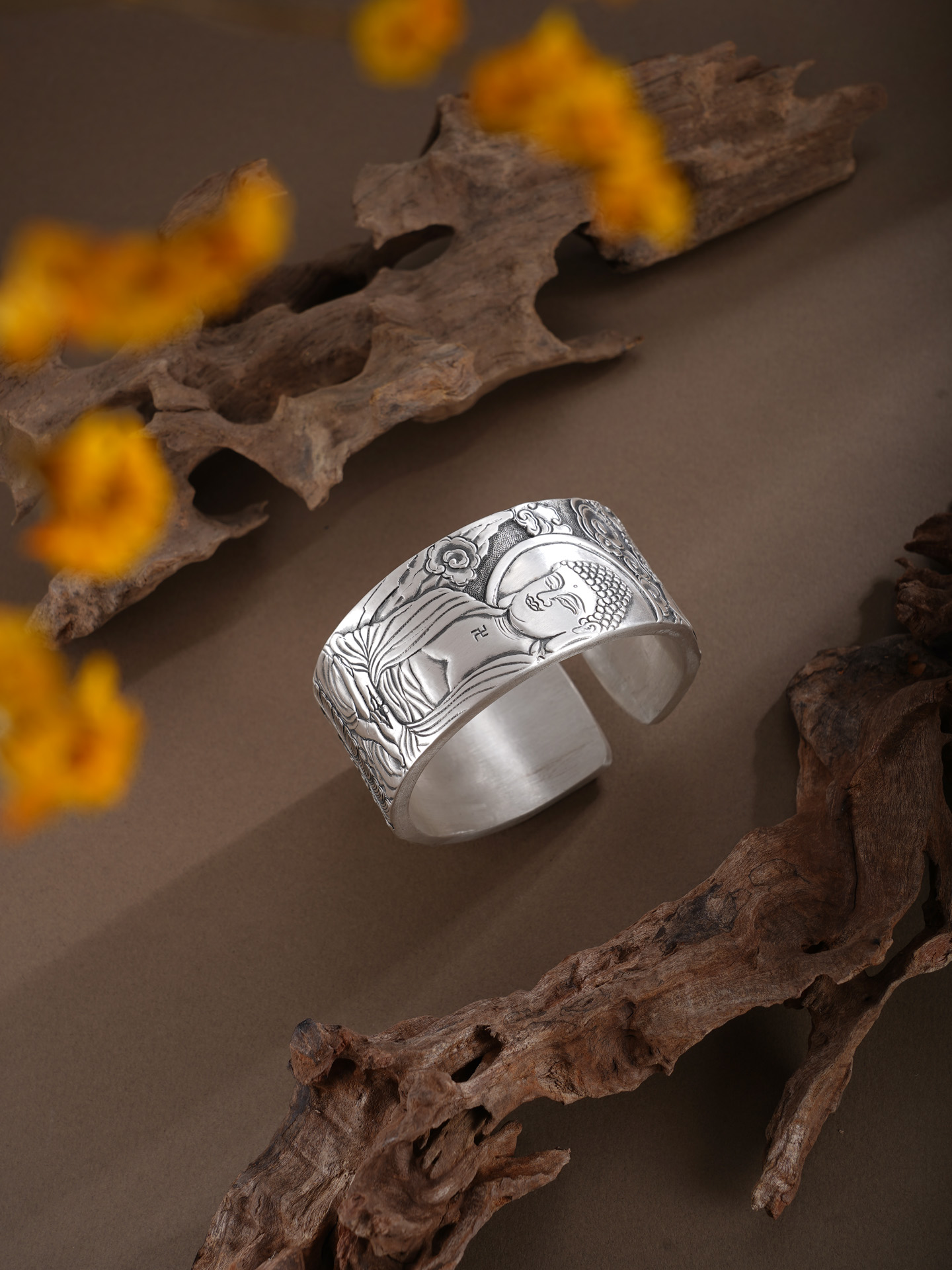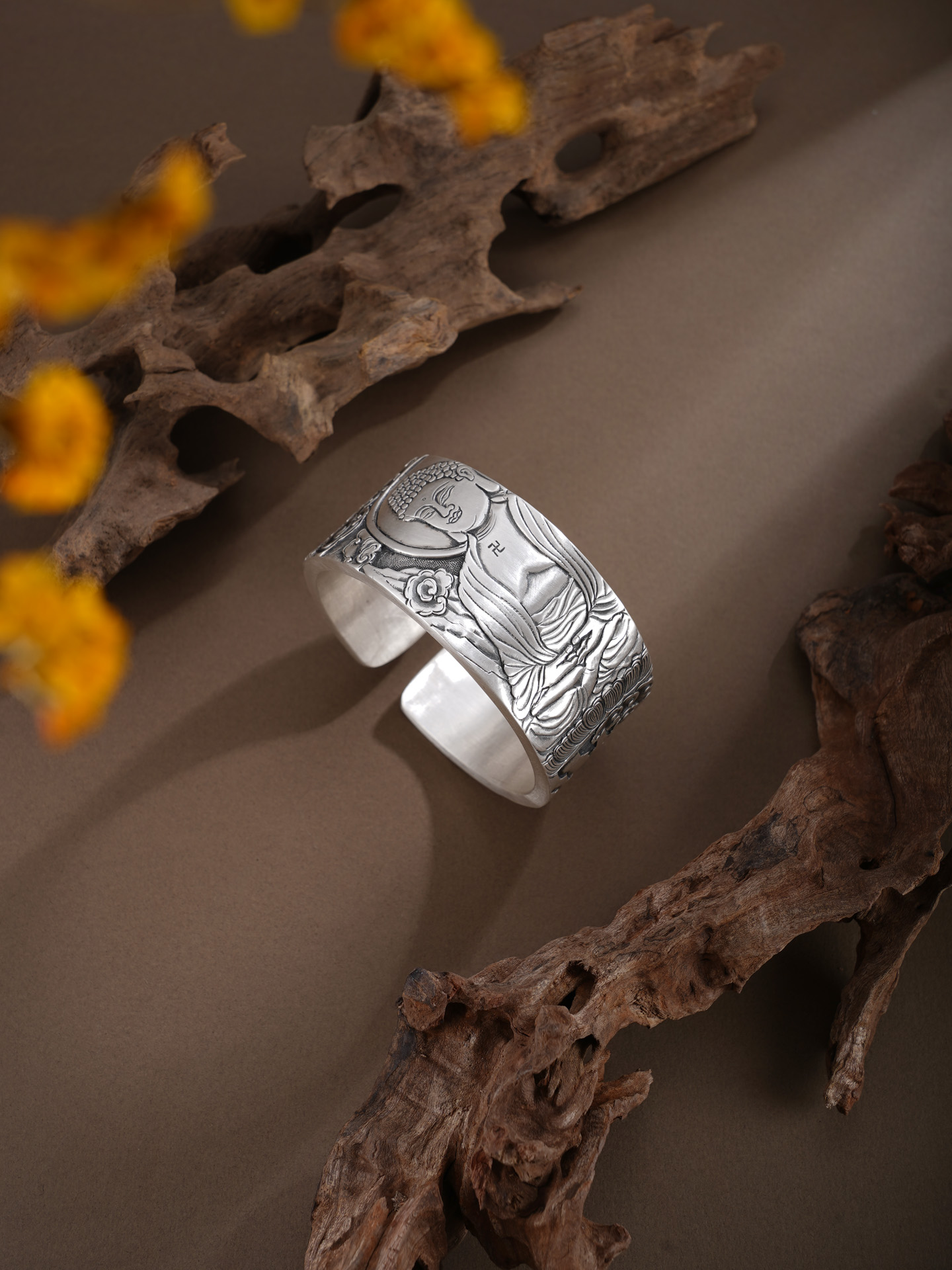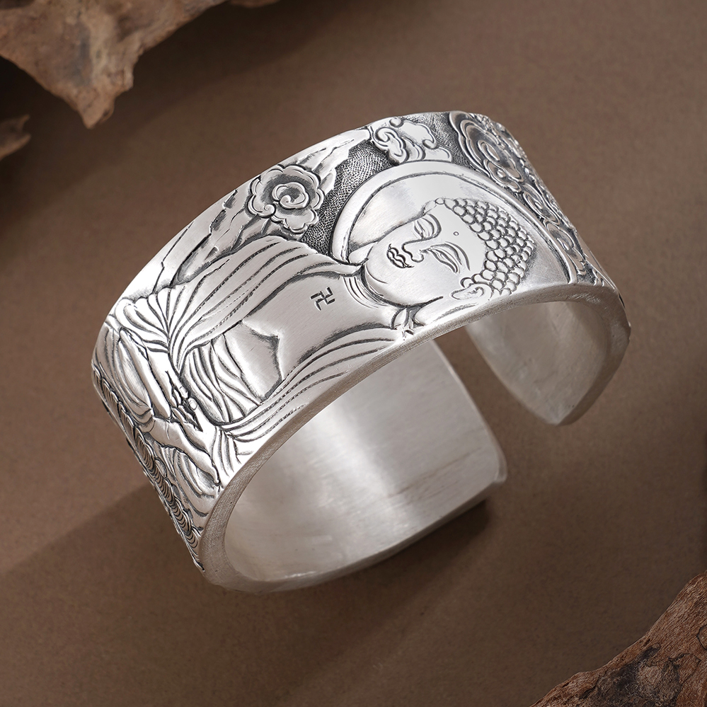 【寓意】:作品以佛祖结跏趺坐(双盘坐姿)为灵感之源,此乃佛陀修行证道之根本坐姿。匠人以錾刻工艺精琢,勾勒佛祖神性静坐之态。錾刀游走间,既显"禅定自然"之境,亦达内心宁静、智慧圆明、超脱尘俗之妙。