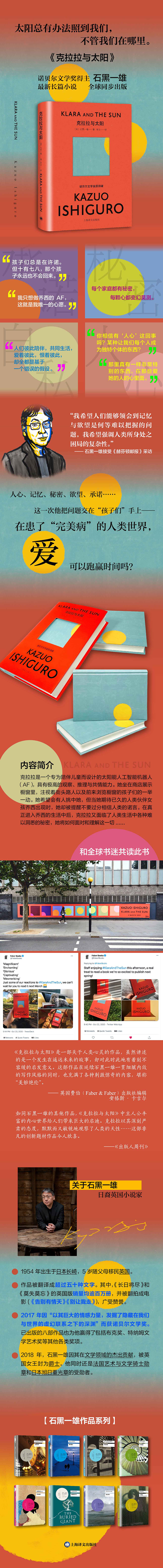 “太阳总有办法照到我们,不管我们在哪里。” 克拉拉是一个专为陪伴儿童而设计的太阳能人工智能机器人(AF),具有极高的观察、推理与共情能力。她坐在商店展示橱窗里,注视着街头路人以及前来浏览橱窗的孩子们的一举一动。她始终期待着很快就会有人挑中她,不过,当这种改变境遇的可能性出现时,克拉拉却被提醒不要过分相信人类的诺言。在《克拉拉与太阳》这部作品中,石黑一雄通过一位令人难忘的叙述者的视角,观察千变万化的现代社会,探索了一个根本性的问题:究竟什么是爱?