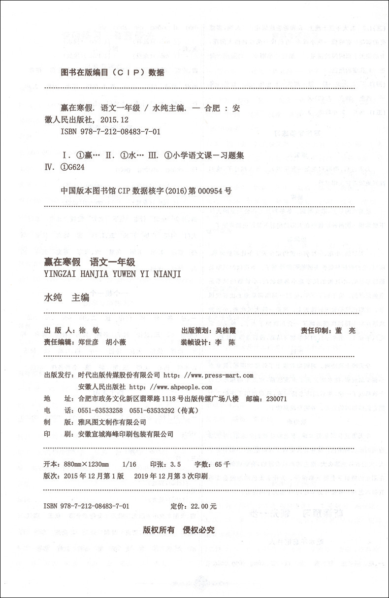 2020新版上海小学寒假作业 语文 1年级/一年级 赢在寒假 小学生寒假作业本练习册 基础巩固拓展提升新课预习 安徽人民出版社