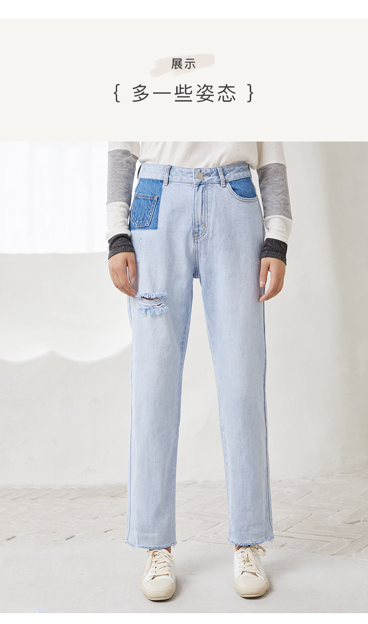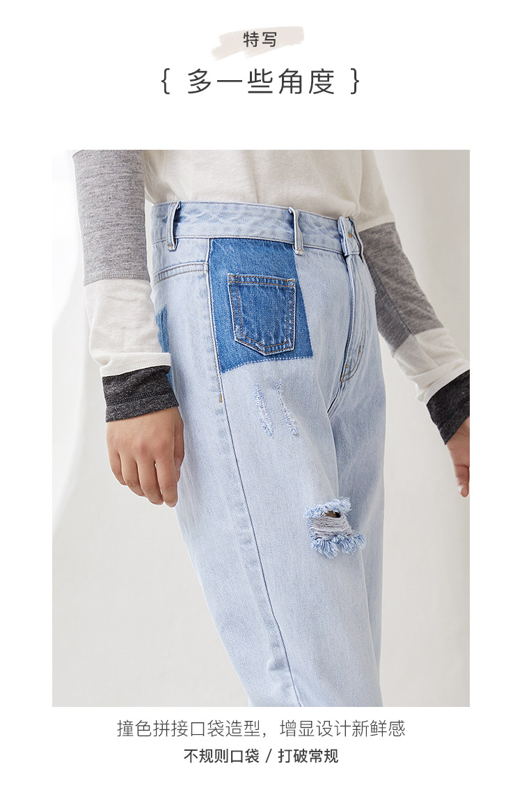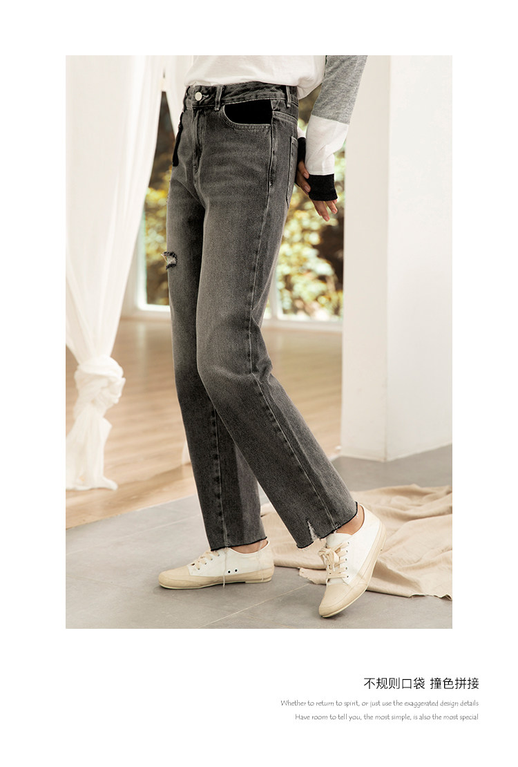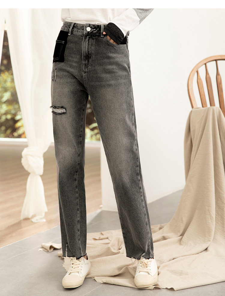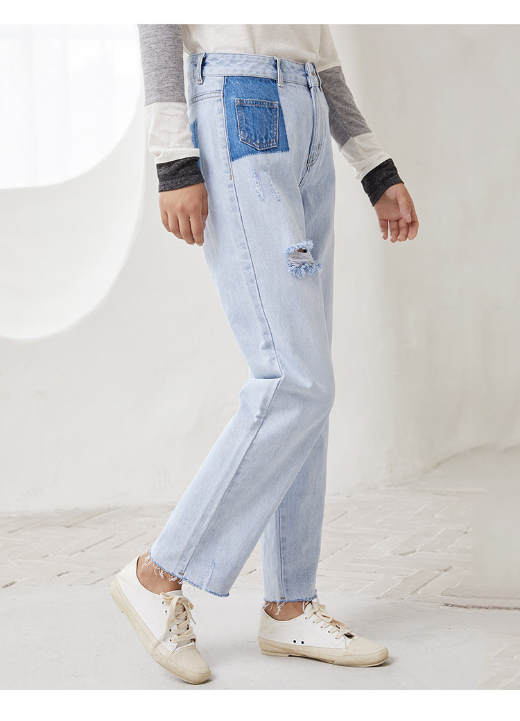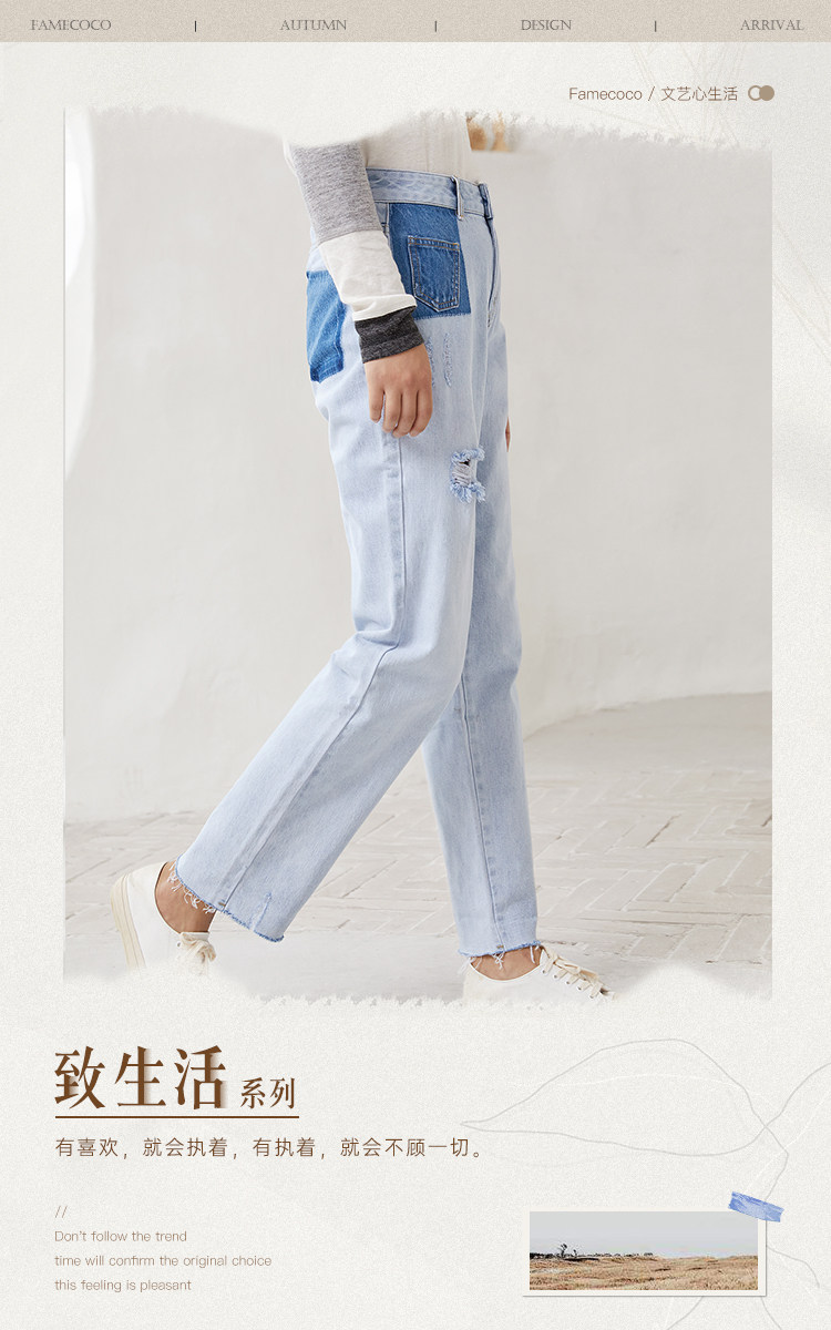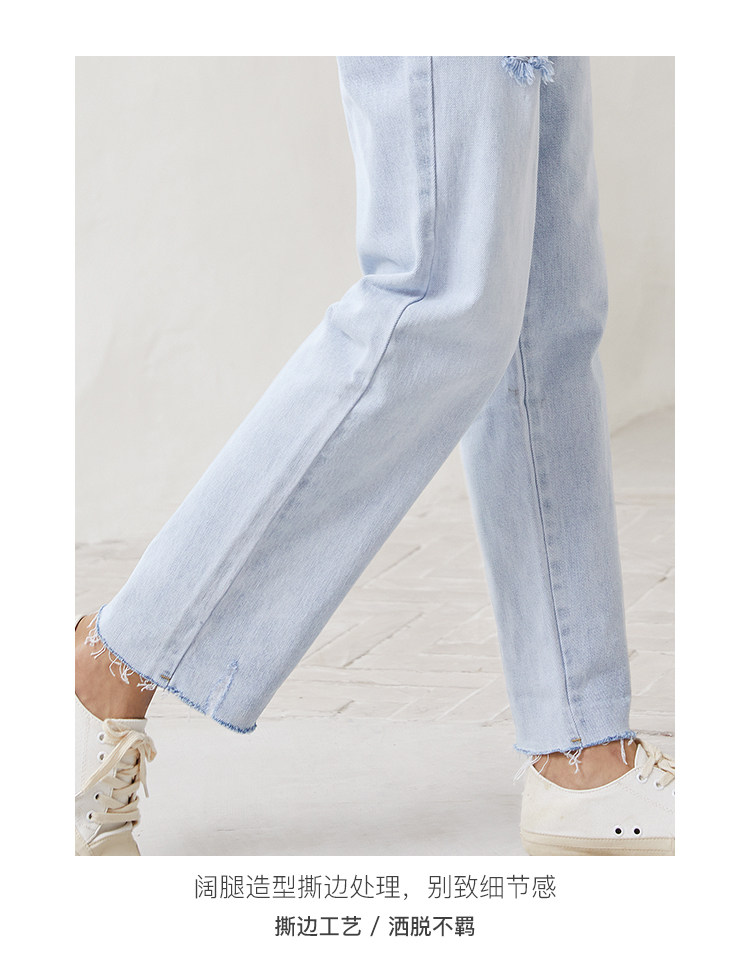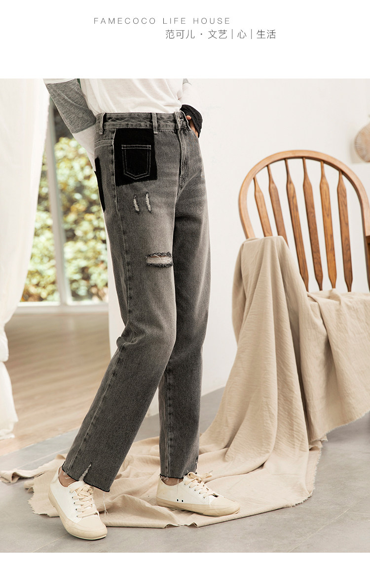Famecoco范可儿直筒牛仔裤女破洞毛边设计感F205GA021
