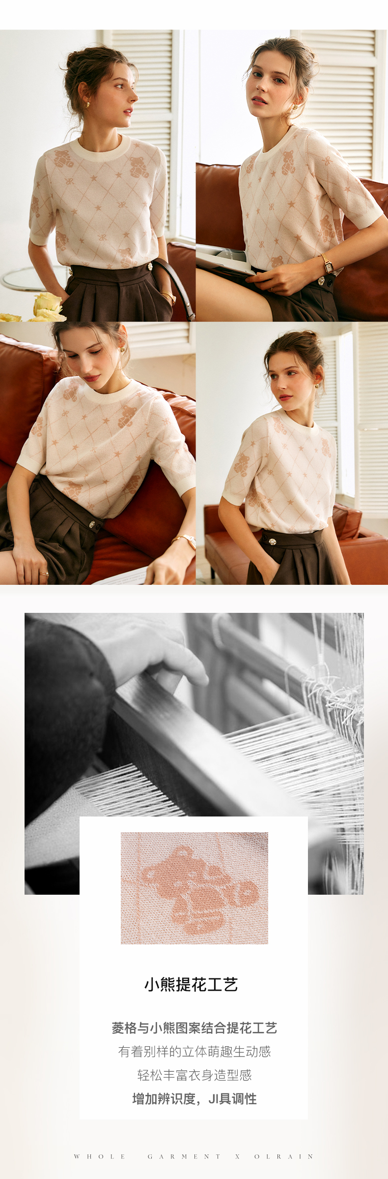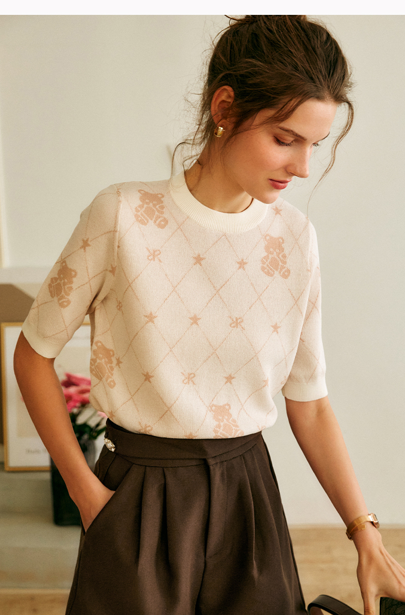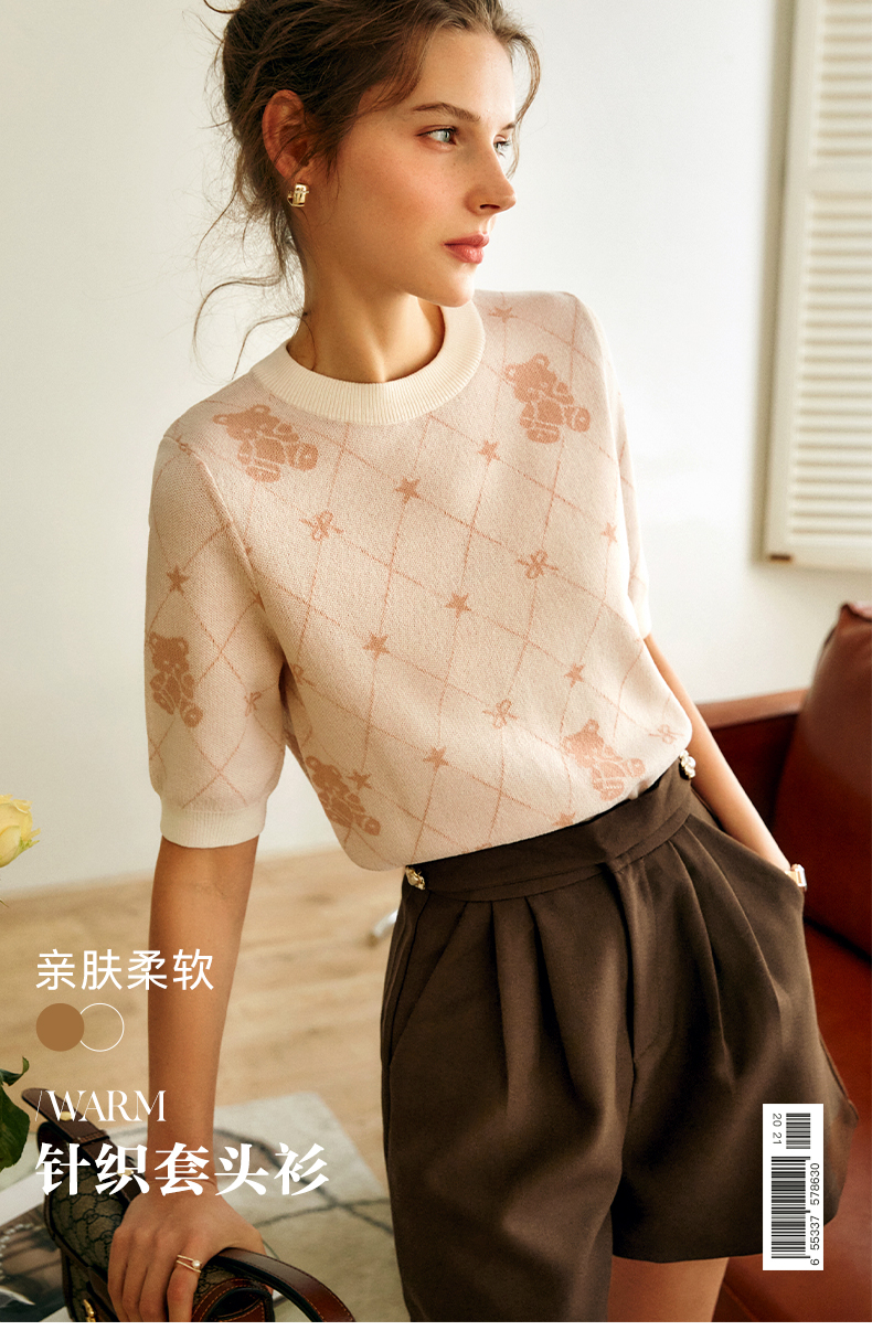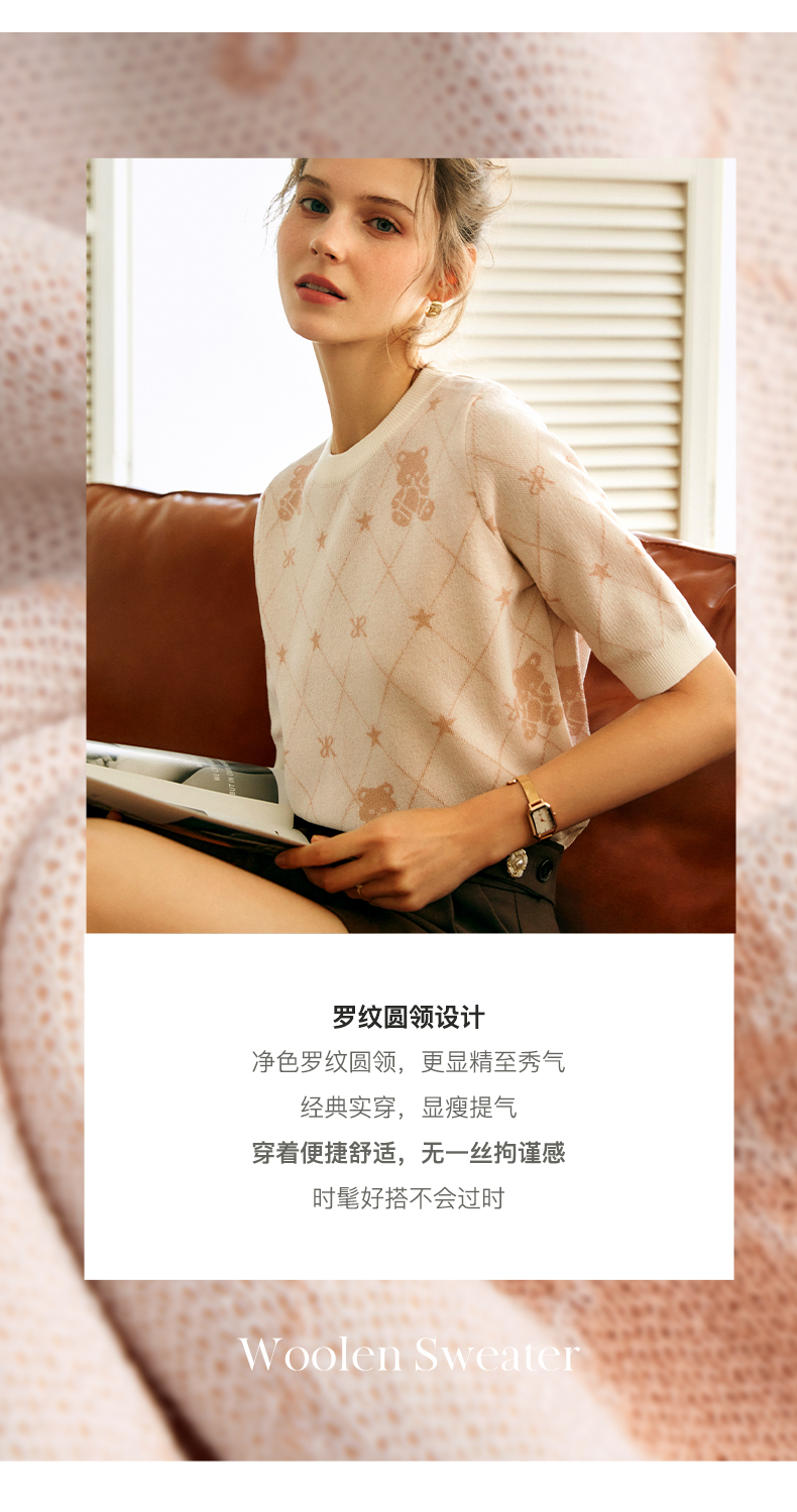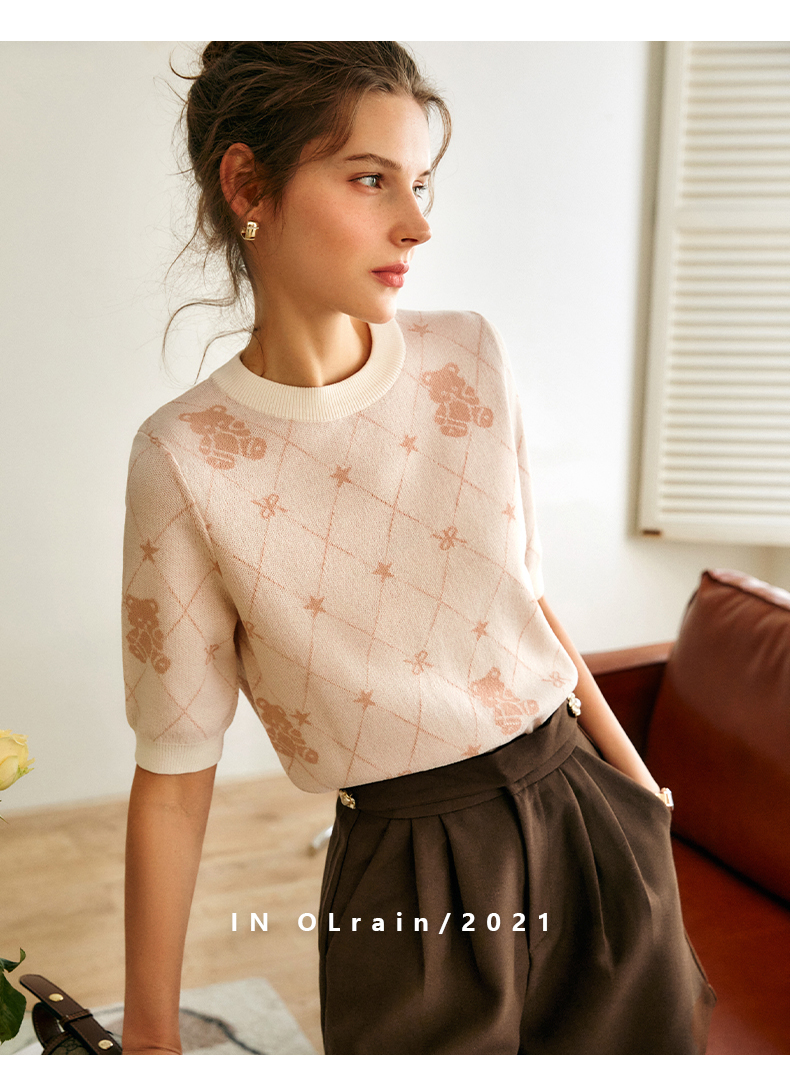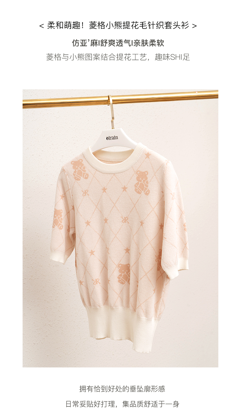 OLrain法式高级穿搭短袖针织衫女2022年夏季新款圆领菱格提花毛衣