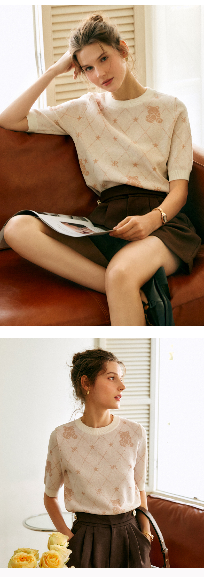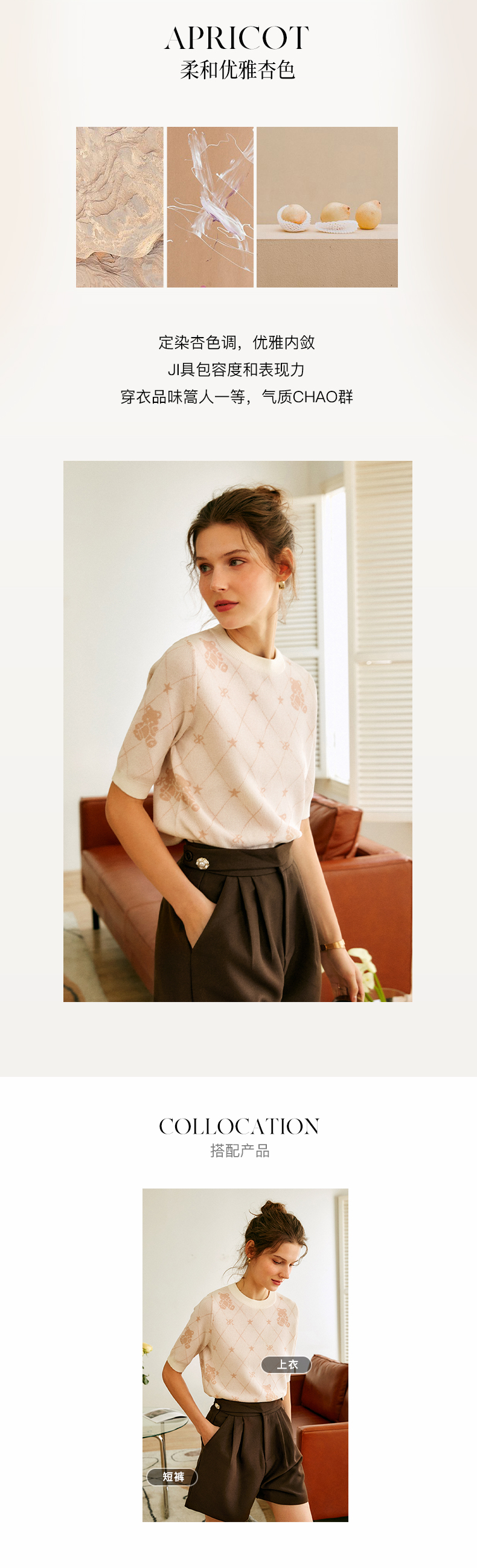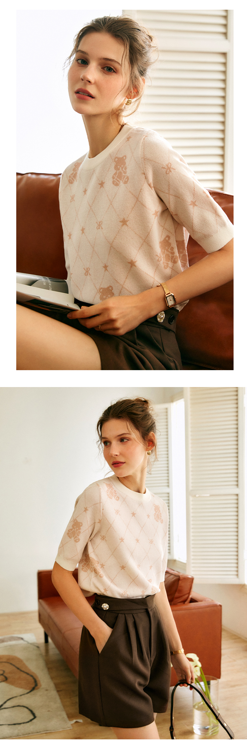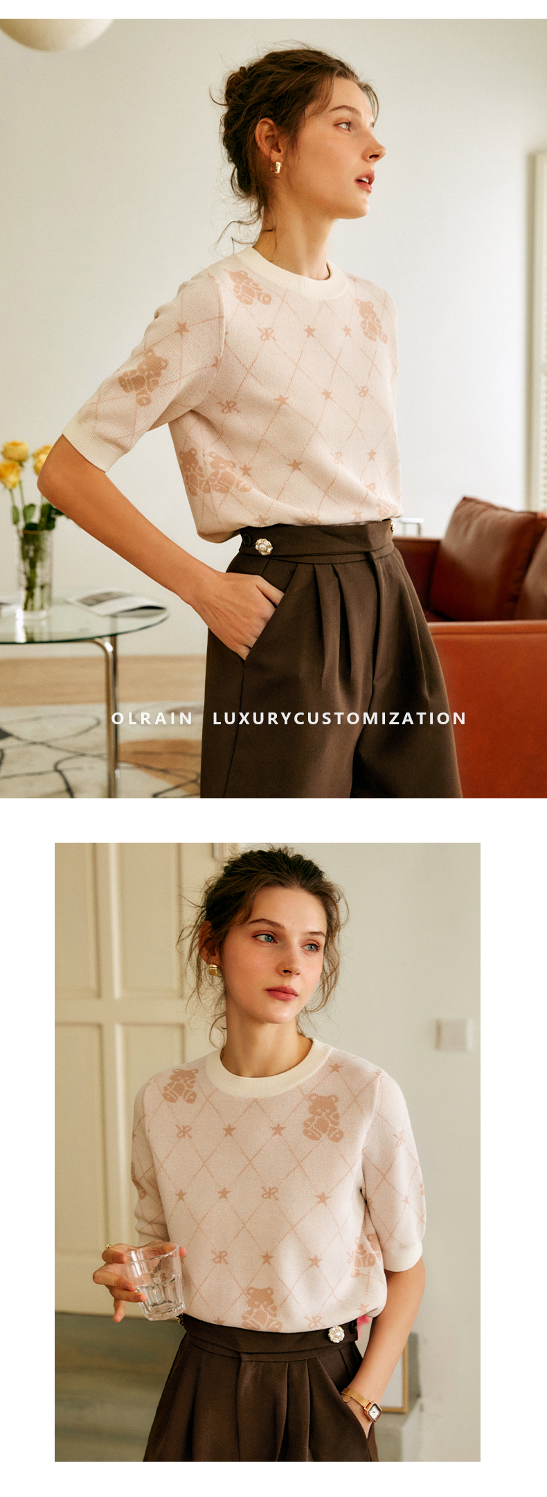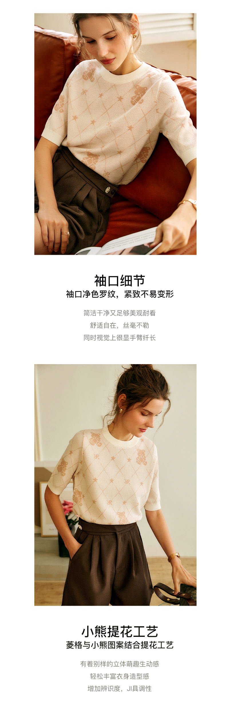 OLrain法式高级穿搭短袖针织衫女2022年夏季新款圆领菱格提花毛衣