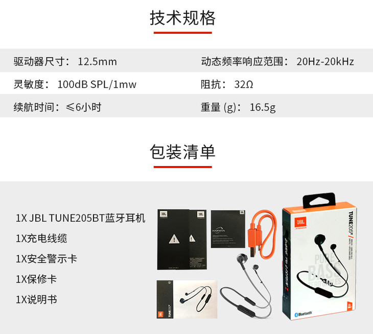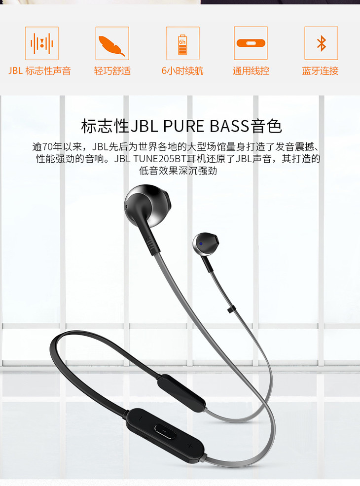 JBL TUNE205BT无线蓝牙半入耳式运动耳机
