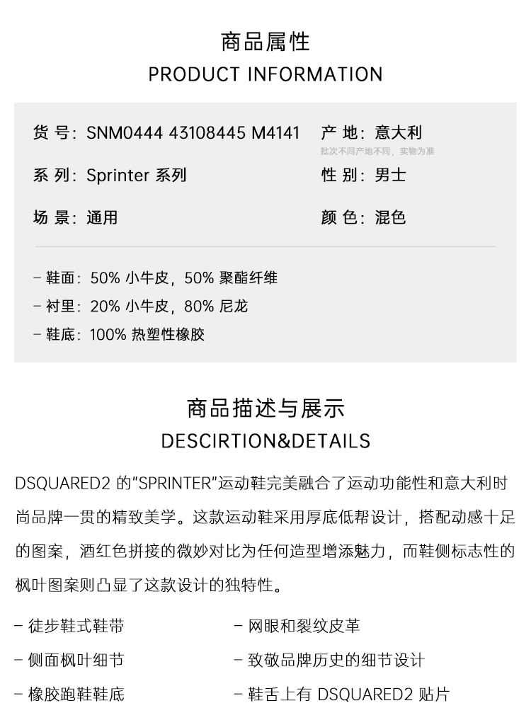 DSQUARED2 男士 Sprinter系列 枫叶徽标休闲运动鞋 混色 SNM0444 43108445 M4141