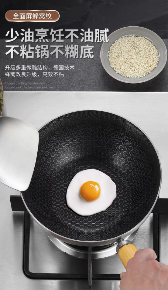 不粘的原因就是全面屏蜂窝纹理 密度大,抗粘性更强 煎鱼煎豆腐都不粘 炒菜特别丝滑 用钢铲炒蛤蜊这种硬物也完全不用怕 不是年抛锅~ 特别好清洗