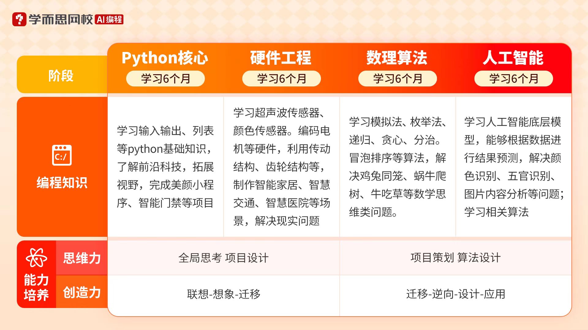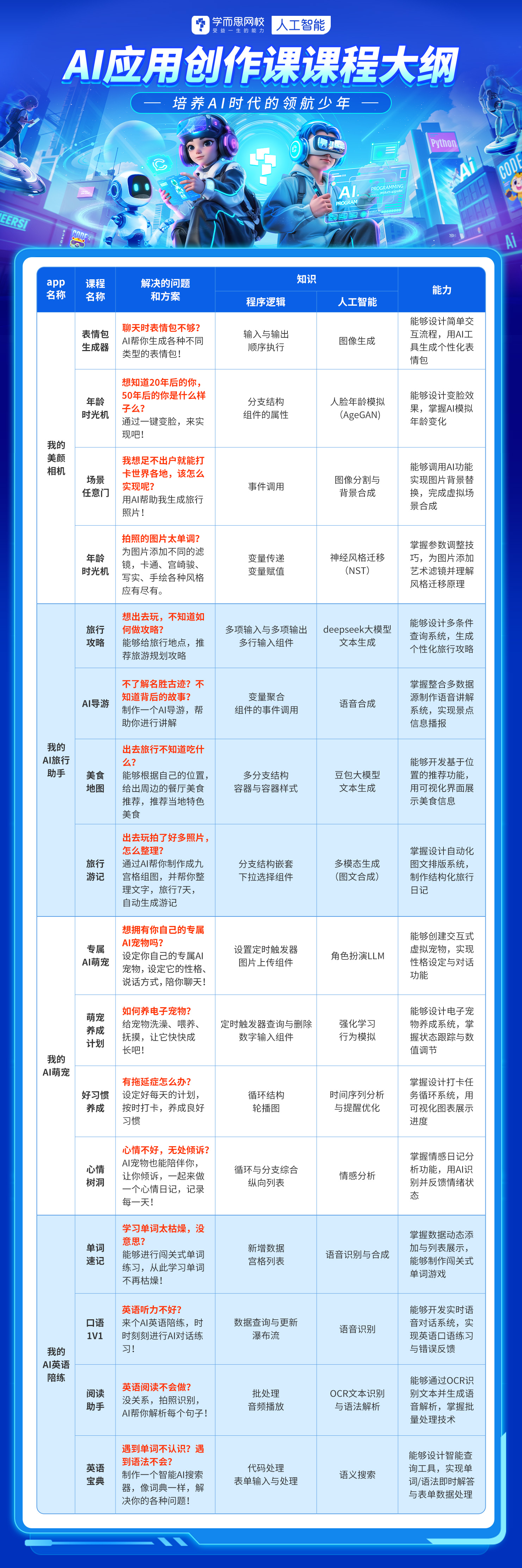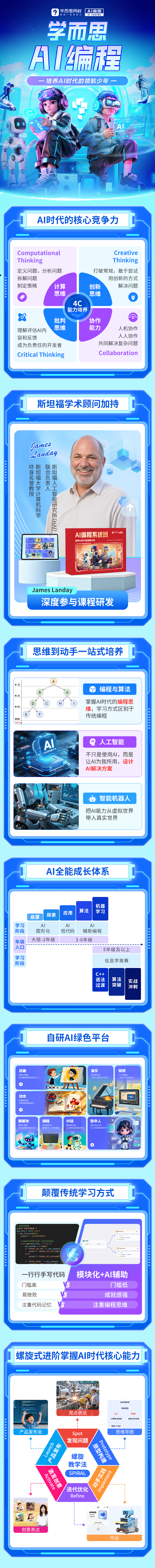 🔥🔥学而思人工智能,颠覆传统编程学习,上架即卖爆💥💥 🌟斯坦福学术顾问加持深度参与课程研发,内容涵盖AI、编程、AI机器人,软硬件结合 🌟独家绿色AI平台,内容丰富、安全,专属于孩子的AI创作平台 🌟行业首发低代码编程,写程序告别冗余代码,0基础也能轻松上手,1个月做出APP 🌟一站式带赛服务,收获AI权威赛事证书,助力评优 🌟研发、主讲、班主任全员人工智能认证讲师,效果有保障