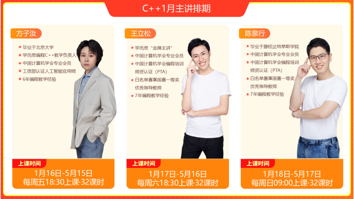 L2-L4 Python系统班:共24讲真人互动课(L2为70min),90min/讲 L5-L7 C++奥信:共16讲直播课,120分钟/讲