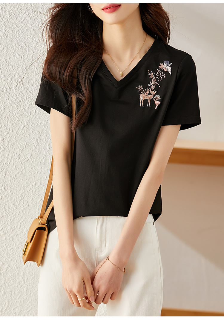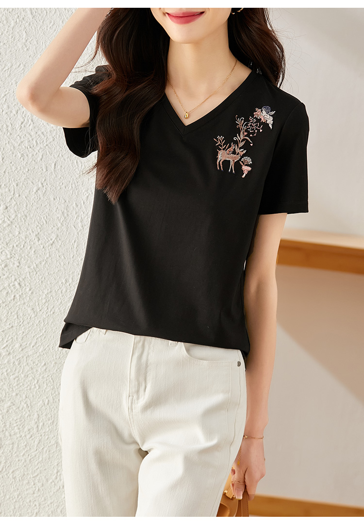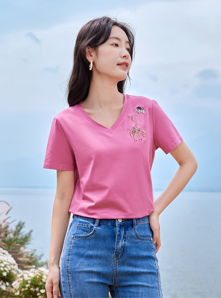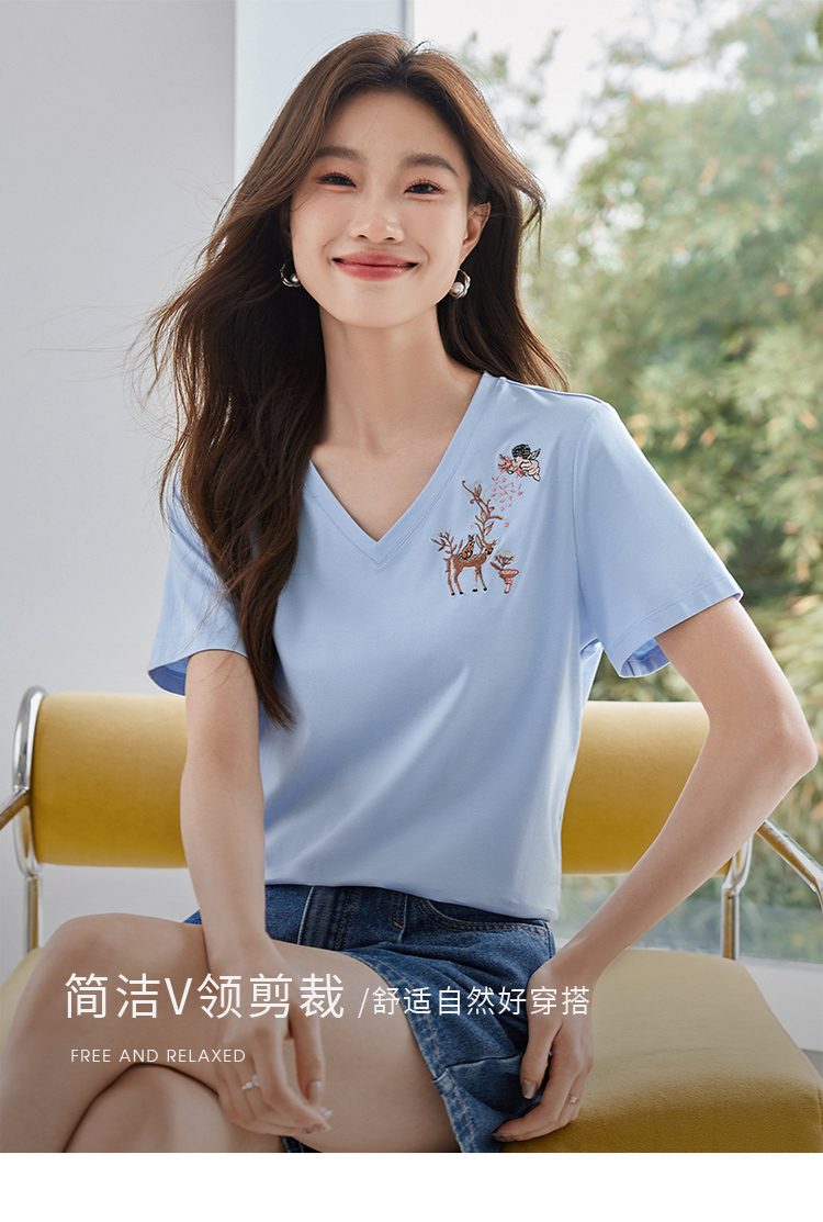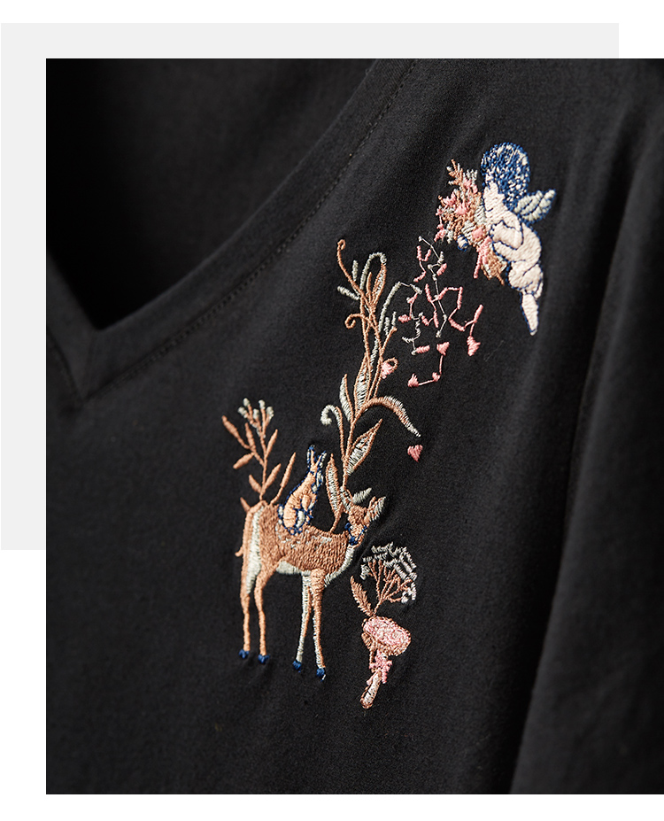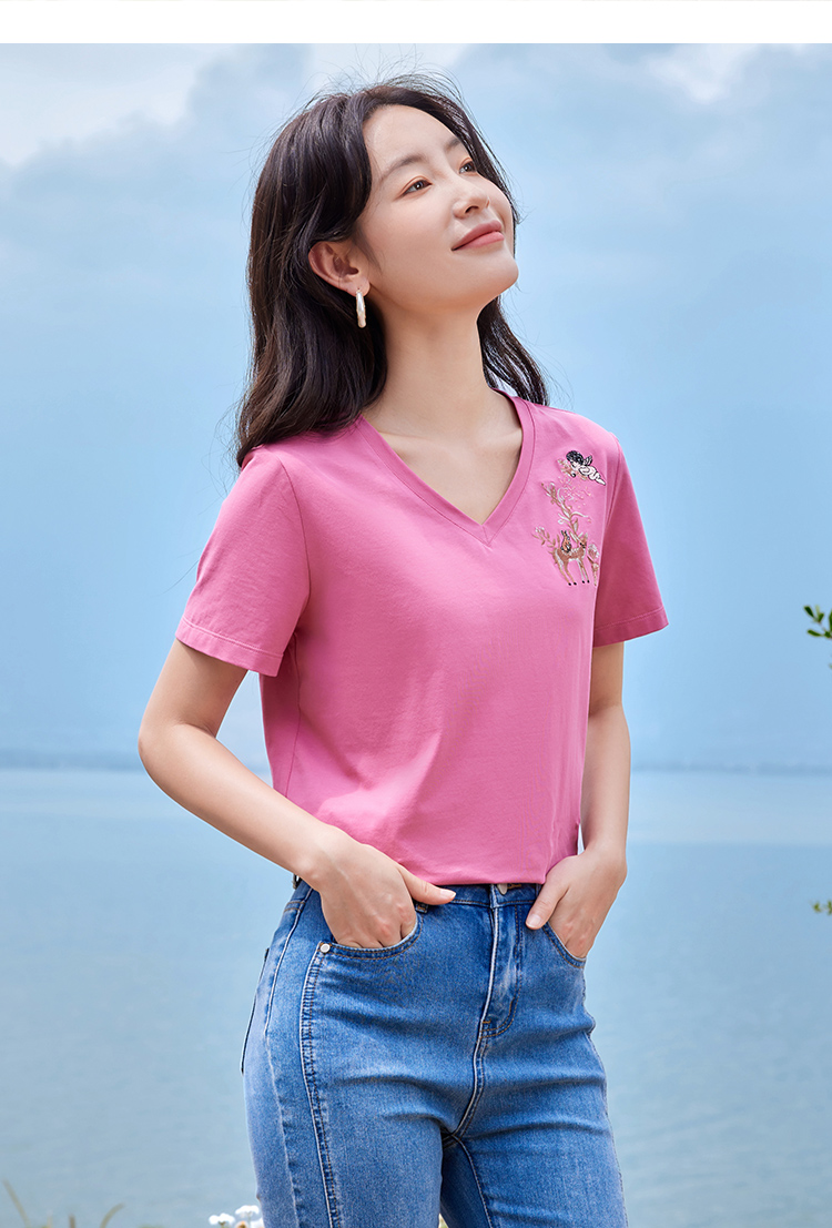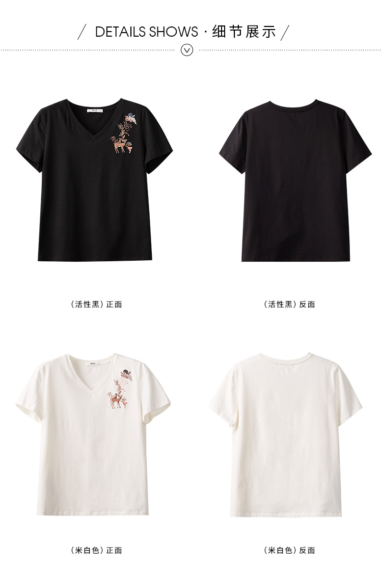 【专属特价】熙世界90%棉小鹿刺绣V领T恤女宽松显瘦减龄夏季新款中国风女大码短袖