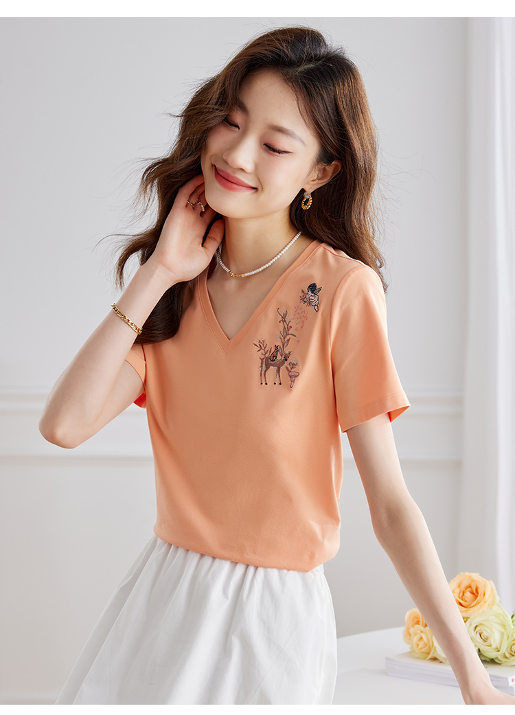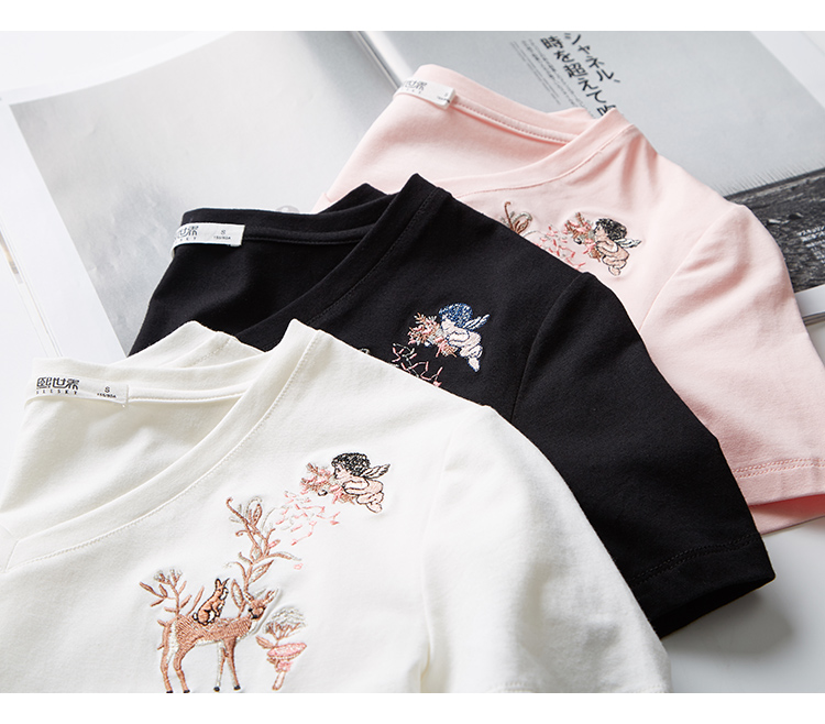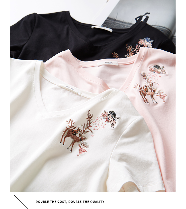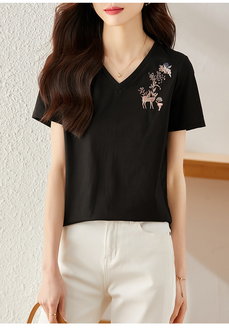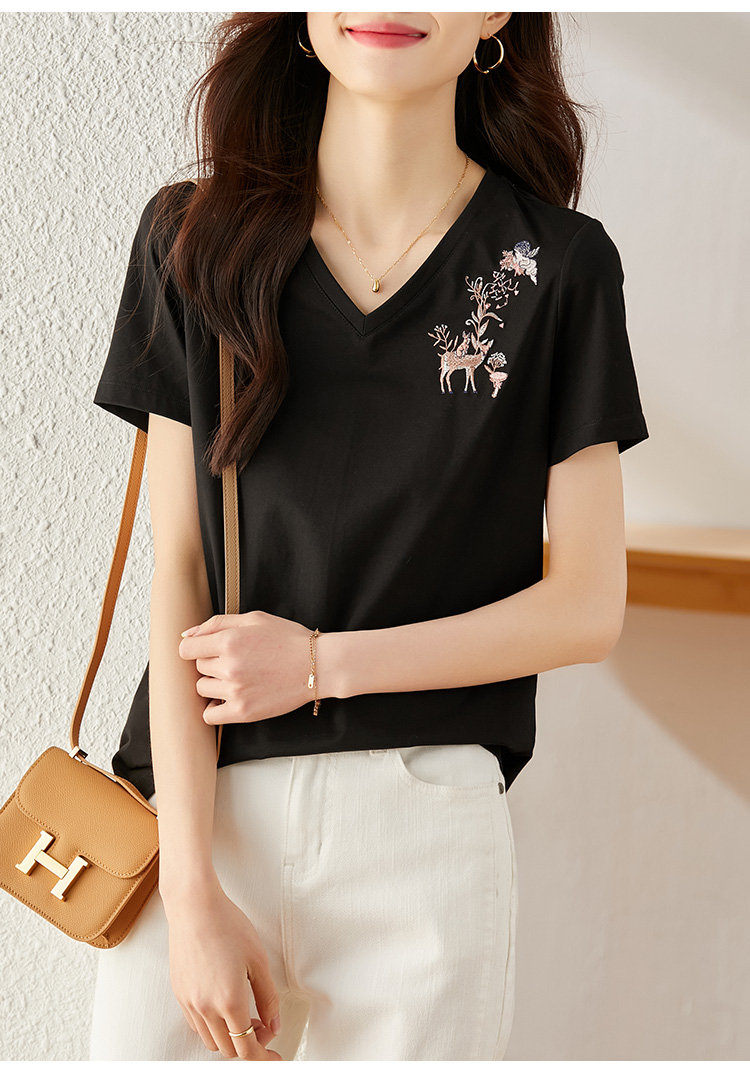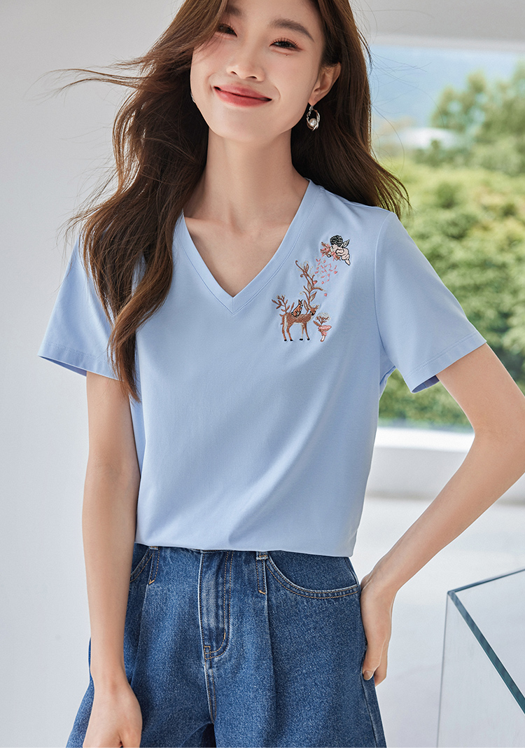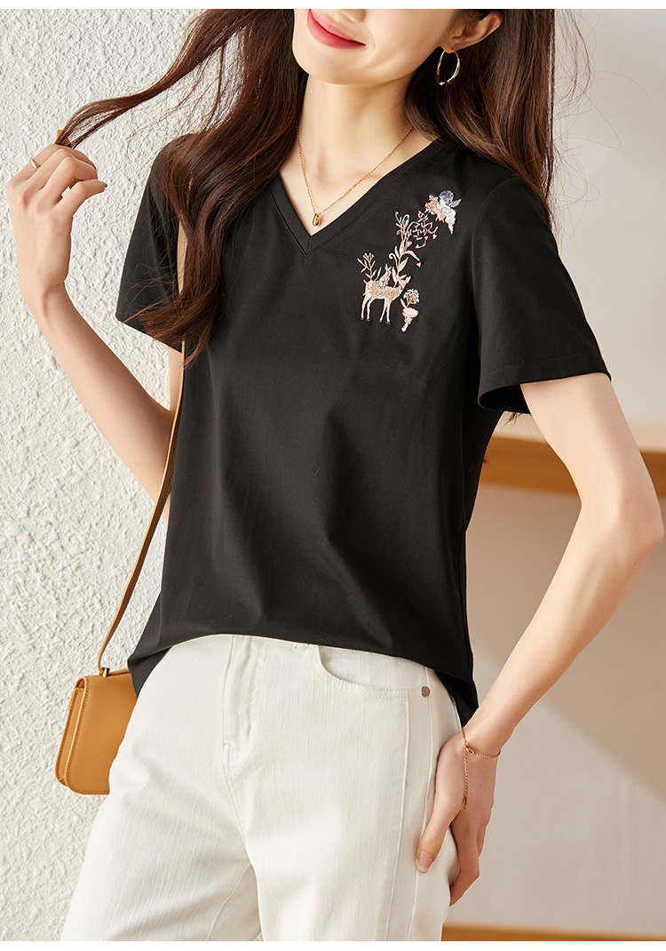 【专属特价】熙世界90%棉小鹿刺绣V领T恤女宽松显瘦减龄夏季新款中国风女大码短袖