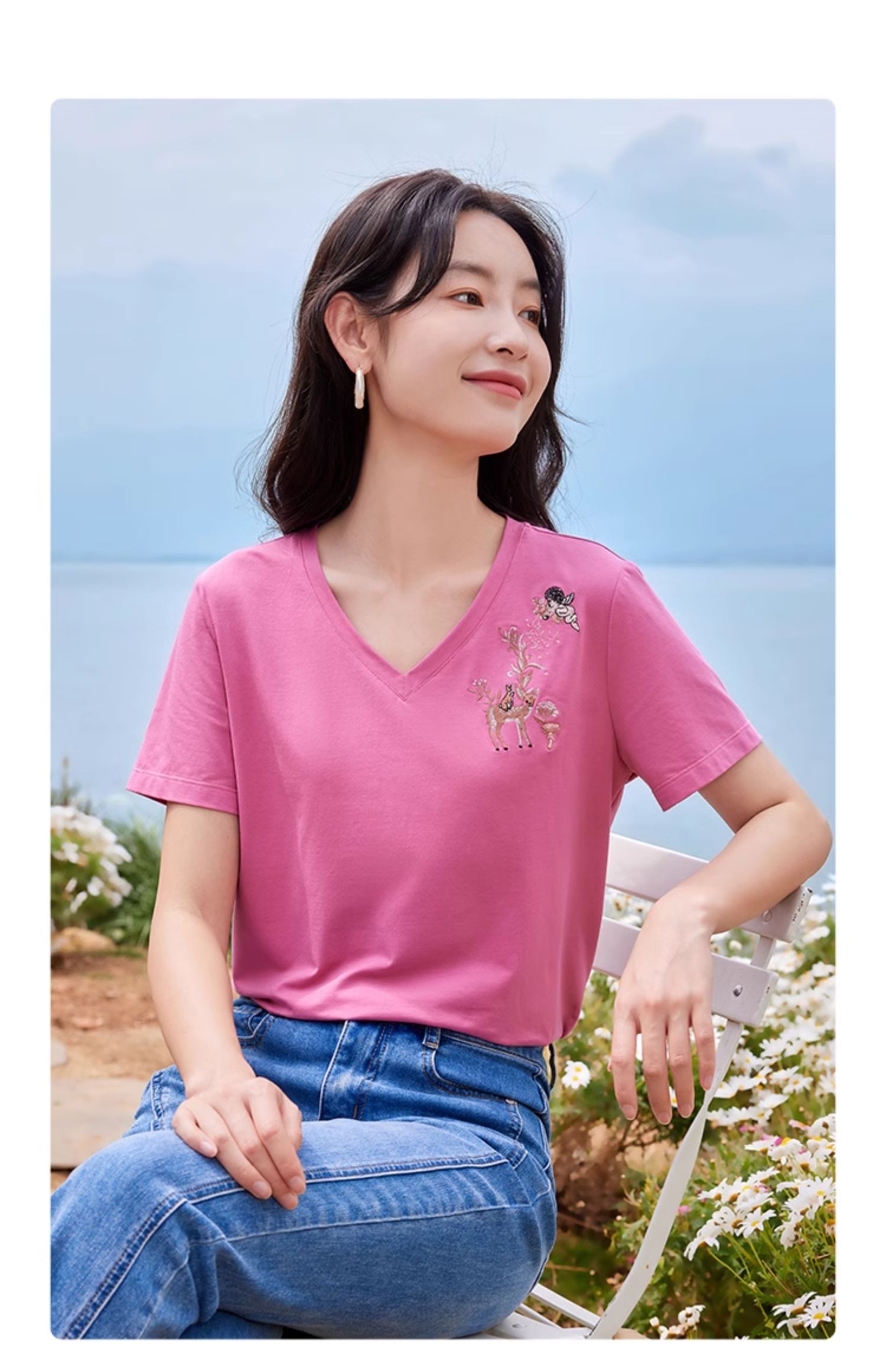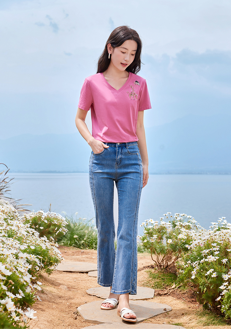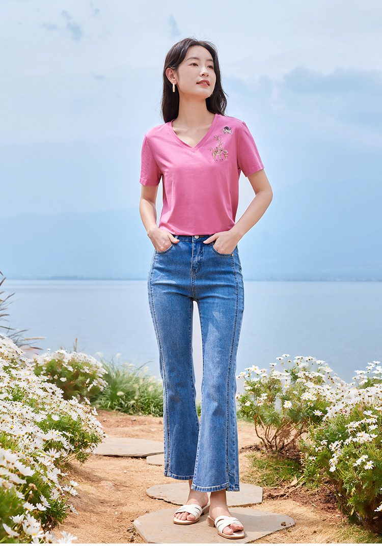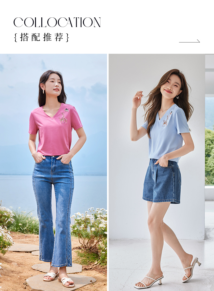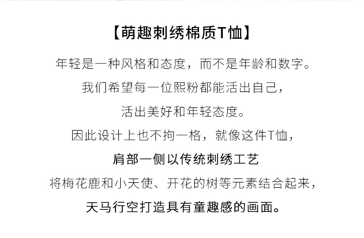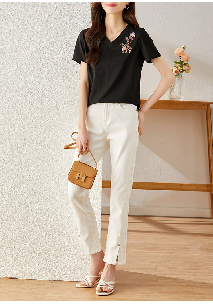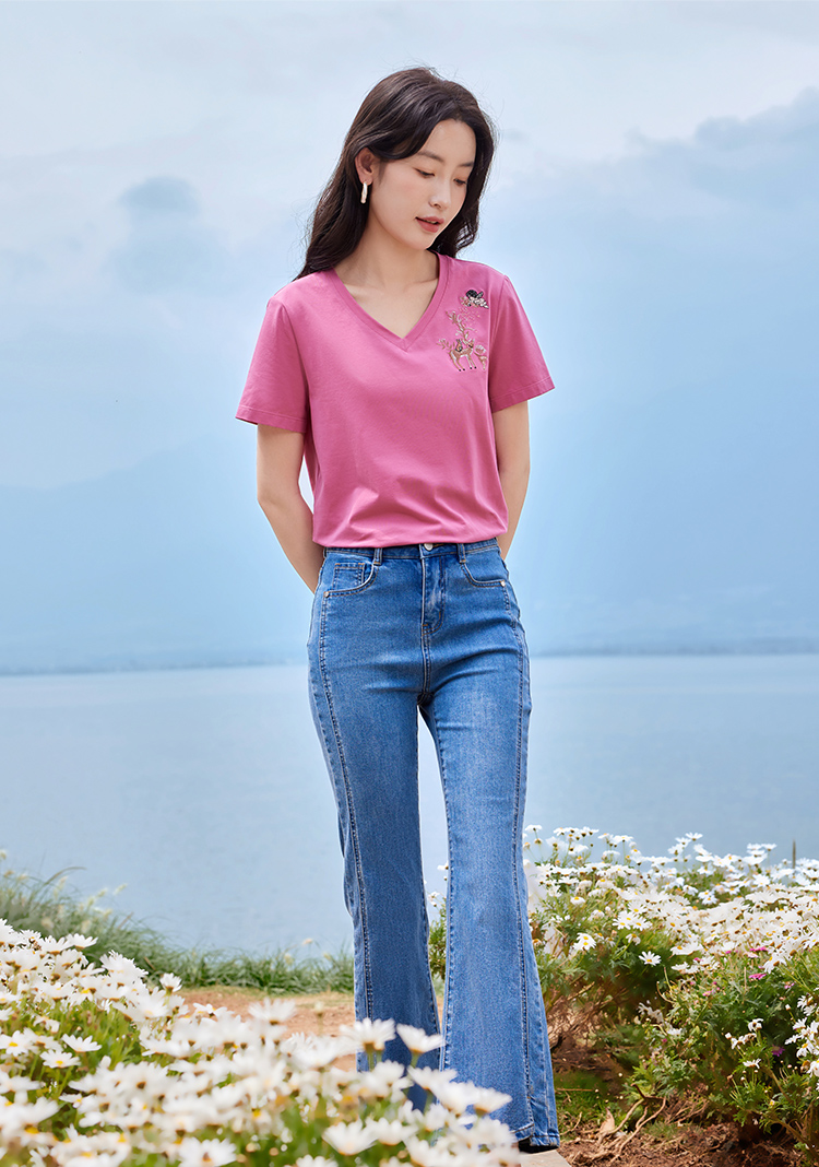 【专属特价】熙世界90%棉小鹿刺绣V领T恤女宽松显瘦减龄夏季新款中国风女大码短袖