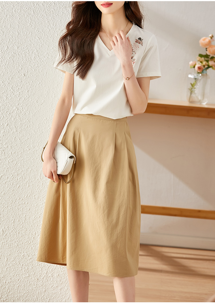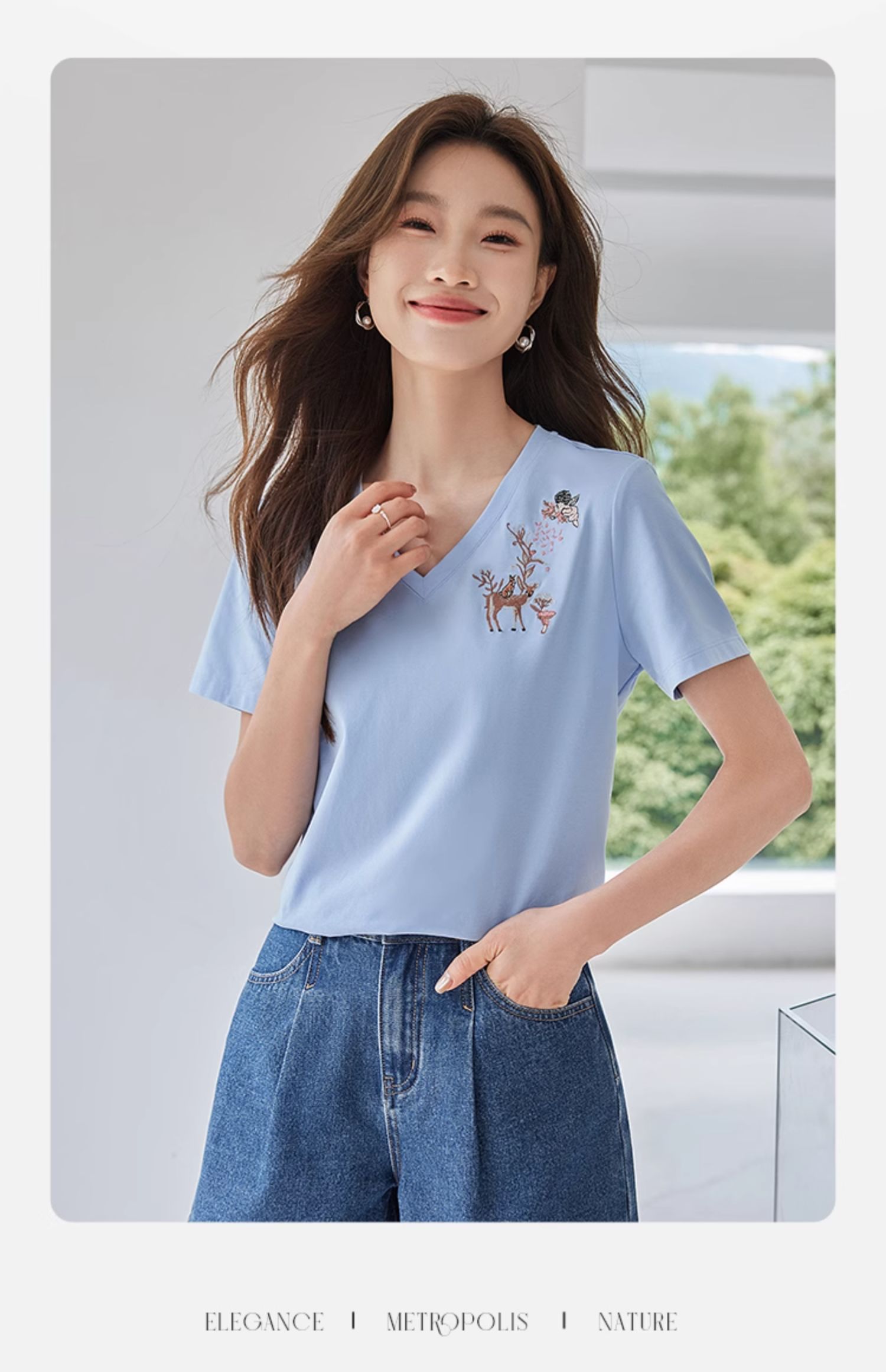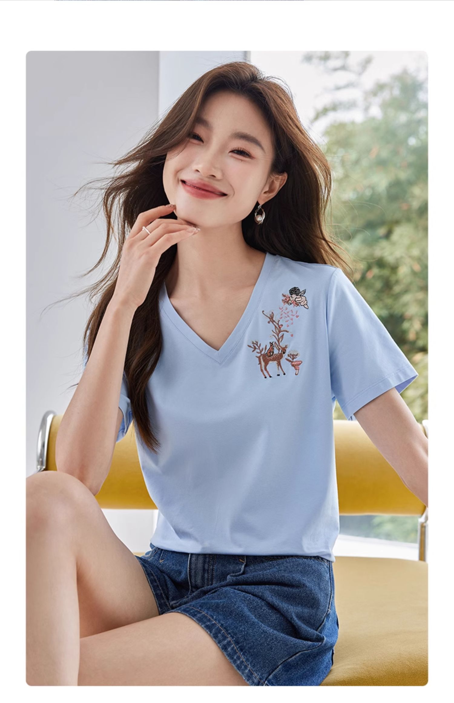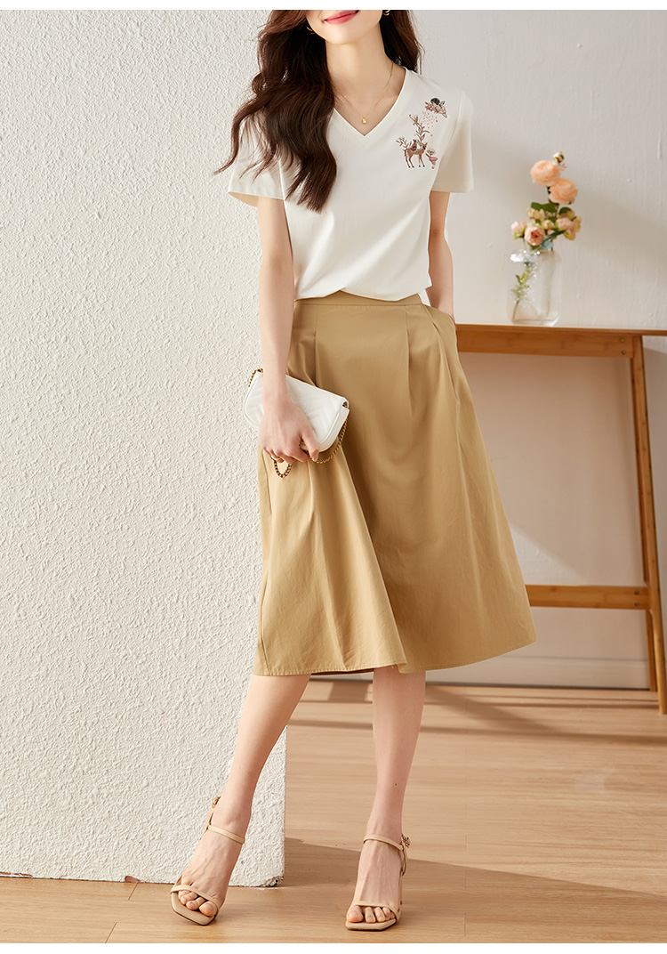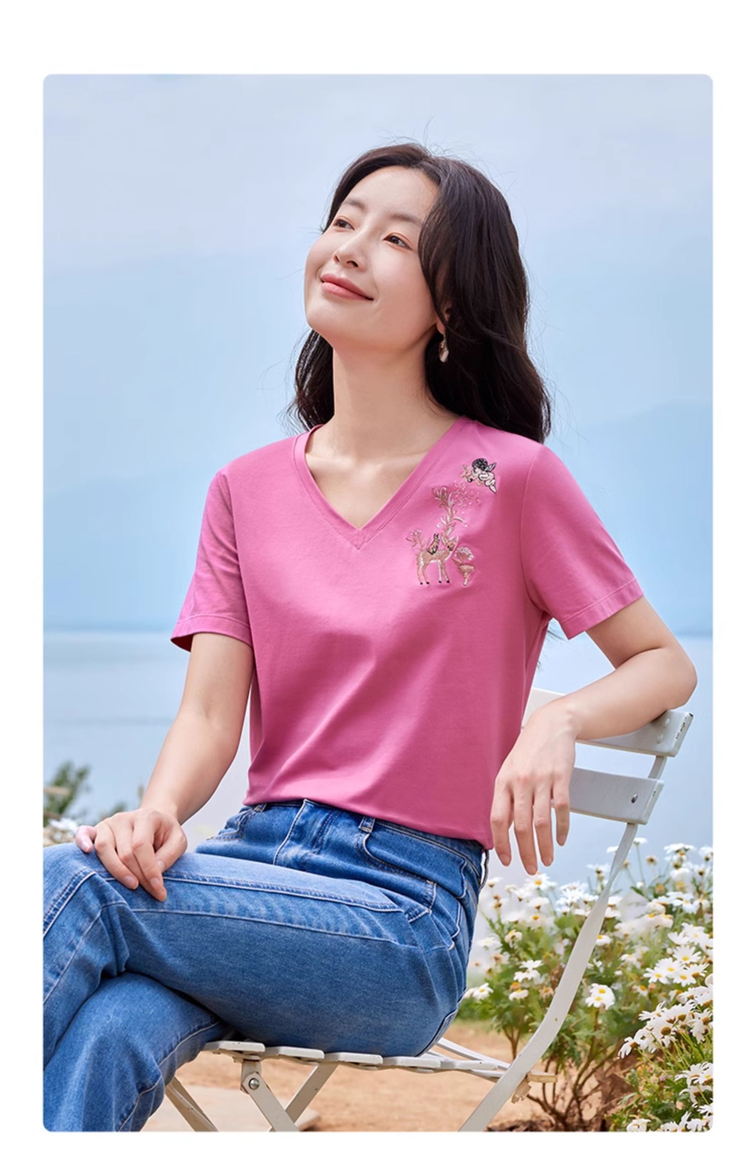【专属特价】熙世界90%棉小鹿刺绣V领T恤女宽松显瘦减龄夏季新款中国风女大码短袖